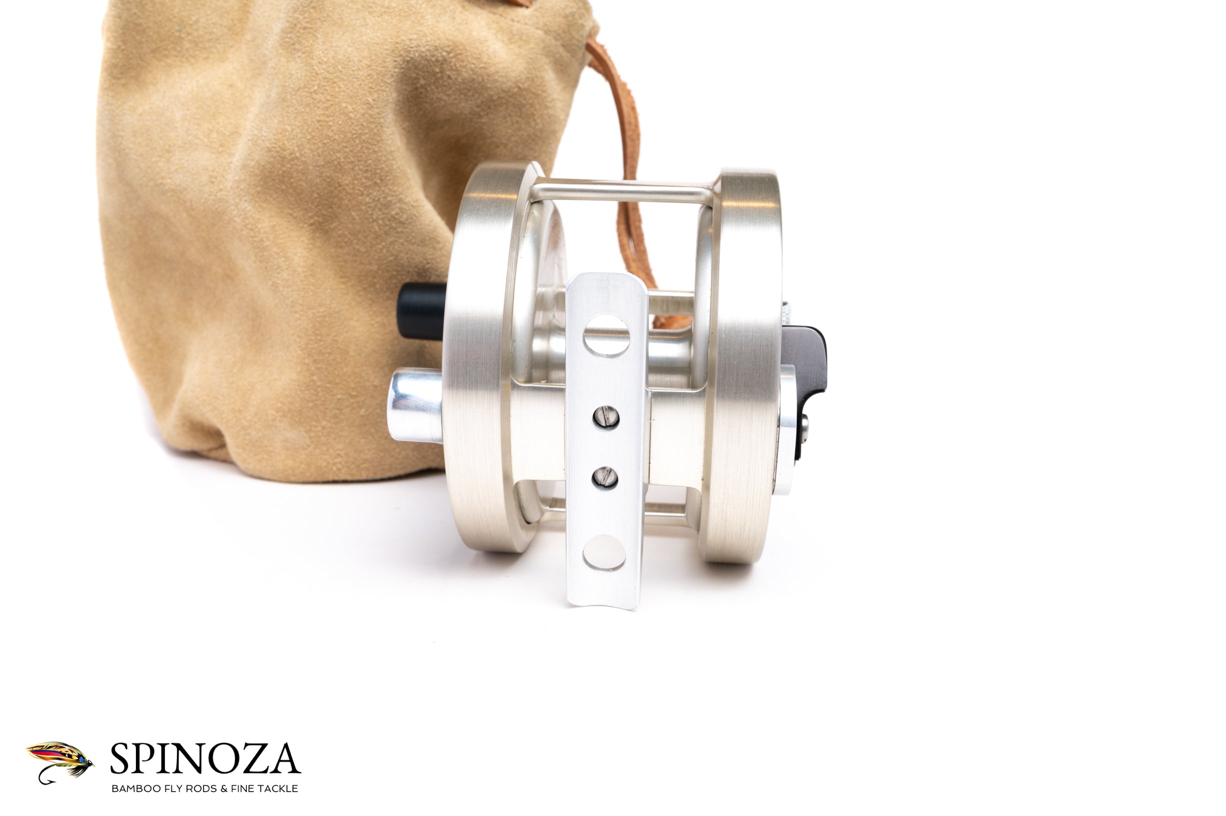 A Bogdan model 0 salmon reel, set up for LHW. 3 1/4" diameter with a 1 3/8" spool width. Capacity for holding a #9 line with 150 yards of backing. This was the singlehanded workhorse model in the Bogdan catalog. Near mint condition with just one faint mark on the frame edge and some tiny mounting marks on the foot being the only sign of use (there is also a residual circular patch of fading on one sideplate from where a line sticker must have been affixed at some point). I doubt the reel has been fished much, if at all. Silver anodized frame, foot, serpentine handle, oil port cover, poacher's knob, and Bogdan nameplate. Black sideplates. "No 0" is stamped into the side of the foot. Double action 2:1 retrieve and the famous Bogdan double brake design. The reel packs into a suede drawstring bag. It's getting very hard to find LHW Bogdans in this kind of superb condition.