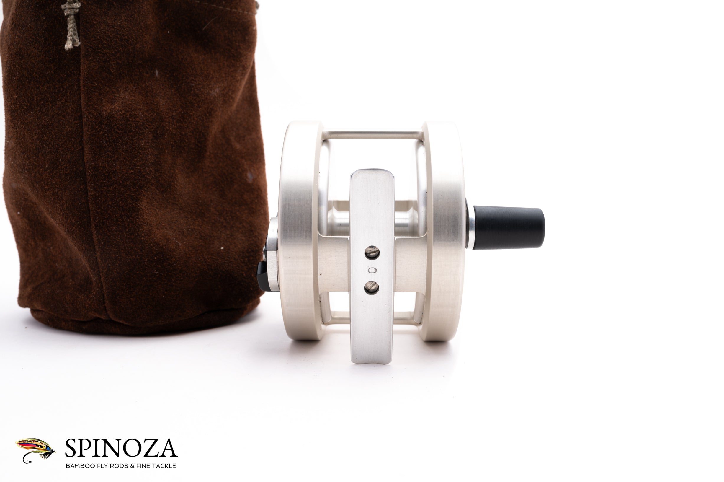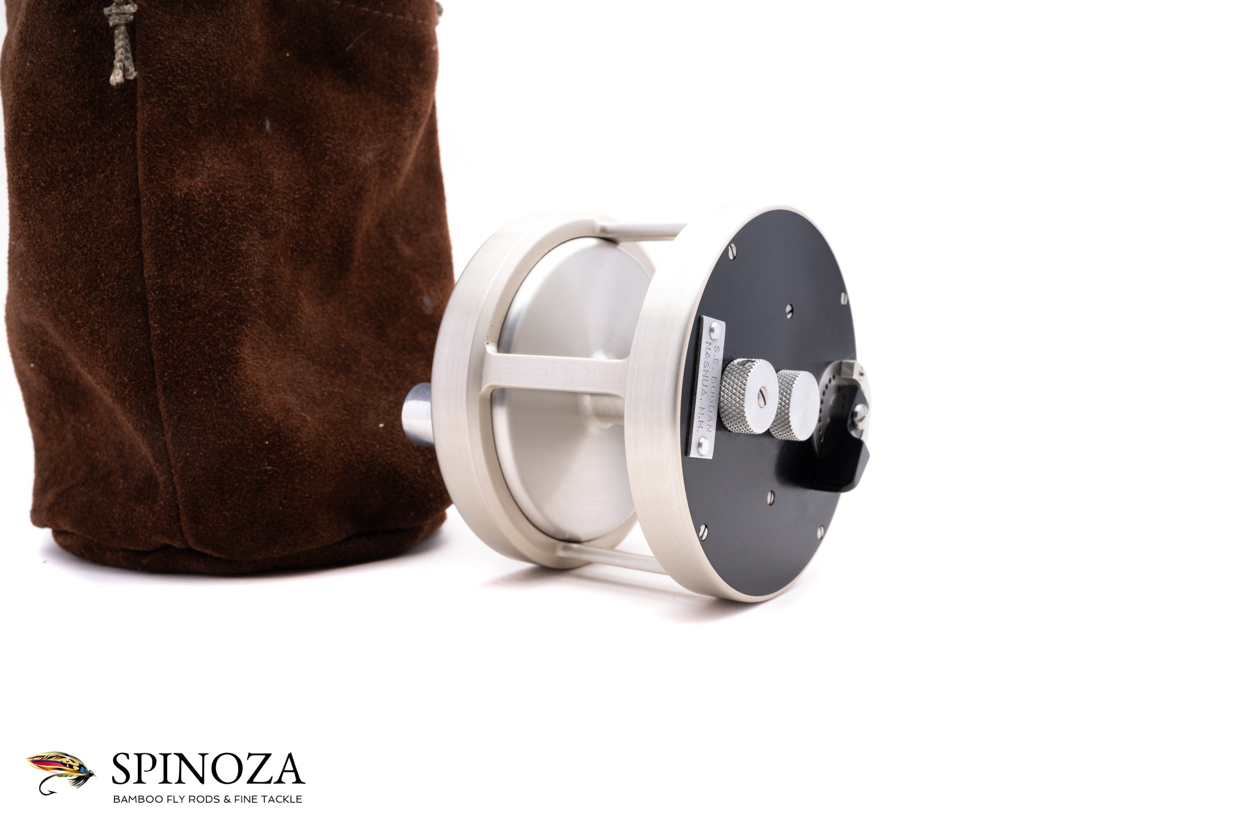 A Bogdan model 0 salmon reel, set up for RHW. 3 1/4" diameter with a 1 3/8" spool width. Capacity for holding a #9 line with 150 yards of backing. This was the singlehanded workhorse model in the Bogdan catalog. Mint, unused condition. The reel is pristine. Silver anodized frame and spool, with a clear anodized foot, serpentine handle, oil port cover, poacher's knob, and Bogdan nameplate. Black sideplates. Double action 2:1 retrieve and the famous Bogdan double brake design. The reel packs into the original brown suede drawstring pouch.