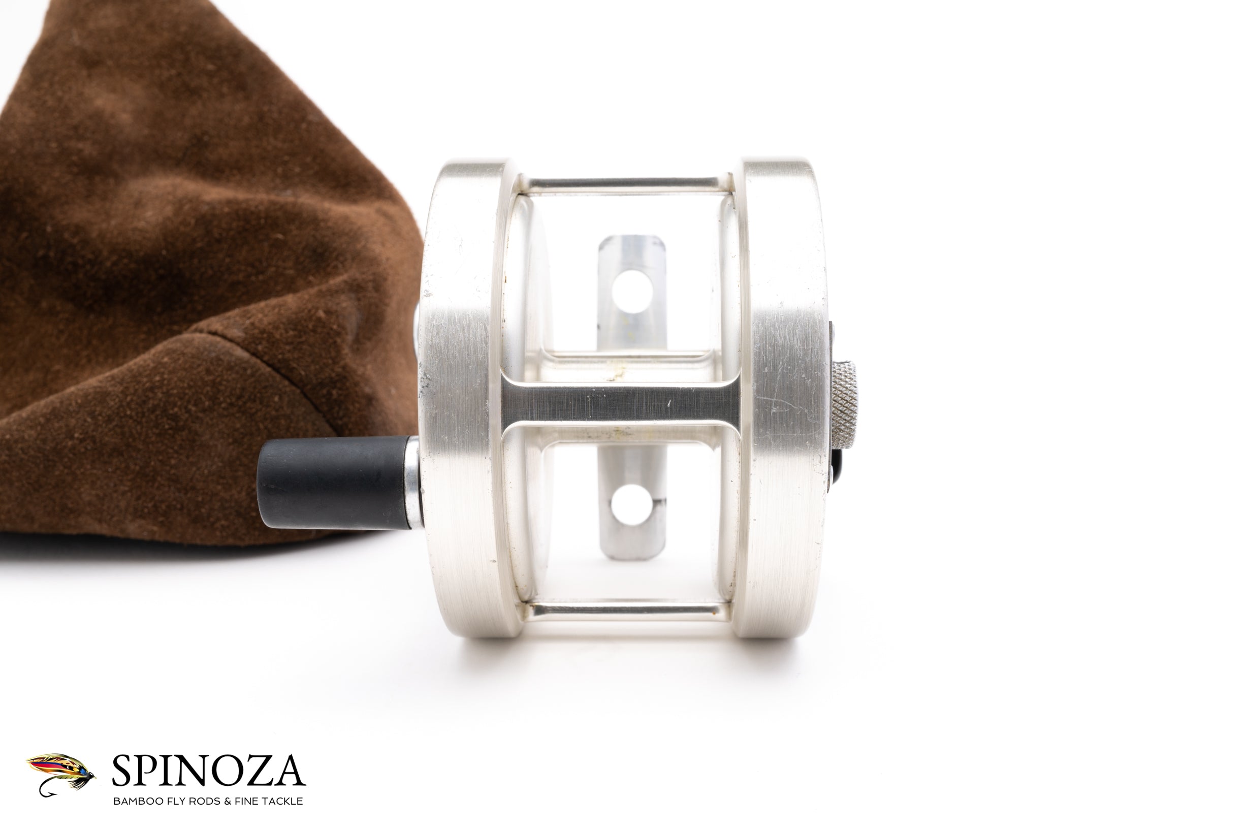 An excellent Bogdan model 0 salmon reel, set up for RHW. 3 1/4" diameter with a 1 3/8" spool width. Capacity for holding a #9 line with 150 yards of backing. This was the singlehanded workhorse model in the Bogdan catalog. Good used condition with some moderate rim rash on the frame and a few other minor marks here and there. There is some pitting on the inside of the spool. Pretty clean sideplates. Silver anodized frame, foot, serpentine handle, oil port cover, poacher's knob, and Bogdan nameplate. Black sideplates. "No 0" is stamped into the side of the foot. Double action 2:1 retrieve and the famous Bogdan double brake design. The reel packs into what looks to me to be an original suede drawstring bag.