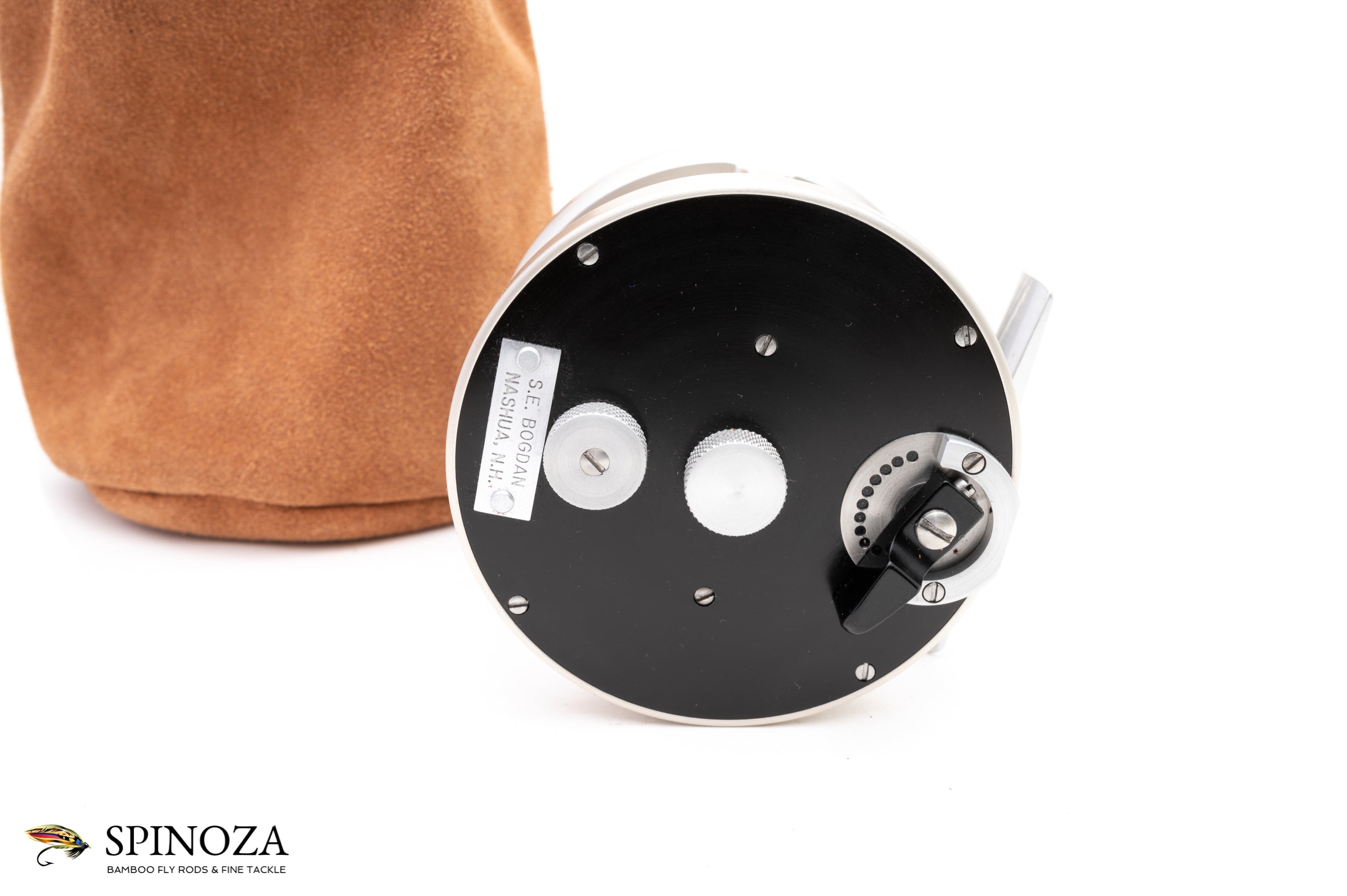 An excellent Bogdan model 0 salmon reel, set up for desirable LHW. 3 1/4" diameter with a 1 3/8" spool width. Capacity for holding a #9 line with 150 yards of backing. This was the singlehanded workhorse model in the Bogdan catalog. Mint, unused condition. Silver anodized frame, foot, serpentine handle, oil port cover, poacher's knob, and Bogdan nameplate. Black sideplates. "0" is stamped into the underside of the foot. Double action 2:1 retrieve and the famous Bogdan double brake design. Comes in an original drawstring leather pouch with the original hangtag and printed care instructions inside. Finding mint Bogdans is getting harder as is finding them in LHW and this fine reel is both!