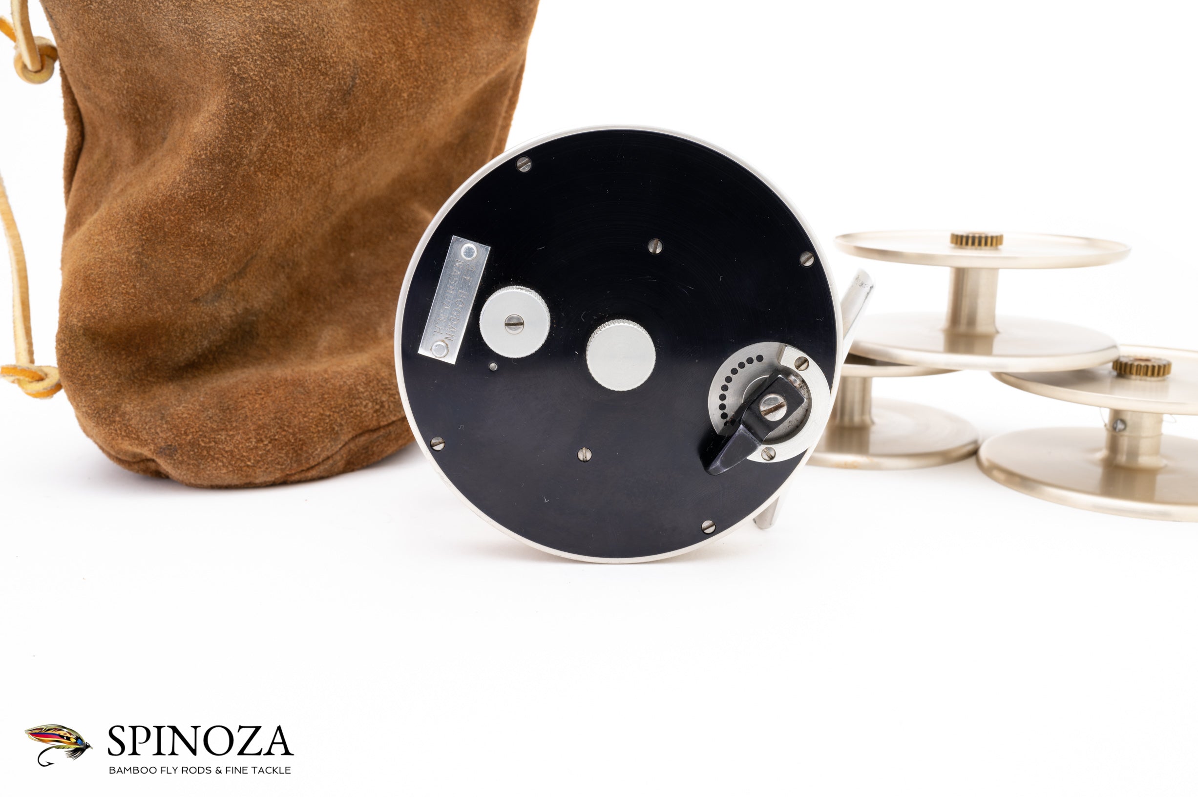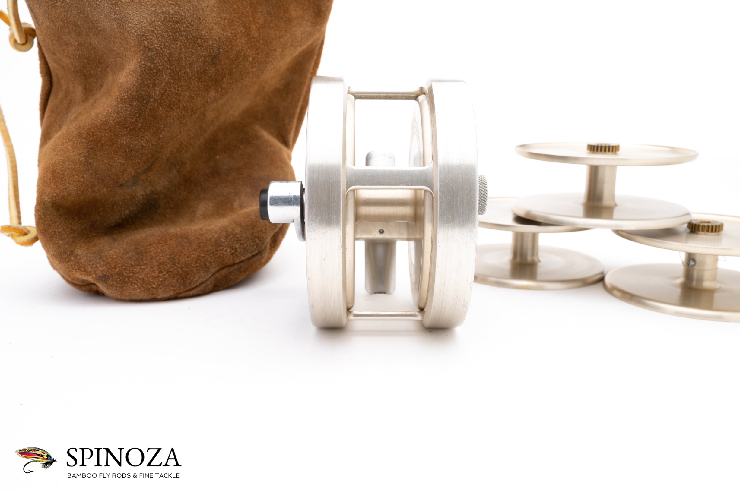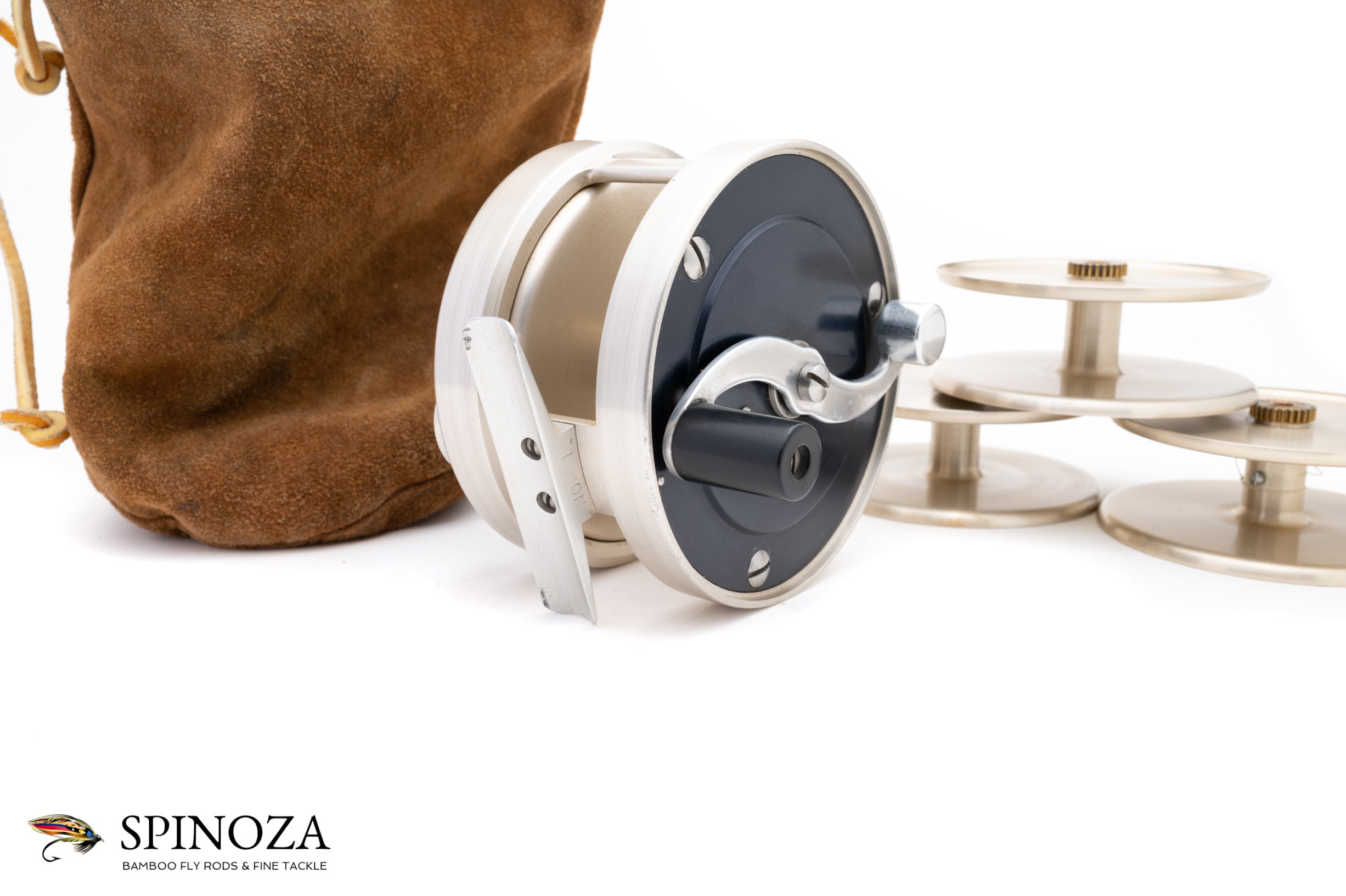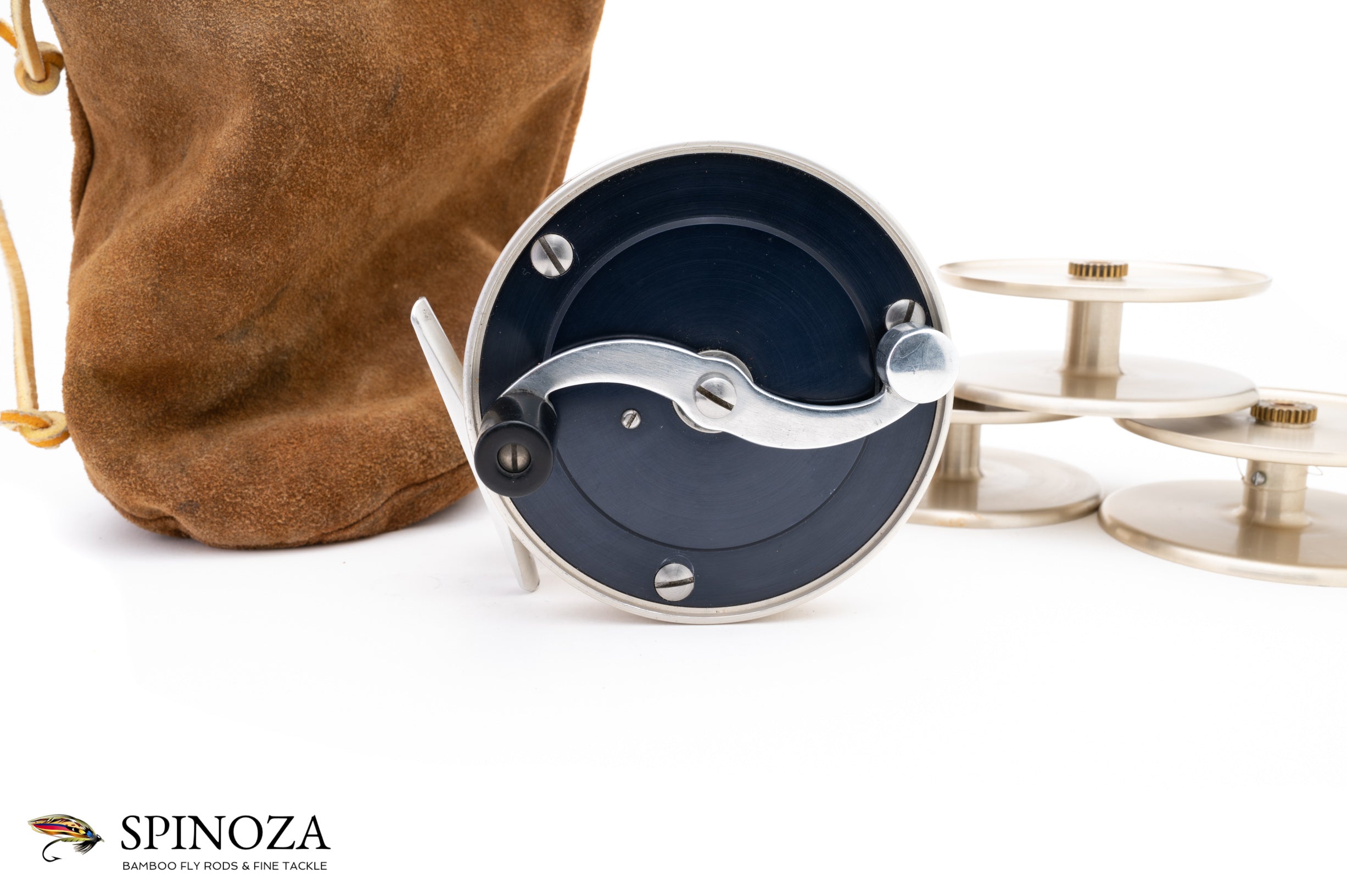 A very nice Bogdan Model 1 salmon reel fly reel with three spare spools in excellent used condition. 3 3/4" diameter with a spool width of 1 3/16". RHW. There is some minor rim rash in one area on the frame edges, some mounting marks on the foot, and some very tiny marks near the takeapart screws, but the reel is very clean otherwise and has been well cared for. Champagne frame with black sideplates and clear anodized handle, oil port cover, poacher's knob, and the Bogdan nameplate. Perfect mechanically, as you would expect, with the revered Bogdan brake drag and a 2:1 multiplying retrieve. The spare spools appear to be very lightly used, if at all (one has a very slight cosmetic ding on the edge if you really look closely for it). The reel comes in the original Bogdan suede bag. A very nice model here for your mid to larger spey rod with some handy spare spools into the bargain.