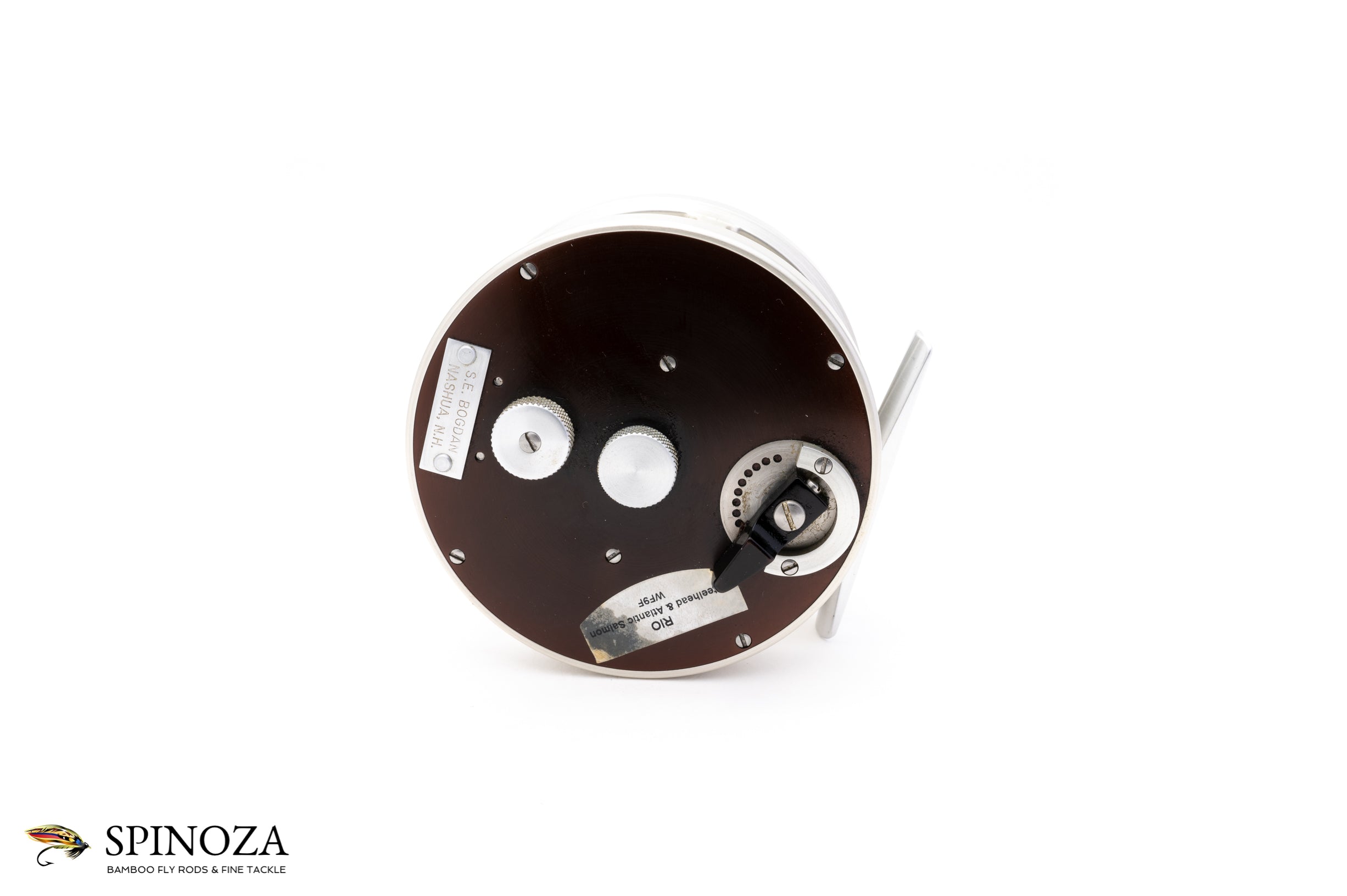 A superb Bogdan Model 100 light salmon reel, 3 1/2" diameter with a 1 5/32" spool width. Set up for desirable LHW. Near mint condition. It has had a line on it based on the line sticker on the faceplate and a tiny bit of residue on the spool, but I couldn't really find any signs of wear on the reel itself. Silver frame, foot, handle, oil port cover, poacher's knob, and Bogdan nameplate. Black sideplates. The faceplate side has a slight coppery undertone to it when looked at in a certain light, which you sometimes see on Bogdans. "100" stamped on the underside of the foot. 2:1 multiplier with the revered Bogdan double pad brake system. A fantastic size for your small spey or switch rod and in a very hard-to-find LHW!