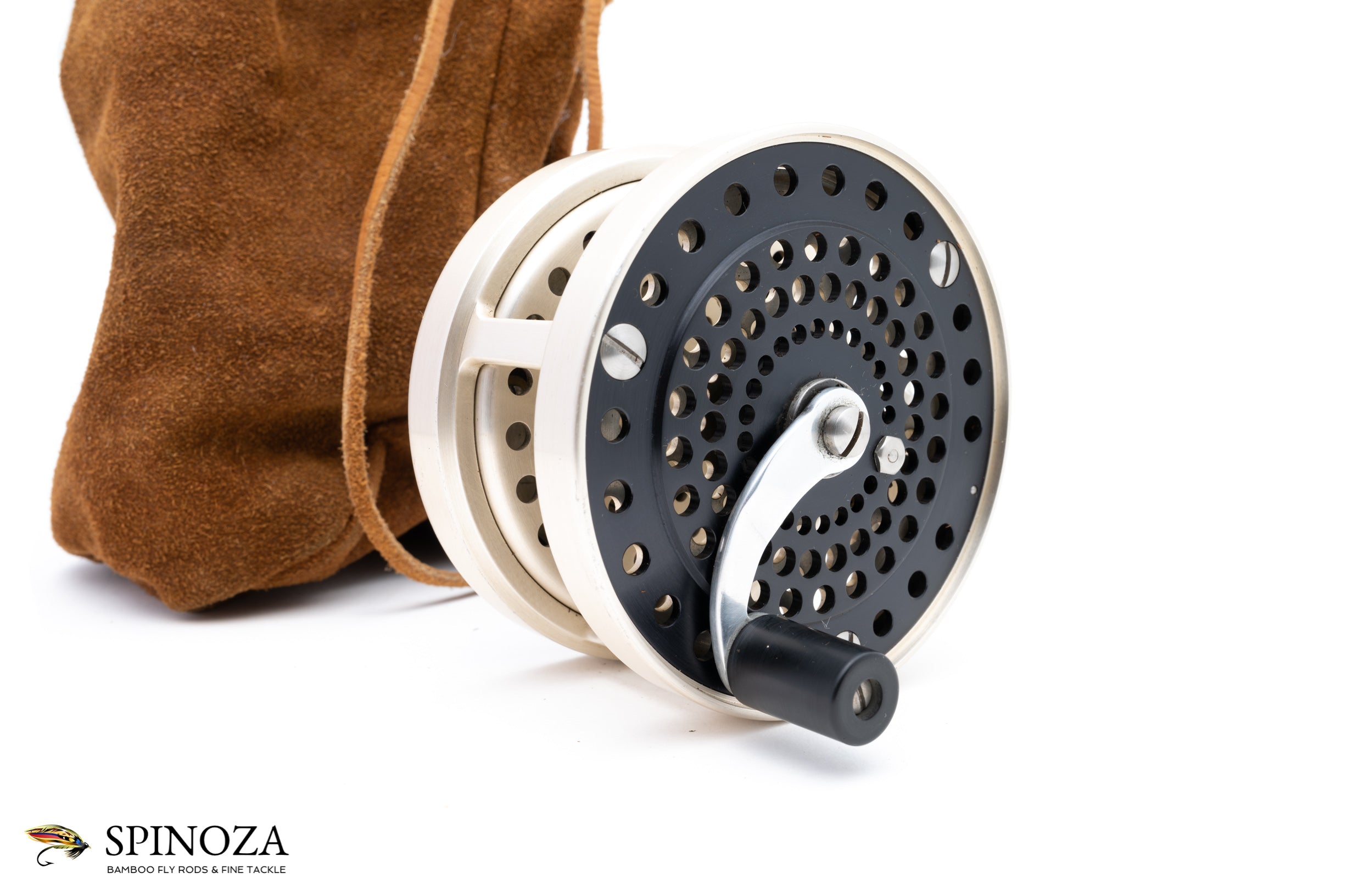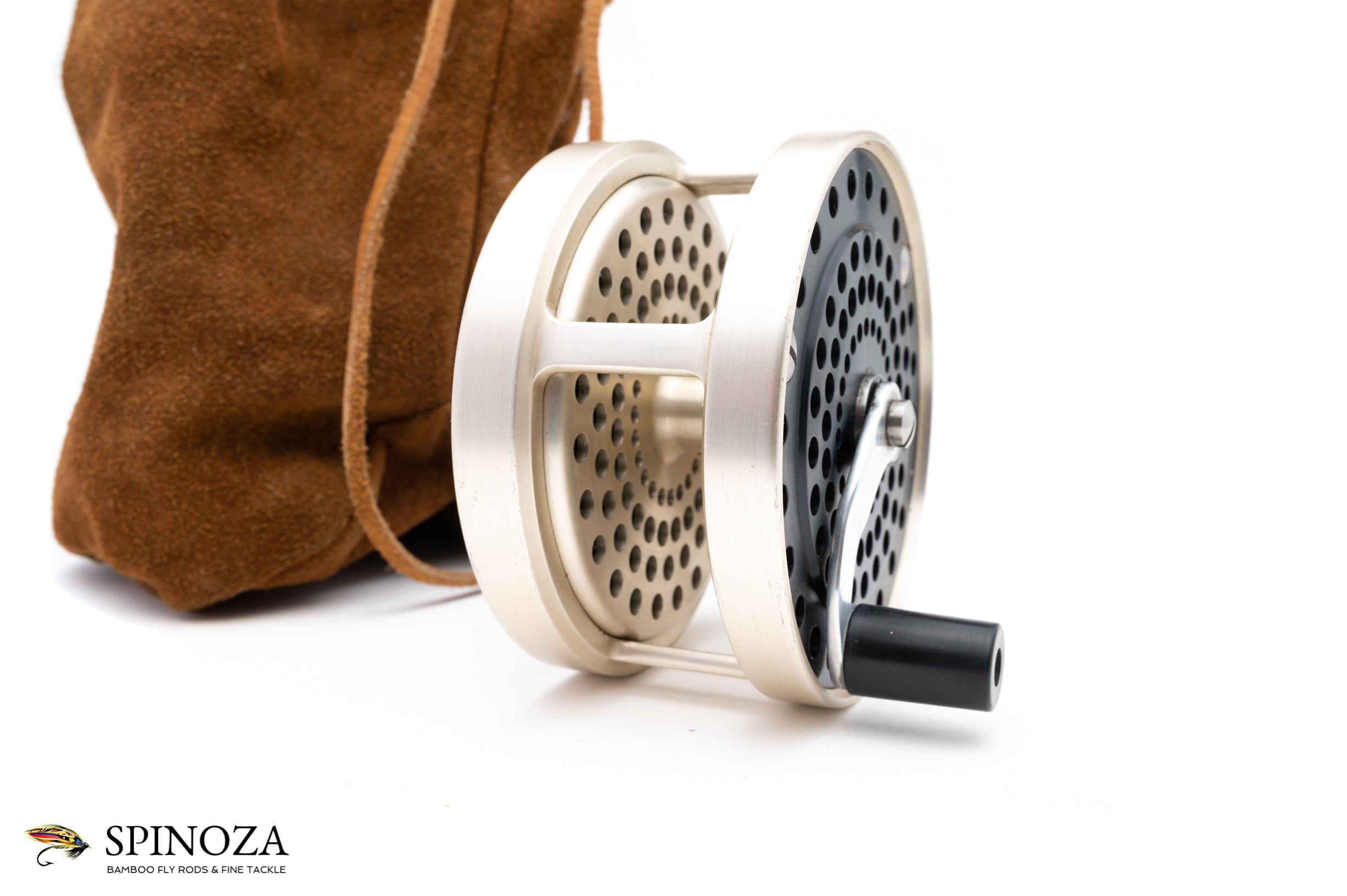 An unusual Bogdan Model 200 salmon reel, 3 3/4" diameter and set up for LHW. I've come across very few model 200's outside of the earlier gold models, and this one was likely a special custom order from Stan, boasting a half-handle and with substantial porting on both the sideplates and each side of the spool. Excellent plus condition with just the tiniest hint of rash on the rims and some brassing to the drag adjuster. Very clean throughout. The reel weighs 10.7 ounces and the spool width is .84". Multiplier retrieve. Black sideplates and the frame and spool are done in the light champagne color. Silver anodized foot, oil port cover, poacher's knob, and Bogdan nameplate. This would be a nice option for someone who wants to fish a larger Bogdan but cut back slightly on the weight (and if the half handle isn't your thing, I'd imagine you could have it replaced or swapped). It's also getting very hard to find larger Bogdans in LHW. Comes in the original Bogdan brown suede bag.
