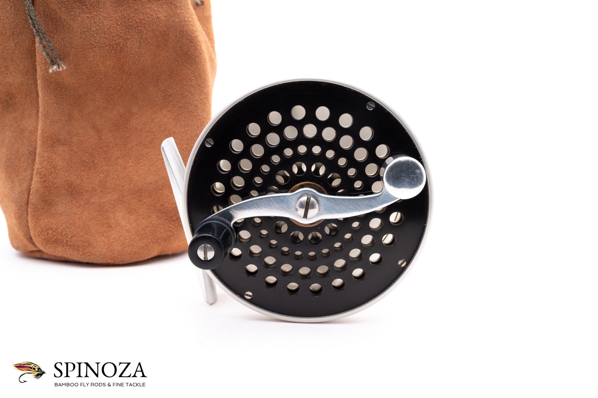 A nice Bogdan Model 50 light salmon reel, set up for RHW. 3 1/2" in diameter with a 1 5/32" spool width. Weighs 9 ounces on my scale. Excellent lightly used condition with one ding and a second minor imperfection on the frame edge, but that's about it. The reel is very clean otherwise with no mounting marks on the foot or brassing to the drag lever (a common indication of use). Clear silver anodized frame, serpentine handle and counterbalance, oil cap, poacher's knob, nameplate, and foot. The sideplates and drag selector knob are black anodized. The frontplate is ventilated to reduce weight. "50" is stamped on the underside of the foot. Single action retrieve. The reel comes in the original Bogdan leather suede drawstring bag. This reel is a fantastic size for switch or small spey rods.