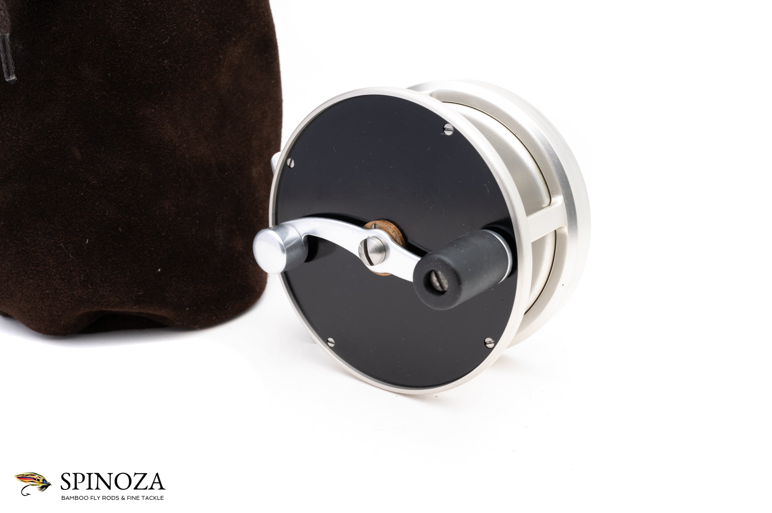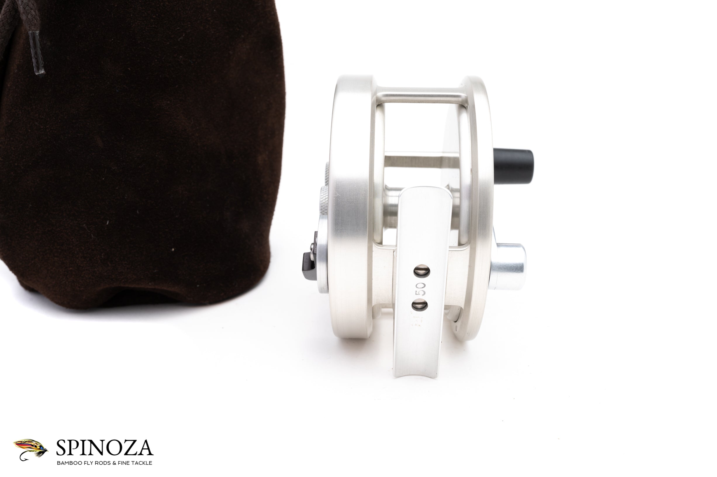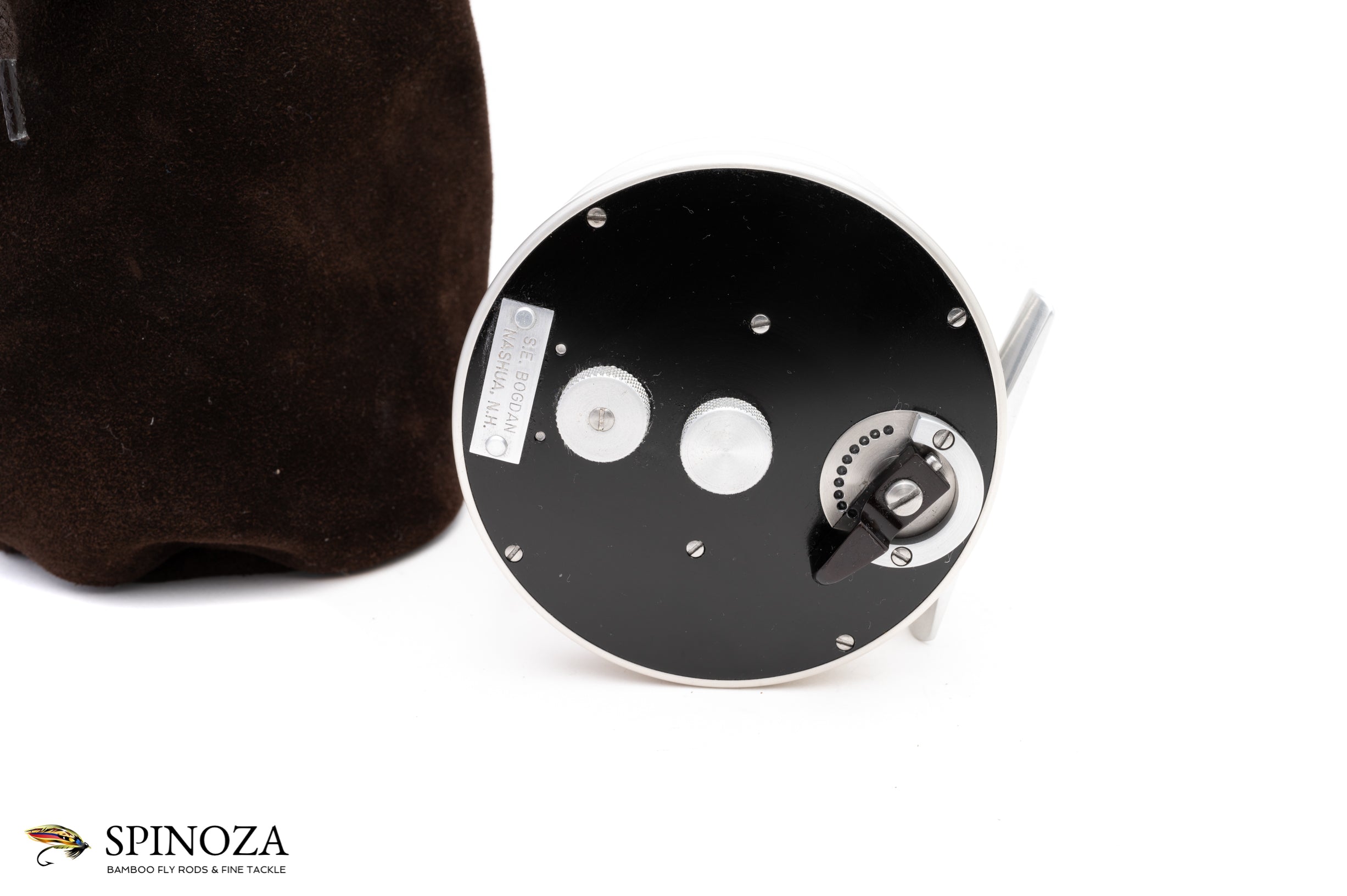 An exquisite Bogdan Model 50 light salmon reel, set up for LHW. 3 1/2" in diameter with a 1 5/32" spool width. Weighs 9.2 ounces on my scale. Mint condition and it even comes in the original plastic liner inside the leather pouch. Silver anodized spool, frame, serpentine handle and counterbalance, oil cap, poacher's knob, nameplate, and foot. "50" stamped on the underside of the foot. Side plates and drag selector knob are black anodized. The handle sideplate is non-ported unlike many others I've seen. Single action. The reel comes in the original Bogdan leather suede drawstring bag. This reel is a fantastic size for switch or small spey rods and you won't find many of them in LHW in this kind of mint unused condition!