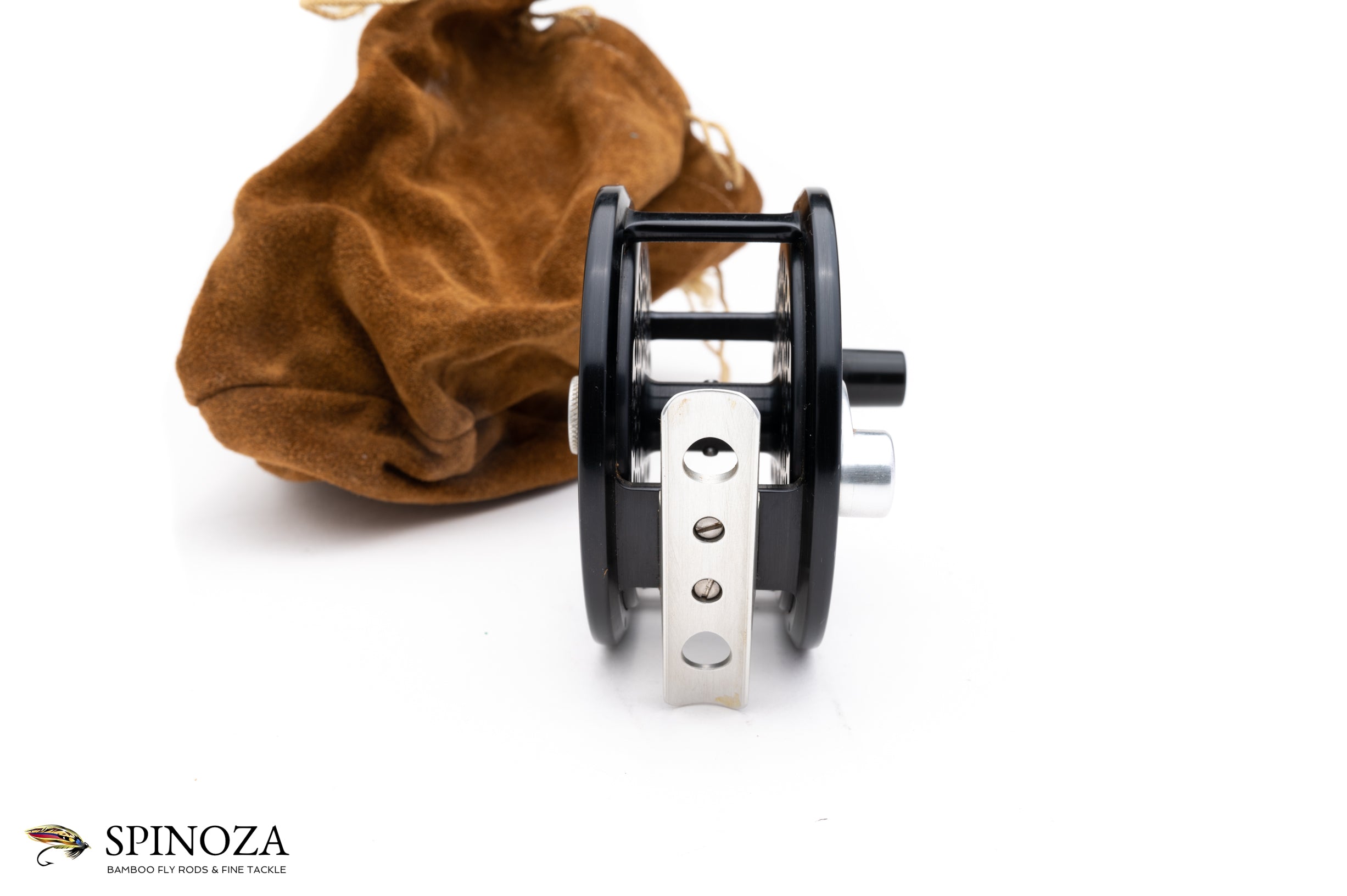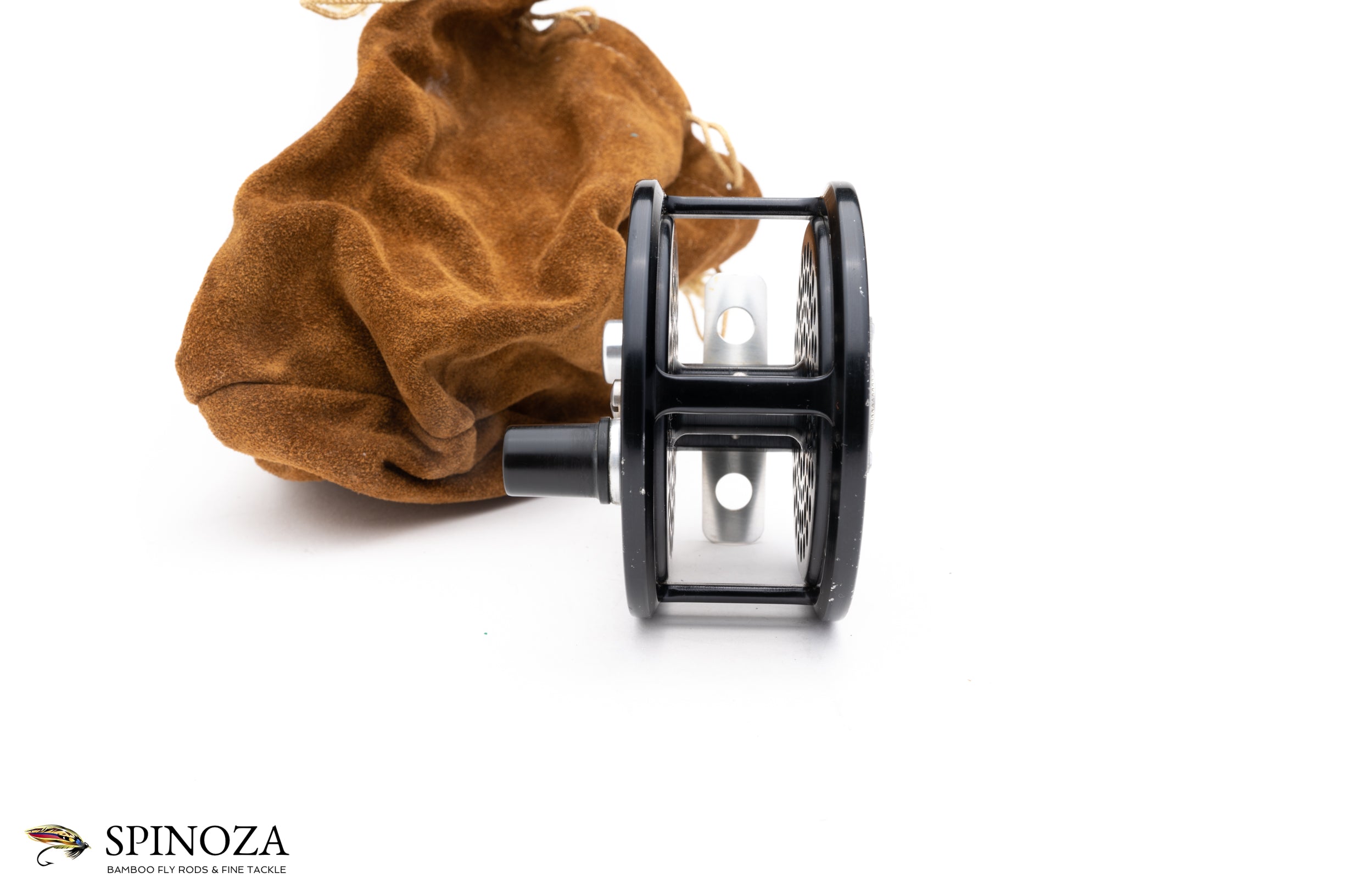 A nice Bogdan steelhead reel, set up for RHW. This is the standard steelhead size, with a 3 1/4" diameter and 1 5/32" spool width. Weighs 5.5 ounces on my scale. Good used condition with some moderate rim rash to the frame edges and a few small scratches to one sideplate. The other and the rest of the reel is in great shape. Black anodized frame, sideplates, and spool. Silver foot, oil port cover, crank handle, and Bogdan nameplate. The sideplate on the crank side is ventilated and the spool is ventilated on both. Fixed click-and-pawl drag. These desirable models were made at the urging of west coast anglers who wanted a lighter model for chasing steelhead in the pacific northwest. Comes in an original dark brown suede Bogdan bag. Another model that's very hard to find especially in the all-black color.