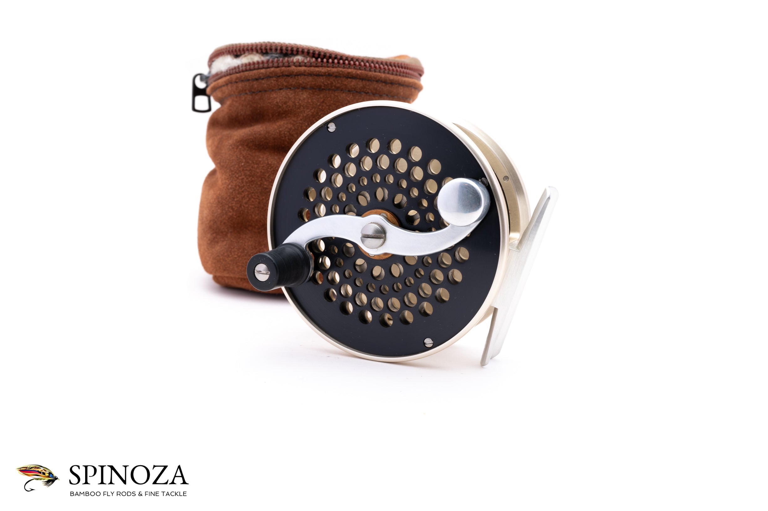 A nice Bogdan trout reel, 3 1/4" in diameter with the narrower 3/4" spool width and set up for RHW. Weighs 5.4 ounces. Mint, unused condition. Champagne anodized frame and spool, with a silver anodized foot, serpentine handle, oil cap, and Bogdan nameplate. Black anodized sideplates. The spool and sideplate on the cranking side are both ventilated. Pleasing, fixed click drag. The reel packs into a brown suede zipper pouch.