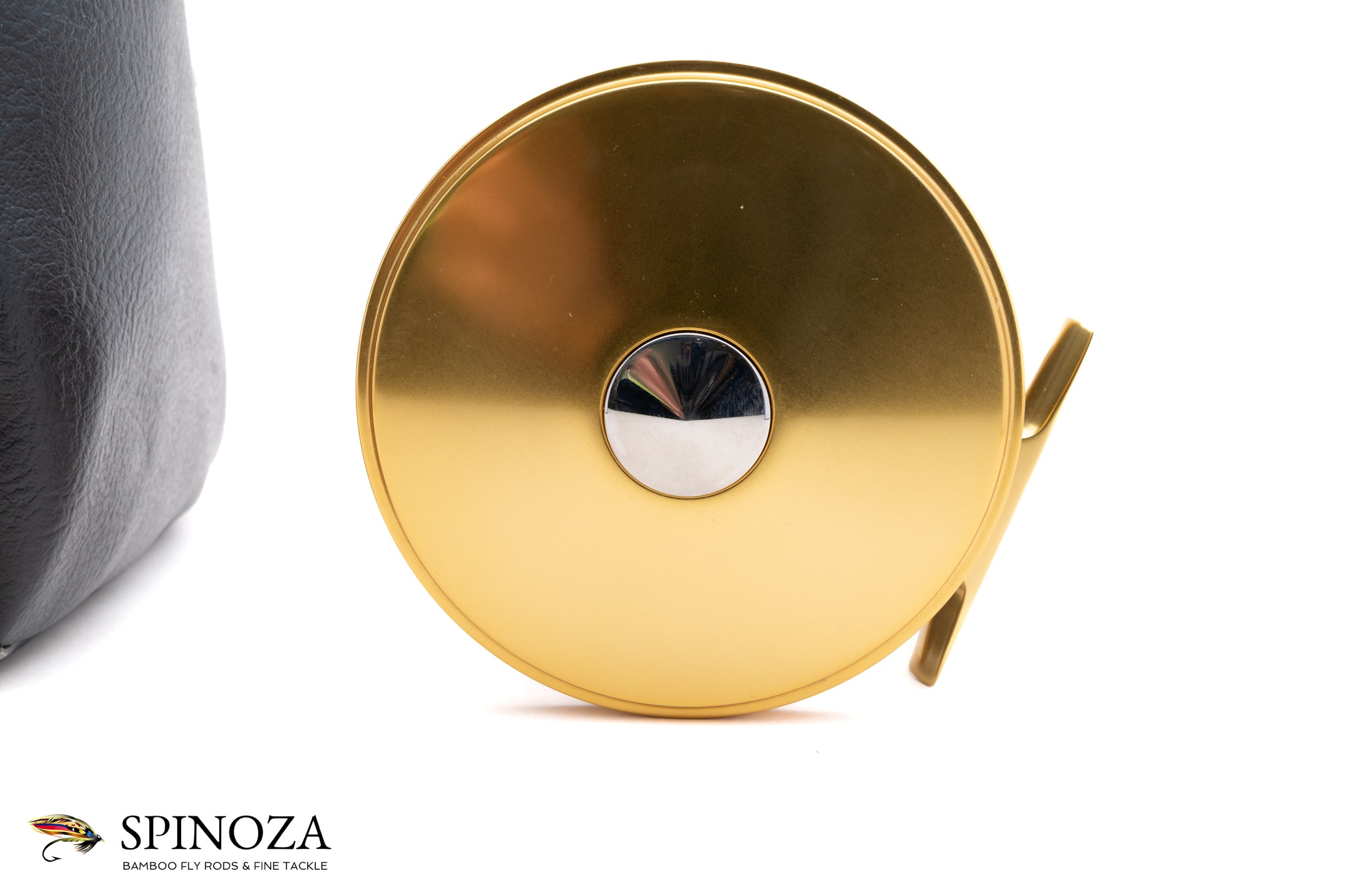 A very nice Seamaster Mark III dual mode fly reel, with a 3 29/32" diameter and set up for RHW. The spool width is approximately 1 3/16". One piece frame, third generation reel. Mint unfished condition. Lustrous gold anodized frame with a black anodized spool. Powerful adjustable drag. Comes in the original faux leather black drawstring pouch with original paperwork inside. A great example of this saltwater classic.