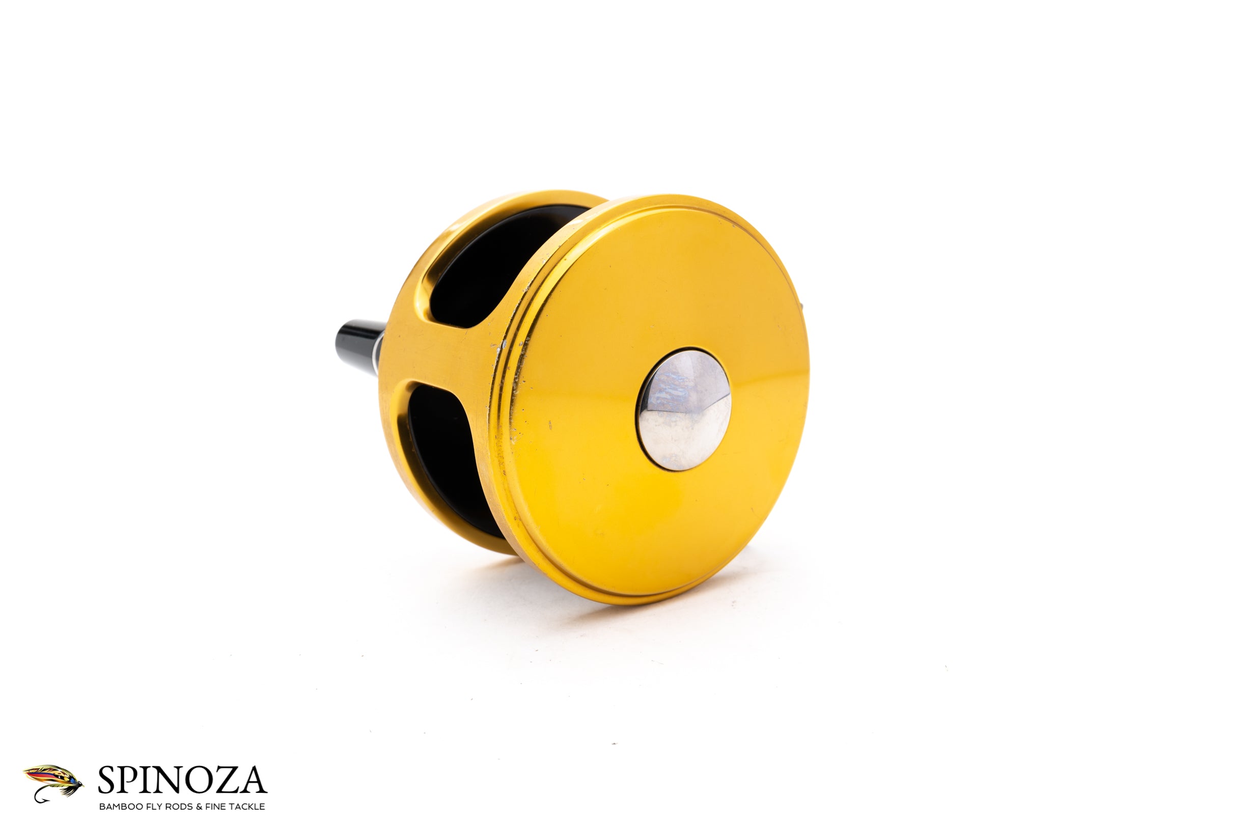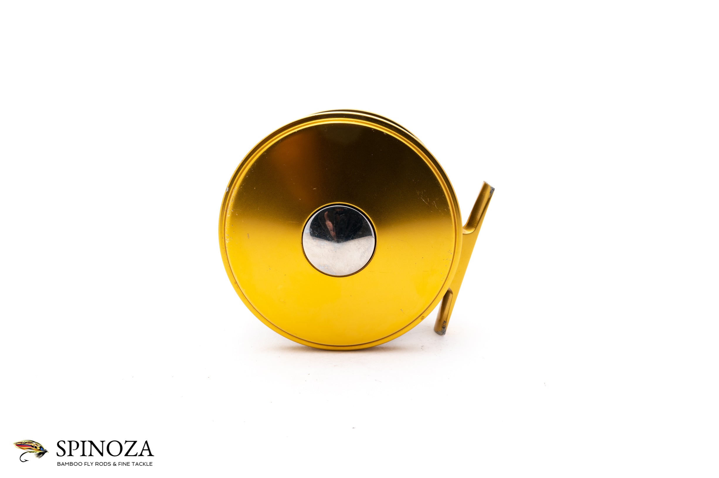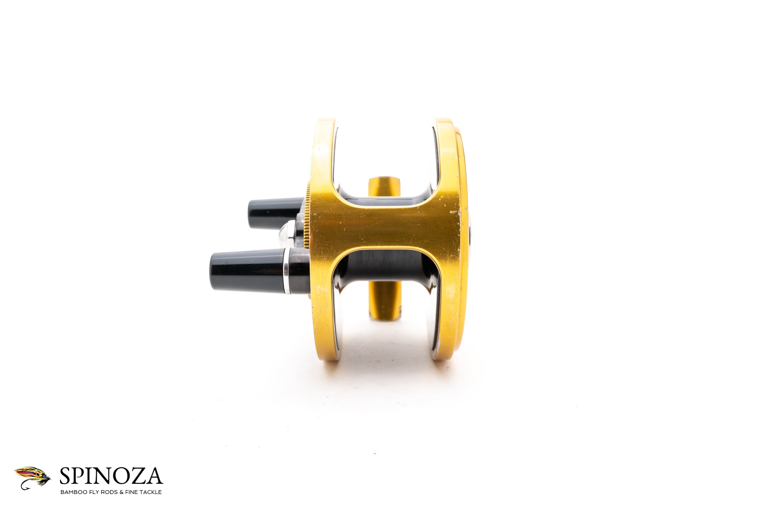 A nice Seamaster Mark II anti-reverse fly reel, with a 3 1/8" diameter. RHW. The spool width is approximately 1 1/4". One piece frame. Very good used condition with some minor rim rash in various places and one small scrape to the inner frame edge in one place. Lustrous gold anodized frame with a black anodized spool. Powerful adjustable drag, whose adjuster sports the famous "Seamaster" logotype as well as "Mark II". No pouch.