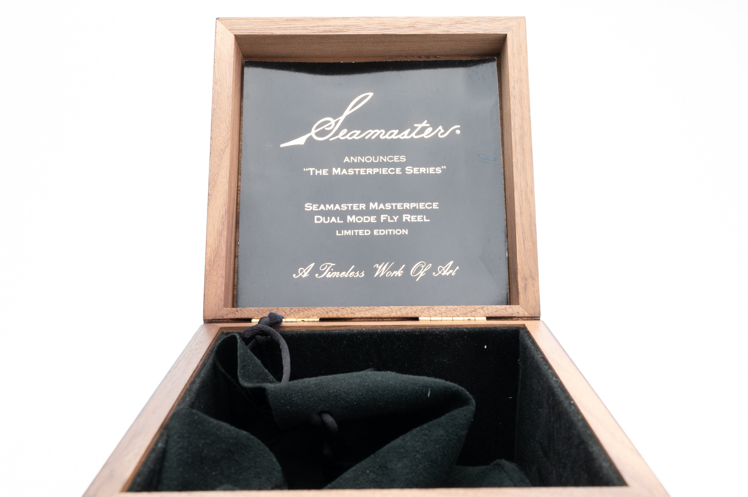 A very nice Seamaster Dual Mode Mark III fly reel from their Masterpiece Series, a limited production run of 250 reels. RHW. The diameter is 3 29/32" with a spool width of 1 3/16". Weighs 13.95 oz. Embellished with fine Spanish scroll work circling the spool. With the unique dual-mode drag system you have Direct Drive and Anti-Reverse all in one reel. The reel is flawless and unused. Comes in a custom walnut box and black velveteen slip bag. The all-blue anodized versions are extremely difficult to locate on the resale market. Line capacity is 300 yards of 30lb backing and up to a WF #12F line. A very nice reel here.