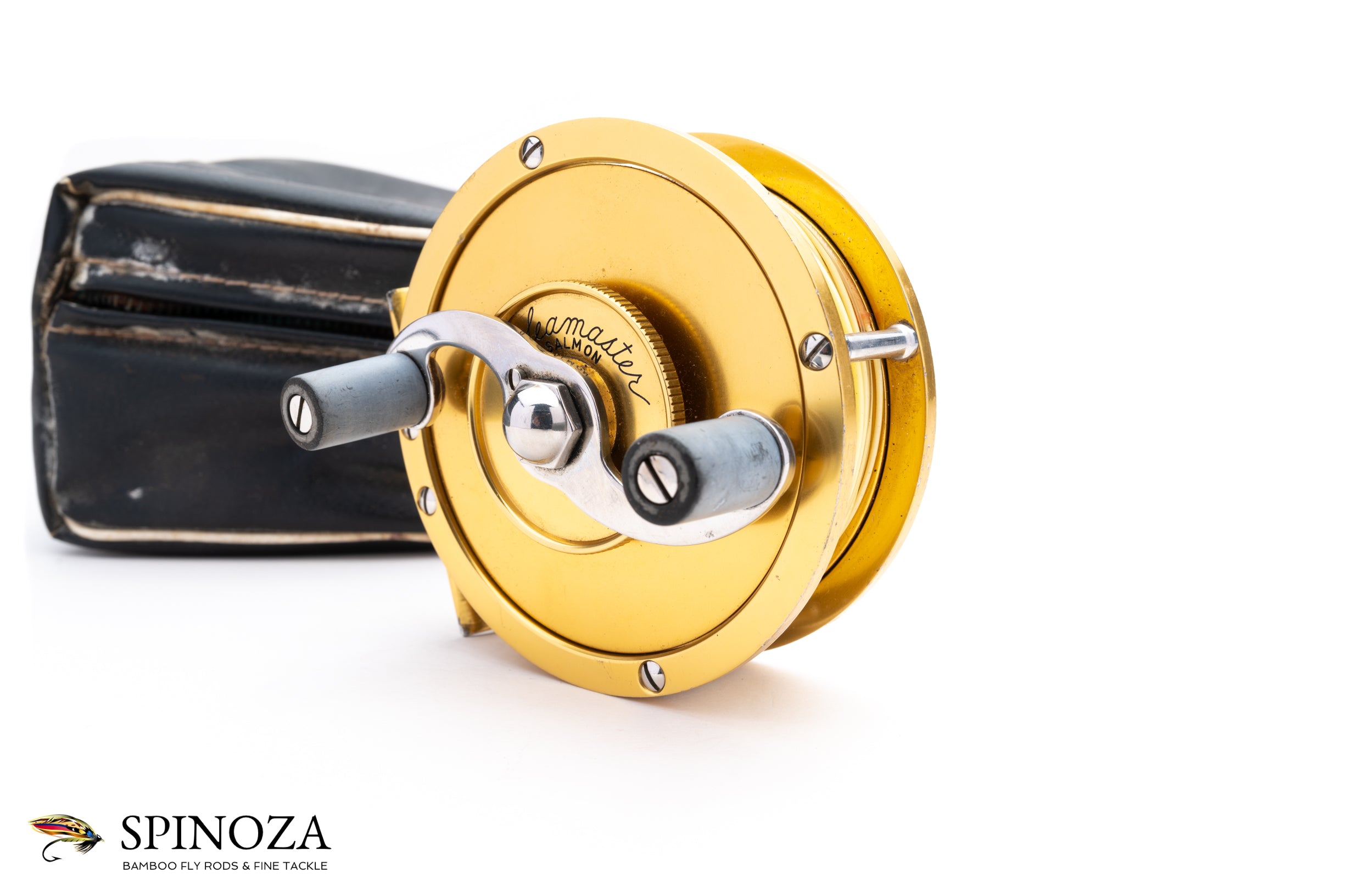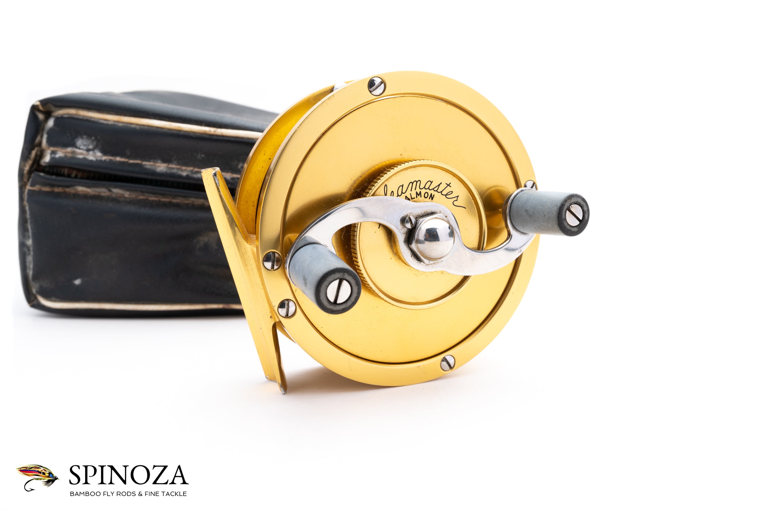 A Seamaster Salmon model anti-reverse reel, set up for RHW. 3 1/2" diameter with bolstered stainless steel pillars. The spool width is 7/8". Good used condition with some rim rash and cosmetic wear from honest use. The handle also appears to have a little bit of twist to it, though it functions just fine. All gold anodized in the classic Seamaster color. Mechanically the reel is sounds with a satisfying click and strong drag. It comes in the original black faux leather pouch with the original paperwork tucked inside.