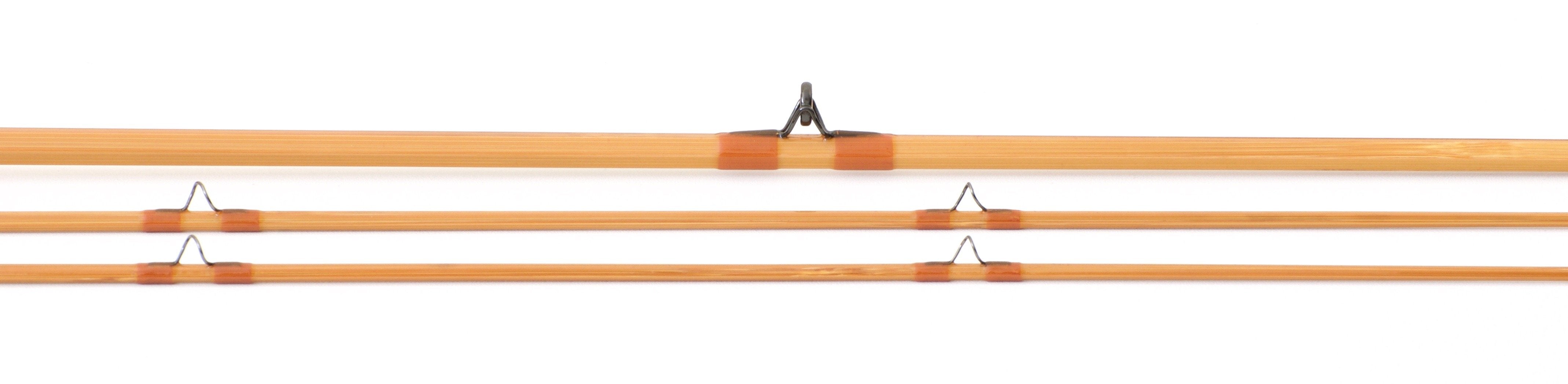 Straw colored cane with honey-colored wraps and burgundy tipping at the winding check, signature wrap, ferrules, and tip-tops. Tortoiseshell agate stripping guide. Blued guides. Rope pattern ring hook keeper. Handsome bamboo winding check. Reverse half wells grip 6 1/4" in length with only the lightest of handling marks. Elegant bright nickel silver cap and ring reel seat over a mortised maple spacer. "SR" is engraved on the bottom of the butt cap. The step-down ferrules are size 11/64 with an excellent fit. The rod weighs 3.35 oz. The superb dry-fly action is on the faster side of medium-fast, smooth and very light in the hand. A terrific rod for those smaller creeks. Includes original bag and original tube with Sweetgrass logo. Don't pass up this rod from the team of master builders at Sweetgrass Rod Co.