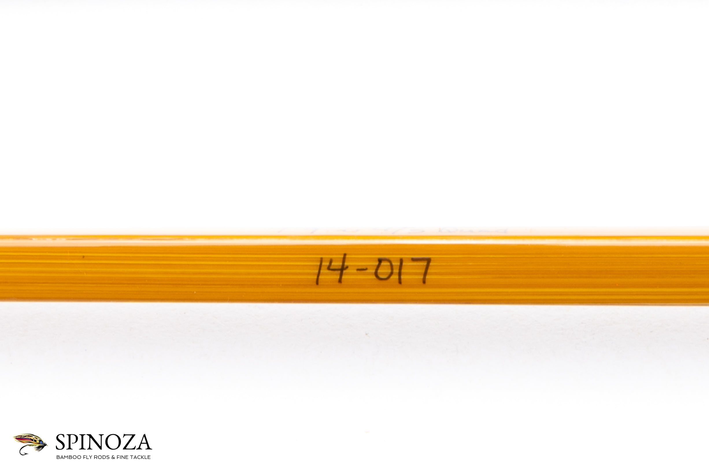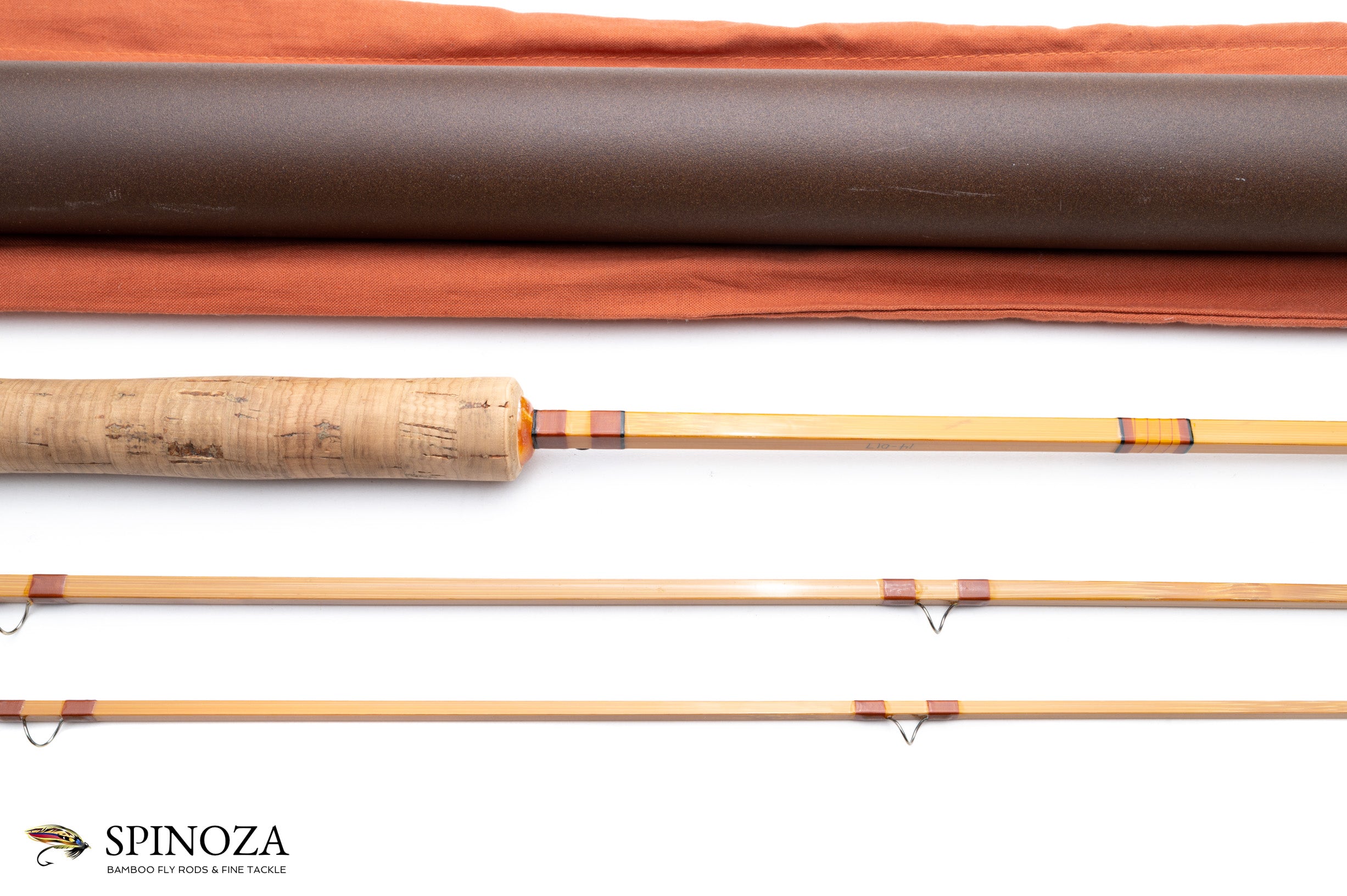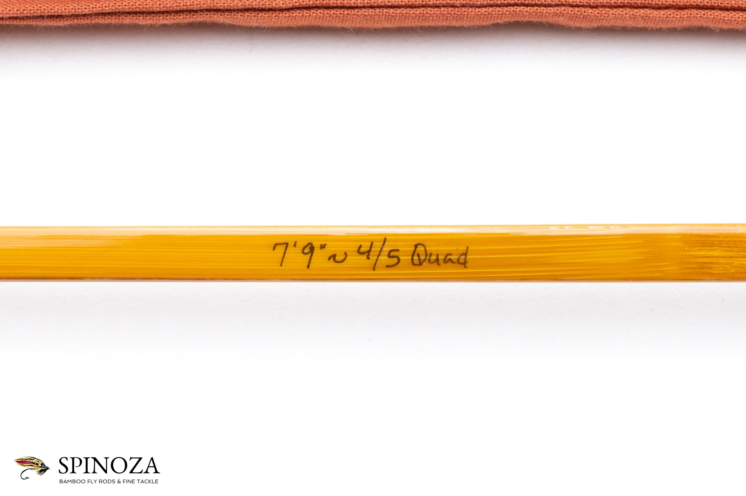 A Sweetgrass Mantra model quad bamboo fly rod, 7'9", 3-piece, 1-tip, and built for a #4/5 line. Serial #14-017. Made as a one-tip rod. Lightly used condition. Medium semi parabolic action. The cane is tempered to a light wheatstraw color and the node pattern is two opposed. The varnished butt shows some glue seams but they are not open and do not affect the working quality of the rod. The wraps are copper brown with black edges at the ferrules and tip tops. The mid has a slight downward set. The tip has a very few minor varnish chips. SRMC #10 carbide stripper and dark snake guides. The grip is 6" long and lightly sculpted to a full wells profile. The downlocking screwlock is black anodized aluminum with opposed pocket caps. The spacer is varnished koa. The rod bag has pockets for only one tip. The rod packs into a brown painted aluminum tube with the Sweetgrass logo.