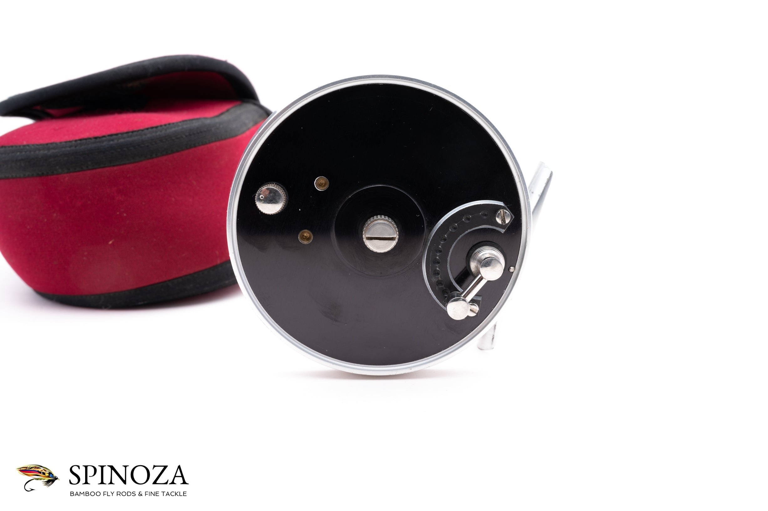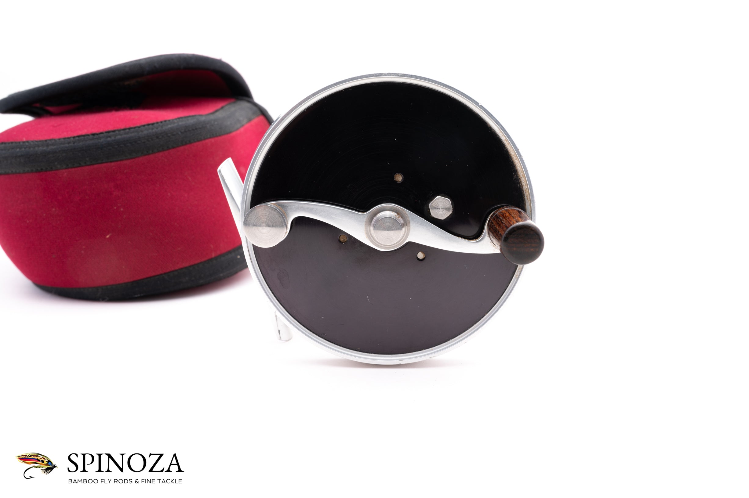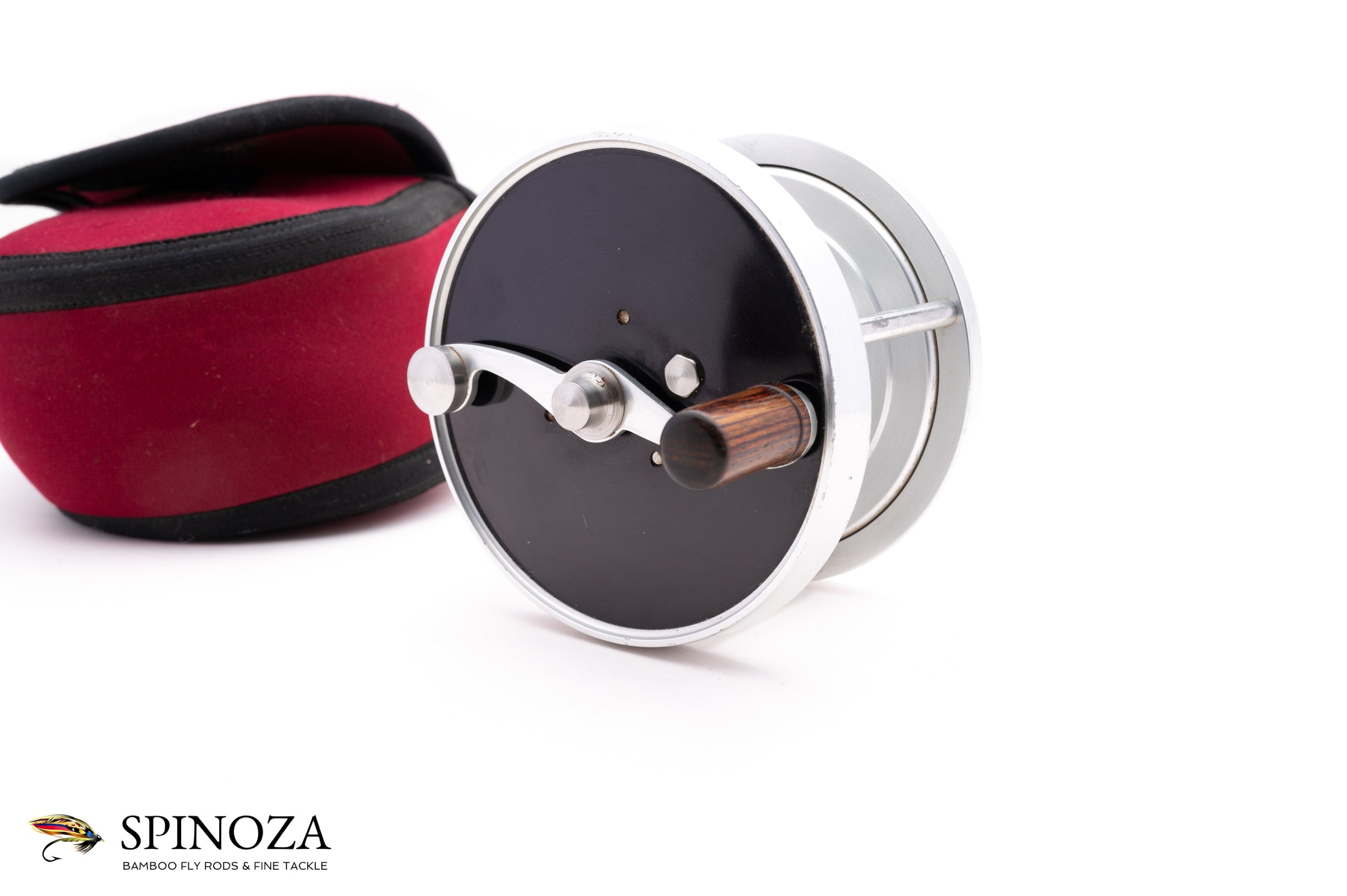 A Ted Godfrey custom light salmon reel, 3 1/4" diameter and set up for RHW. Made in the 1990's. The reel weighs 10.2 ounces. Classic S-handle design with an aluminum frame and spool with black anodized sideplates. Near mint condition. There are some tiny mounting marks on the foot and just a few tiny marks on the frame edge. It couldn't have been fished much. Disc drag, with a click on the inbound but quiet on the outbound. The drag is adjusted via a 10-position lever on the backplate and at the heaviest setting it is powerful indeed! 1.9 to 1 multiplier retrieve. The reel packs into a dark red neoprene pouch.