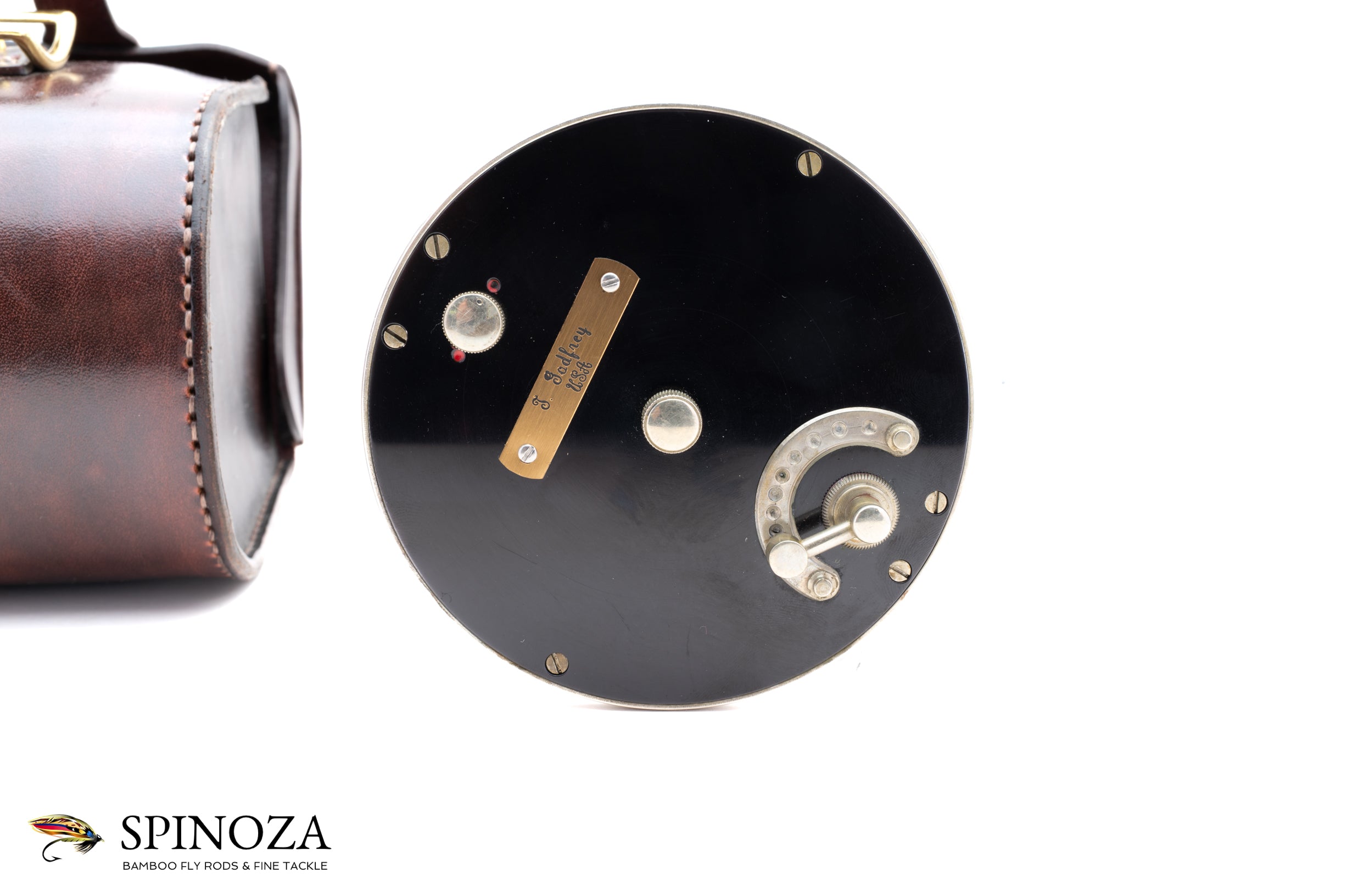 A nice Ted Godfreys Salmon Spey fly reel, 4" diameter, set up for RHW. The spool width is approximately 1.3" and the reel weighs 12.8 ounces on my scale. A classic S-handle style reel in the tradition of Vom Hofe. The accompanying Godfrey card with the reel says "Sal III" for the model, though it appears identical to the Salmon II as far as I can tell. It also notes that the reel is serial #004 made in September of 2002. Excellent, very lightly used condition bordering on near mint. There is some very minute scuffing on the frame edge, some tiny mounting marks on the foot, but otherwise the reel is very clean and could not have been fished much at all. Serpentine S-handle with a black handle and nickel silver counterbalance and end cap. Stainless steel pillars, doubled at the 6 and 12 position, with the reel foot mounted to those at the 6. The backplate boasts a Godfrey nameplate , a poacher's knob, oil port cover, and a 10-position drag lever. The drag is very powerful indeed when moved into the heavier positions. Nice smooth drag. This is a great reel which is ready for more days on the water chasing big salmon. It comes in a Tourbon leather block case.