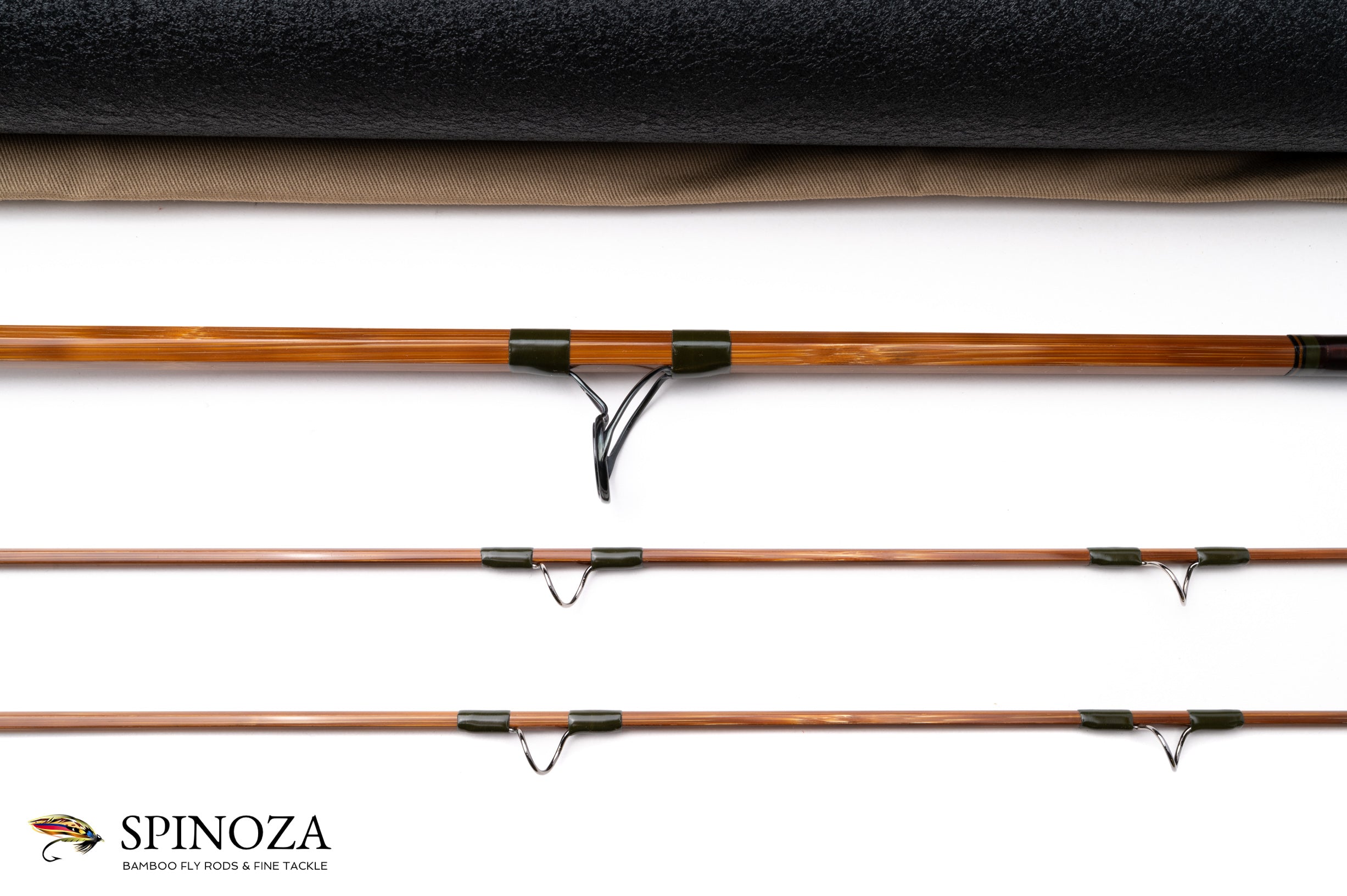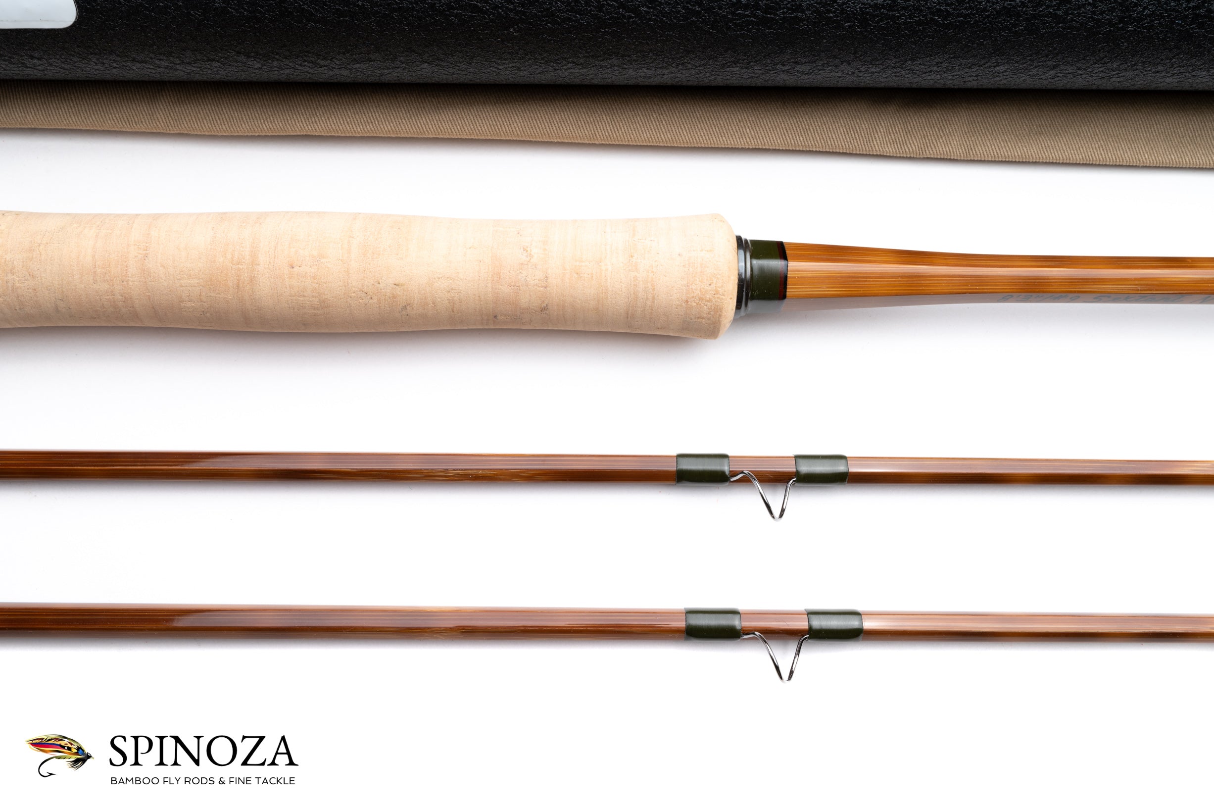 A nice Thomas and Thomas Sextant bamboo fly rod, 8'3", 2-piece, 2-tip, and built for a #9 line. Ser #5811. The rod weighs 7.3 ounces on my scale. Mint Condition. This rod was designed for saltwater use, and has a fast, strong action. Flamed cane with a touch of tiger striping. Impregnated with a very high polish. The main wraps are green with black edges, and brown wraps at the ferrules. The first three guides going across to the bottom of the tip are ceramic shock rings, with the balance being very wide and high arch chrome. The nickel silver ferrules are swiss style with a collar, and the ferrules and front cork check are oxidized jet black. The grip is 7" long and composed of 1/4" corks, and shaped to a full wells profile with a hidden pocket cap. The uplock screwlock seat features an aluminum green frost coated spacer and both the slide and hidden pocket cap are inletted. The seat features a double locking nut and a 1 1/2" fixed fighting butt rounds out the bottom. The rod packs into a tan cloth bag and black crackle painted tube with brass fittings and the T&T data sticker affixed to the outside.