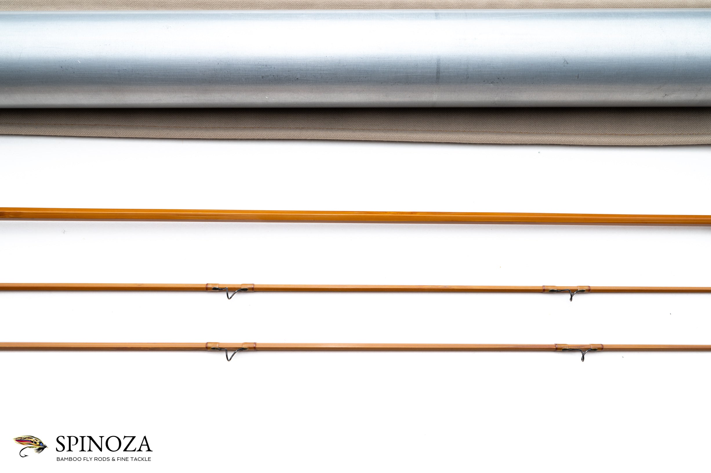 A nice Thomas and Thomas Caenis model bamboo fly rod, 6', 2-piece, 2-tip, and built for a #3 line. Serial #3685. The rod weighs 2.4 ounces. Used but very good condition. Impregnated model. Delicate action. Dark wheatstraw tempered cane done in a three up node pattern. Light tan main wraps with black edges, dark brown at the ferrules. Carbide stripper with black snake guides. Oxidized Swiss style ferrules with a collar. The grip is a 5" medium cigar grip. The varnished cap and ring seat is walnut with about 60% oxidation retention to the hardware. The butt cap has the roller die "Thomas and Thomas, Makers". The rod is straight and the ferrule fits are good. The rod packs into a tan cloth bag with a brushed aluminum tube with a brass top, collar, and bottom.