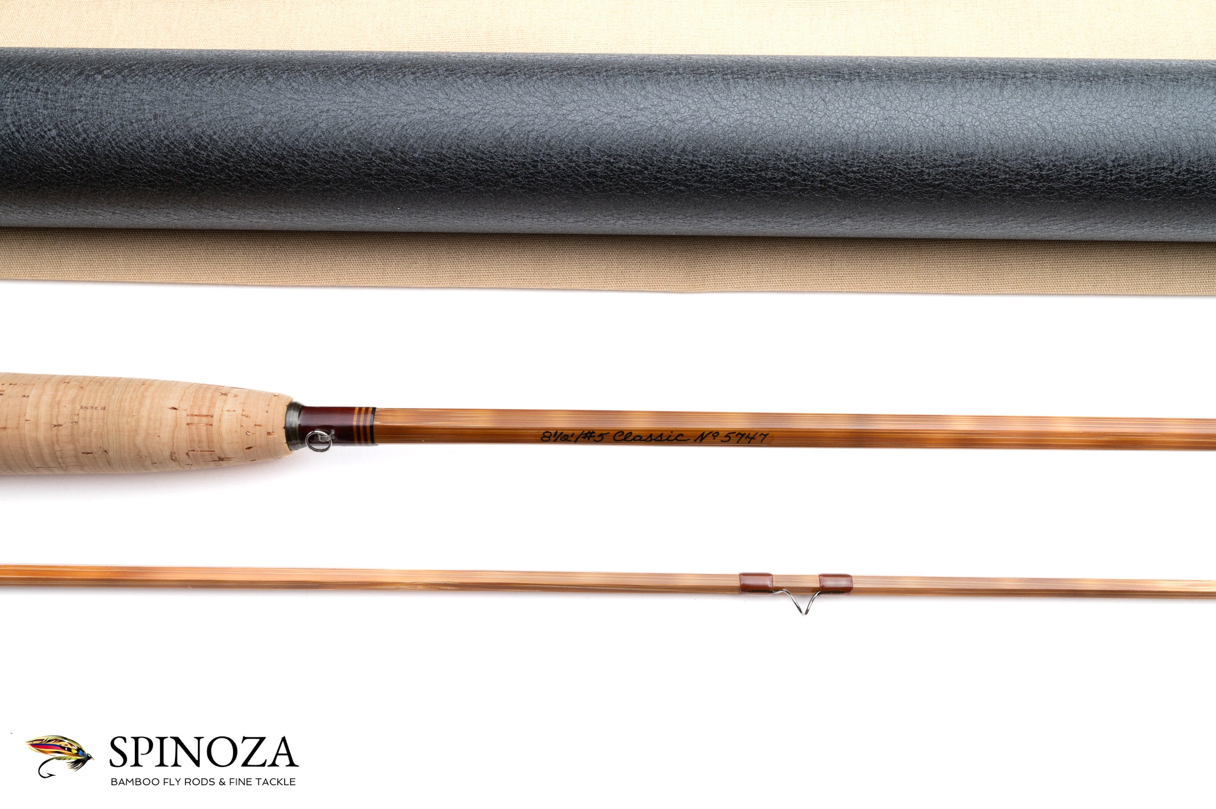 A Thomas and Thomas Classic model bamboo fly rod, 8'6", 2-piece, 1-tip, and built for a #5 line. Serial #5747. The rod weighs 5.6 ounces. Lawn cast with no sign of use. This rod came as a one-tipper as there is only one tip pocket sewn in the bag. Medium fast action. Impregnated. Tiger stripe flaming with three up nodes. The main wraps are brown with clear, brown, clear, brown, clear, and black edges at the keeper and ferrules. The stripper is carbide and the snakes are black. The ferrules are swiss style with a collar on the males and are oxidized. The rod is factory straight and ferrule fits are super. The grip is 6½" long, turned to a western with a hidden pocket cap and composed of 1/4" corks. The up lock screw lock is nickel silver with “Thomas & Thomas, Makers” stamped on the slide. The mortised walnut spacer has lovely dark veins and is varnished to a pane of glass finish. The tan bag has a stiffener and pull tab. The tube is black crackle painted aluminum with brass fittings and the T&T data sticker.
