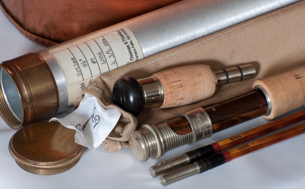 For sale here is a Thomas and Thomas Grilse Bamboo Rod from T&T's Individualist Series. Taken from the 1990 catalog, "A powerful 8'6 rod for #7 line that will make the time on your favorite salmon river more rewarding and less tiring". The rod is in excellent+ original condition throughout. The rod features a nickel silver screwlock slide band and lock ring, hand buffed; with detachable 5" fighting butt. Morticed burled walnut reel seat spacer (has some marks from use) and a western grip (slightly soiled). Mirrored tips. Elegantly swelled butt, bright guides, oxidized ferrules, great ferrule fit. "Every Individualist rod boasts a hand-rubbed, high-gloss varnish finish". "The attractive flamed cane used for T&T rods is complemented by translucent tawny rose guide wraps.....". T&T used these red wraps from approximately 1989 through 1992 according to their catalogs.Comes with original bag with stiffener, brass-capped aluminum tube with nice label. The fighting butt fits into a separate section of the bottom of the tube (the cap at that end screws off as well). The rod weighs 7 3/8 oz (the catalog and label weight is listed as 4 3/4 oz -- cane only I'm guessing). The rod is serial number 4886. Don't miss out on owning this classic T&T rod!