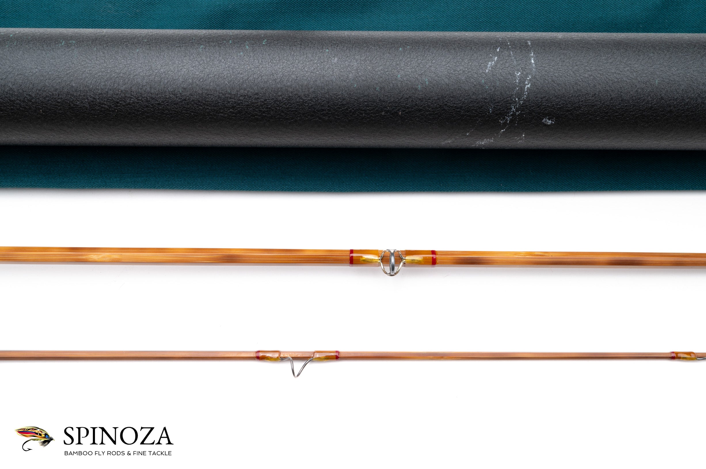A Thomas and Thomas Classic bamboo fly rod, 7', 2-piece, 1-tip, and built for a #4 line. 3.6 ounces on my scale. The rod does not appear to have seen much use, if any. Medium action. Impregnated cane with light tiger stripe flaming and a three-up node pattern. Almost transparent main wraps with red edges. Polished Swiss-style ferrules with a collar on the male. The grip is 6 1/2" long and turned to a blunt western profile with a hidden pocket cap. Aluminum uplocking screw lock (with no T&T logo die stamp). This rod was sold as a 1-tip model as indicated by the green cloth bag. The rod comes in a black crackle painted aluminum tube with brass hardware and a large T&T sticker.