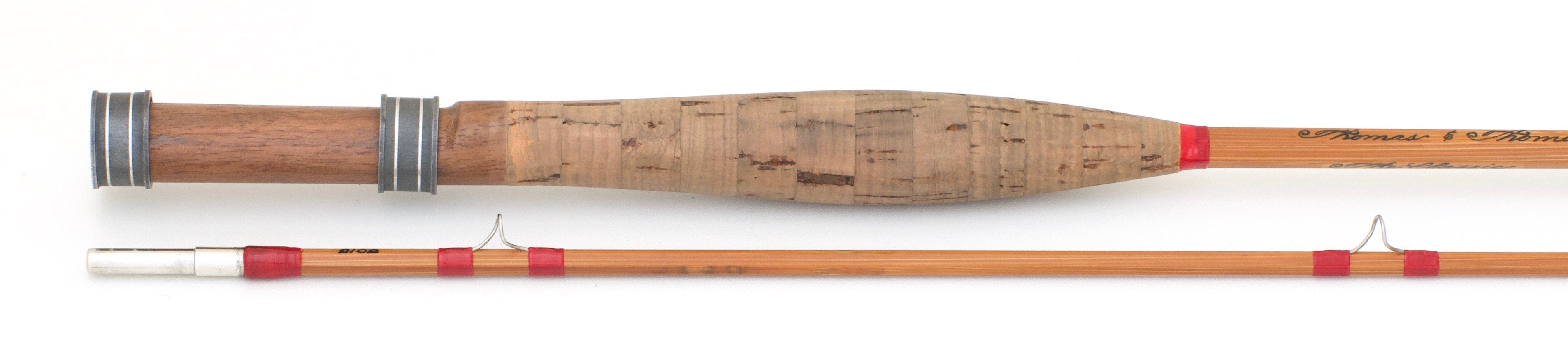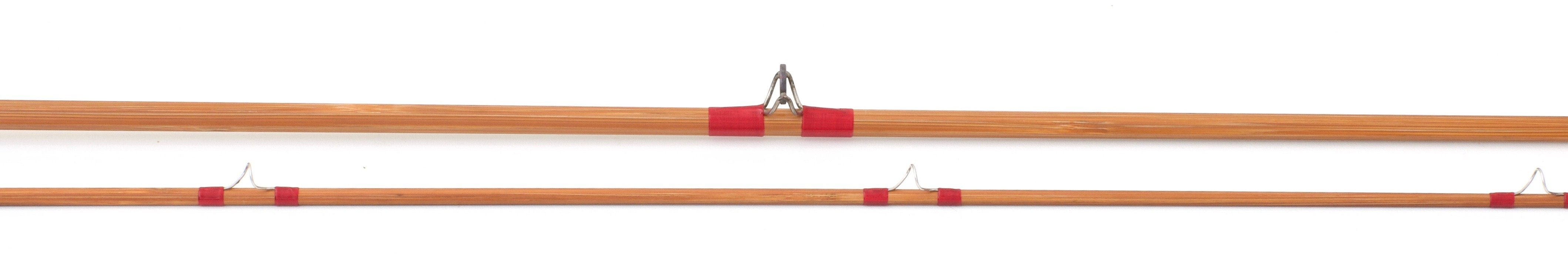 The rod features lightly tempered cane with bright red wraps and bright guides. The script, likely in Tom Maxwell's hand, remains clean and bold. The script varnish, as well as the wrap varnish, remains in excellent condition. Classic cigar grip 5 1/4" in length with moderate soiling thought the cork remains very smooth. Aluminum cap and ring reel seat over a mortised walnut spacer. The step-down ferrules have an excellent fit. The action is on the fast side of medium-fast. Best with a 6 weight line. Includes the original bag and tube.