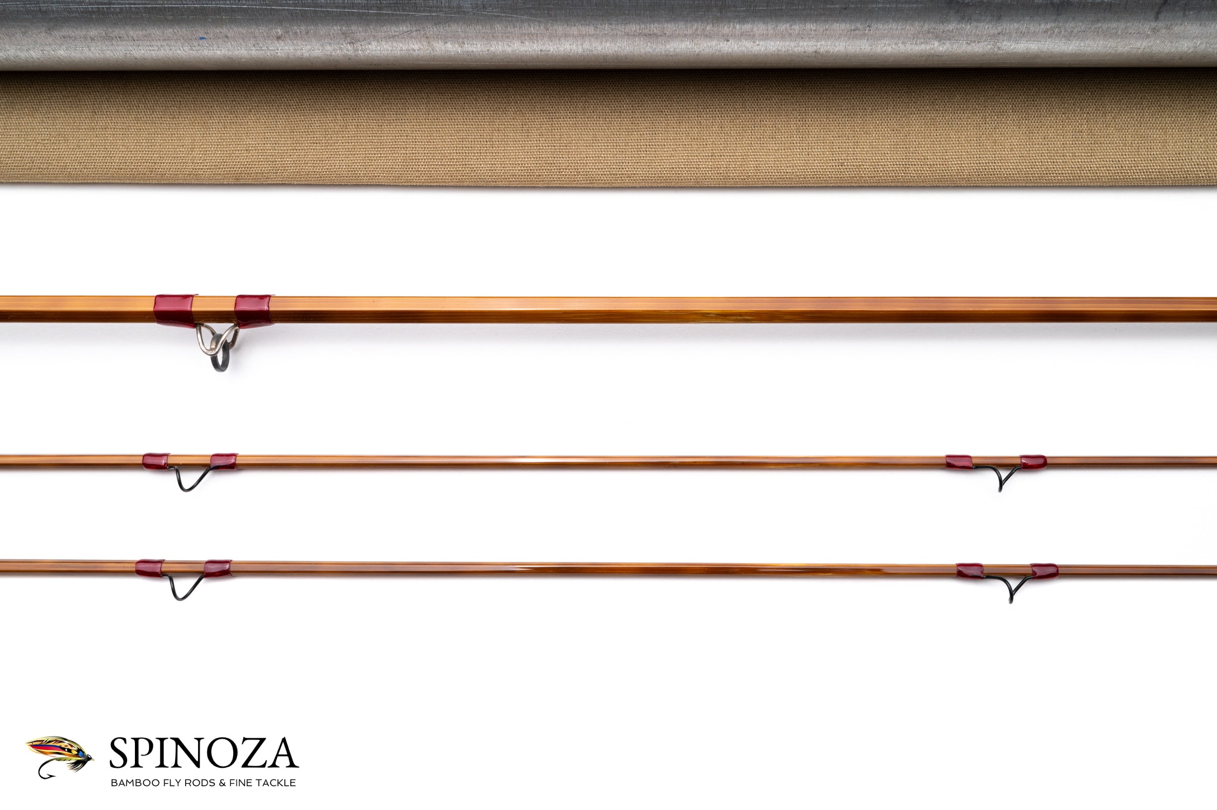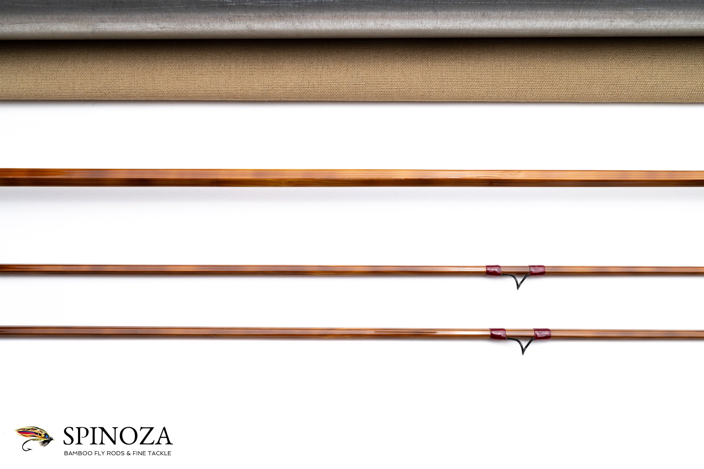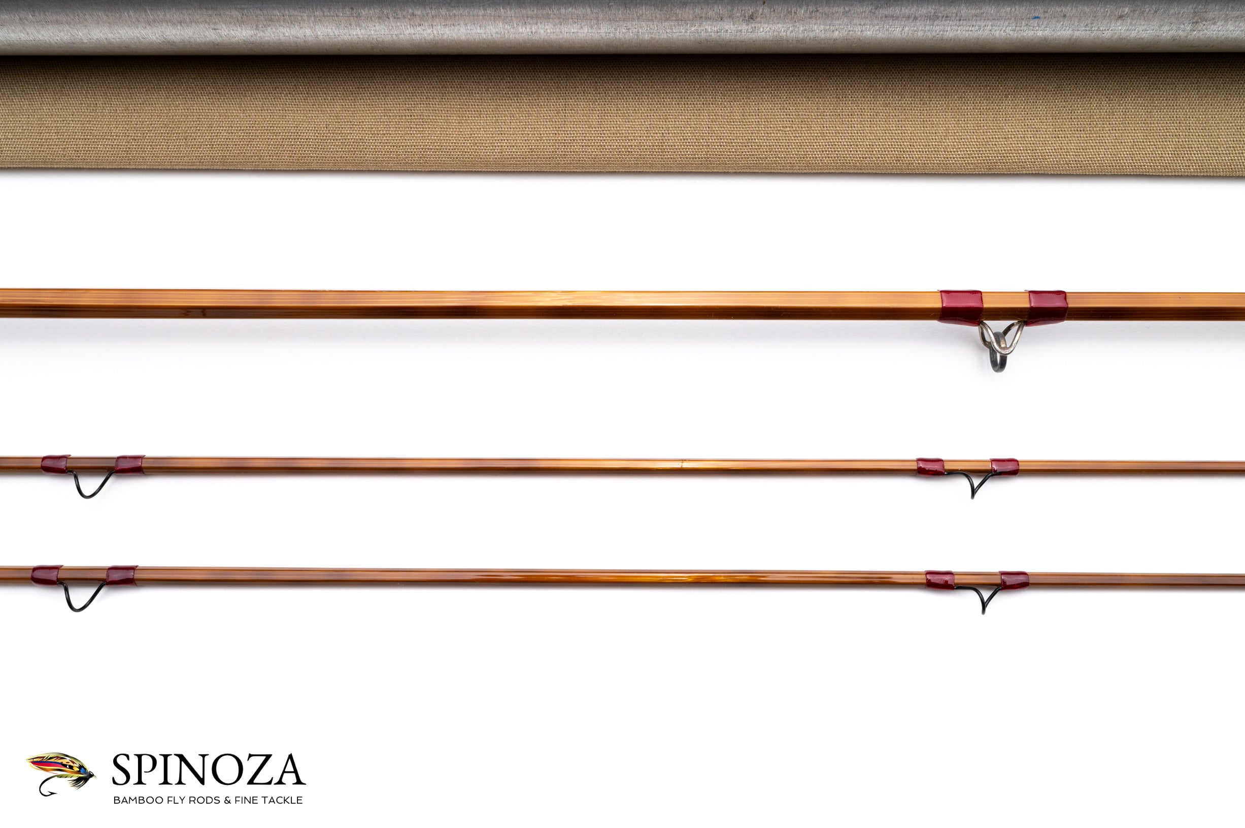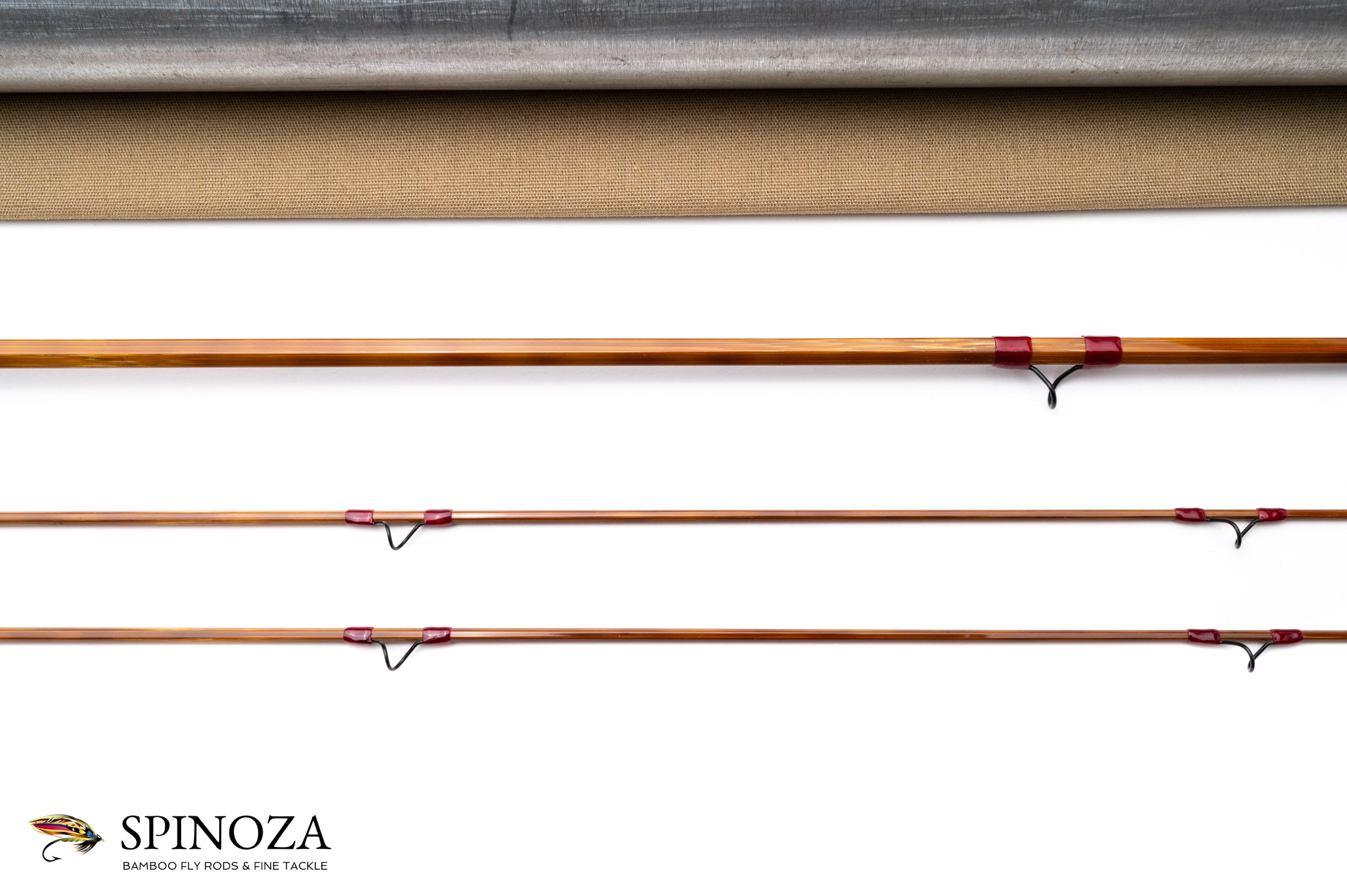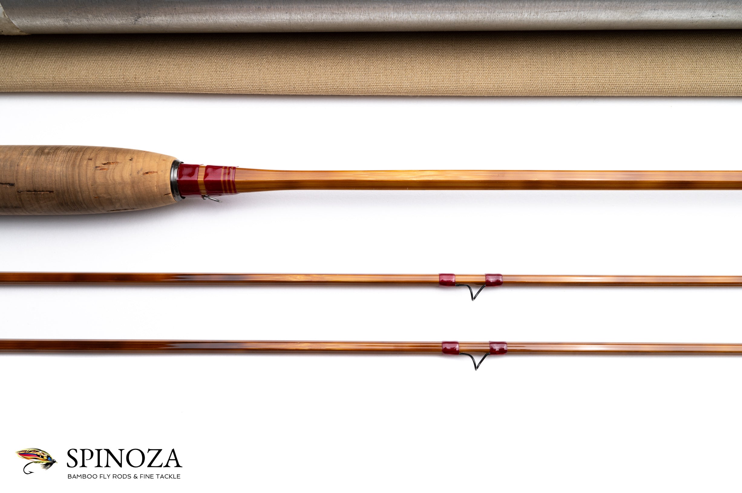 A nice Thomas and Thomas Caenis bamboo fly rod, 7'6", 2-piece, 2-tip, and built for a #3 line. Serial #5015. Marked as 2 7/8 ounces but the rod weighs closer to 3.7 on my scale. Pleasing medium action. Excellent used condition with normal cosmetic wear throughout. There are a few small scratches to the varnish just where the rod is inked on the butt and then up the rod about 3" down from the stripper there is a spot where one edge was scraped, but neither is particularly sinister. The grip is fairly well soiled and some of the bluing to the cap and ring has oxidized, but the ferrules are great and the varnish throughout the rest of the rod is excellent. The rod is also arrow straight and the ferrules seat nicely. Lightly mottled flame cane done in a three up node pattern, with the characteristic swell going into the grip. Wrapped red at the keeper, black at the ferrules with red tipping on the males, and red for the main wraps. Carbide stripper with black guides and tip tops. The oxidized ferrules are in excellent shape. The grip is a medium-blunt cigar with oxidized front and rear cork checks, while the seat is a cap and ring over a varnished walnut spacer. The cap sports the T&T maker stamp. The rod packs into a tan cloth bag with a stiffener and a brushed aluminum tube with the T&T data sticker affixed to it with brass fittings. A nice little T&T with some honest use but with many years of fishing ahead of it.