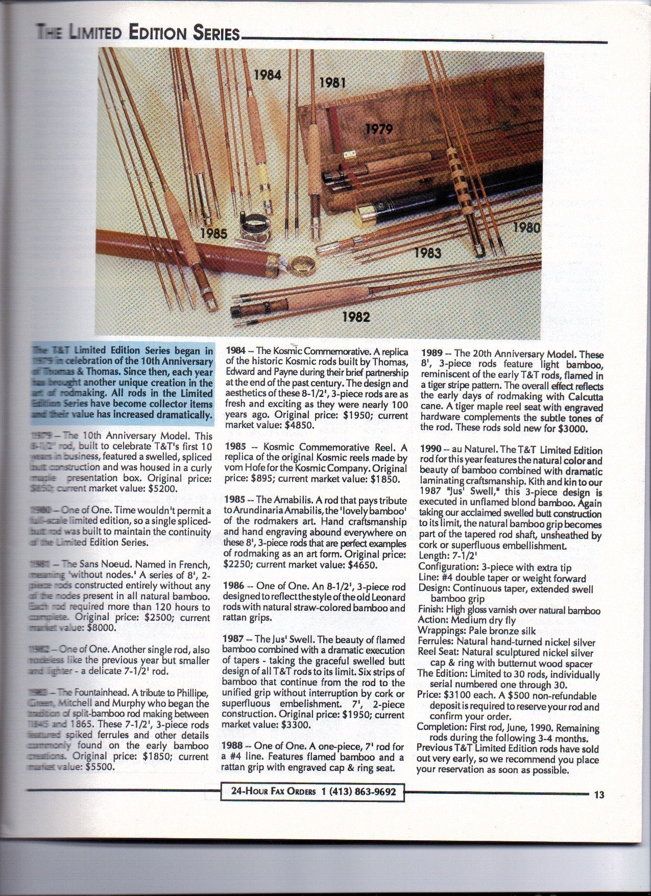 I will also include a scanned copy of the Thomas & Thomas catalog from 1990 when the rod was offered for $3,100. The rod also comes with its original bag and labeled tube.