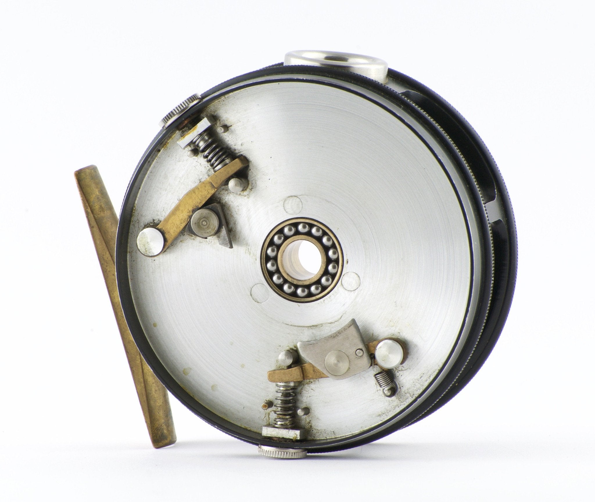 From Dan Homel's book,Antique Fly Reels, A History and Value Guide , "The drag incorporates a separate brake shoe for tension and pawl for click, both mounted upon lever arms fitted to opposite sides of a brake drum. The brake drum is provided with a smooth surface to accommodate the shoe and a toothed area or ratchet for the click pawl. Overall tension can be adjusted in various combinations between the pawl and brake shoe by means of two individual knobs which each drive a spring loaded stem against their respective lever arm. A recessed roller cage houses loosely fitted ball bearings to ease the entire rotation process."