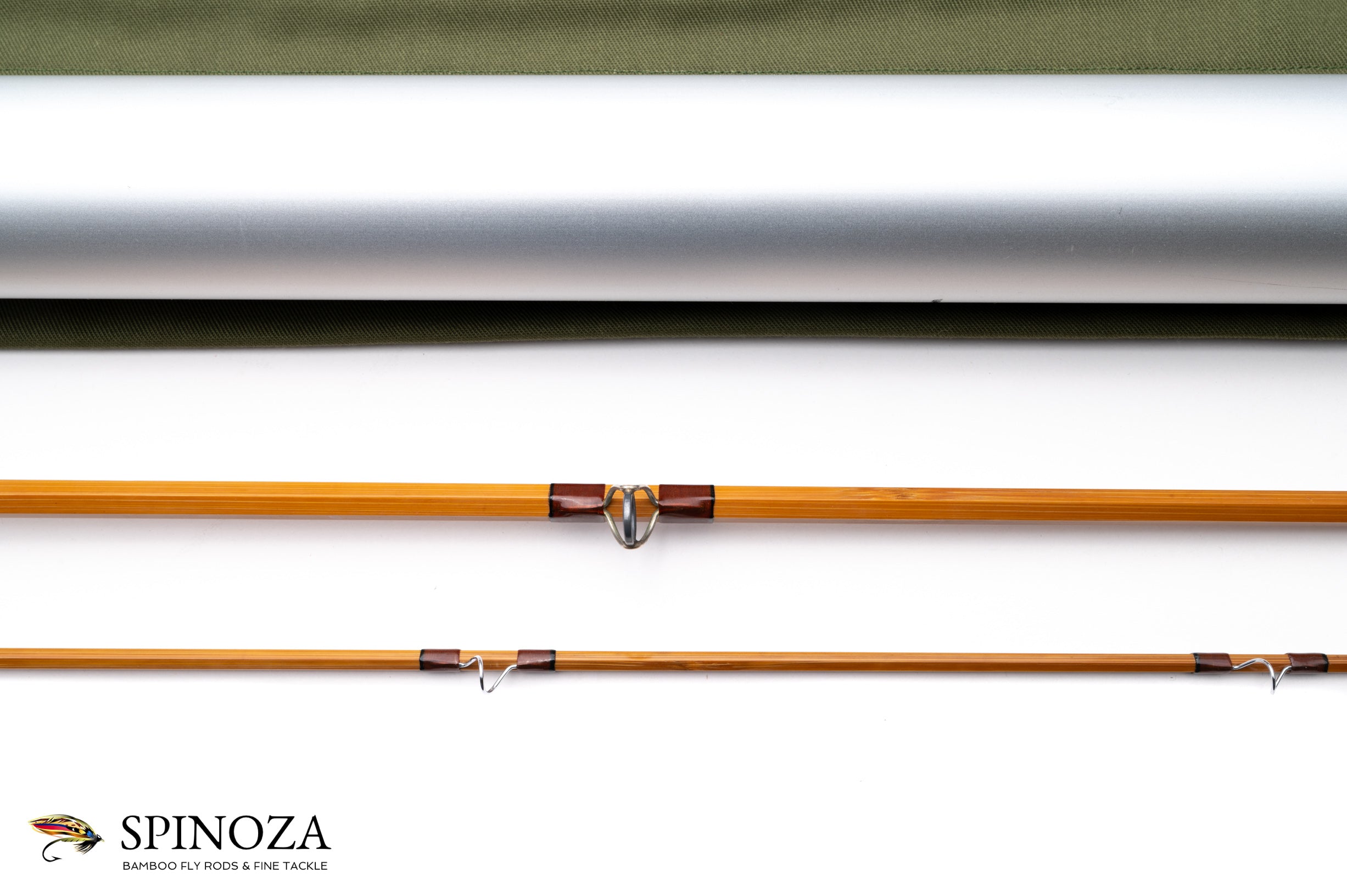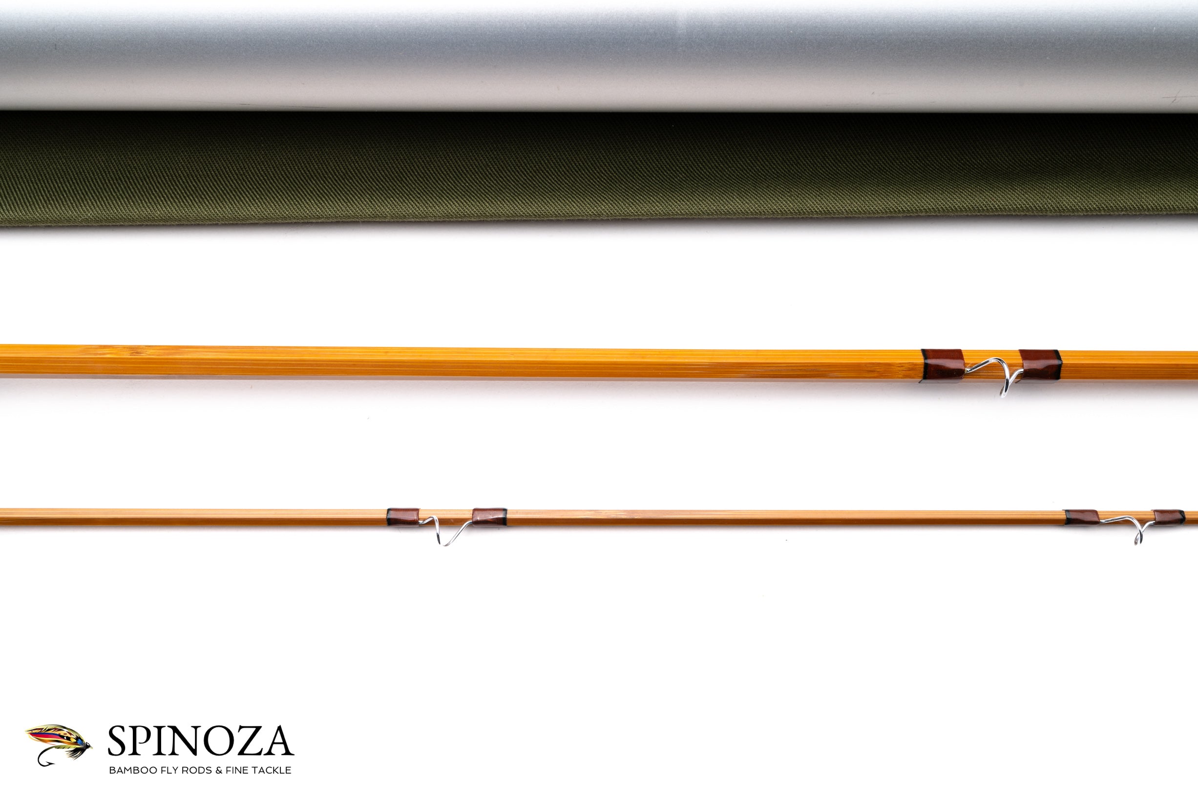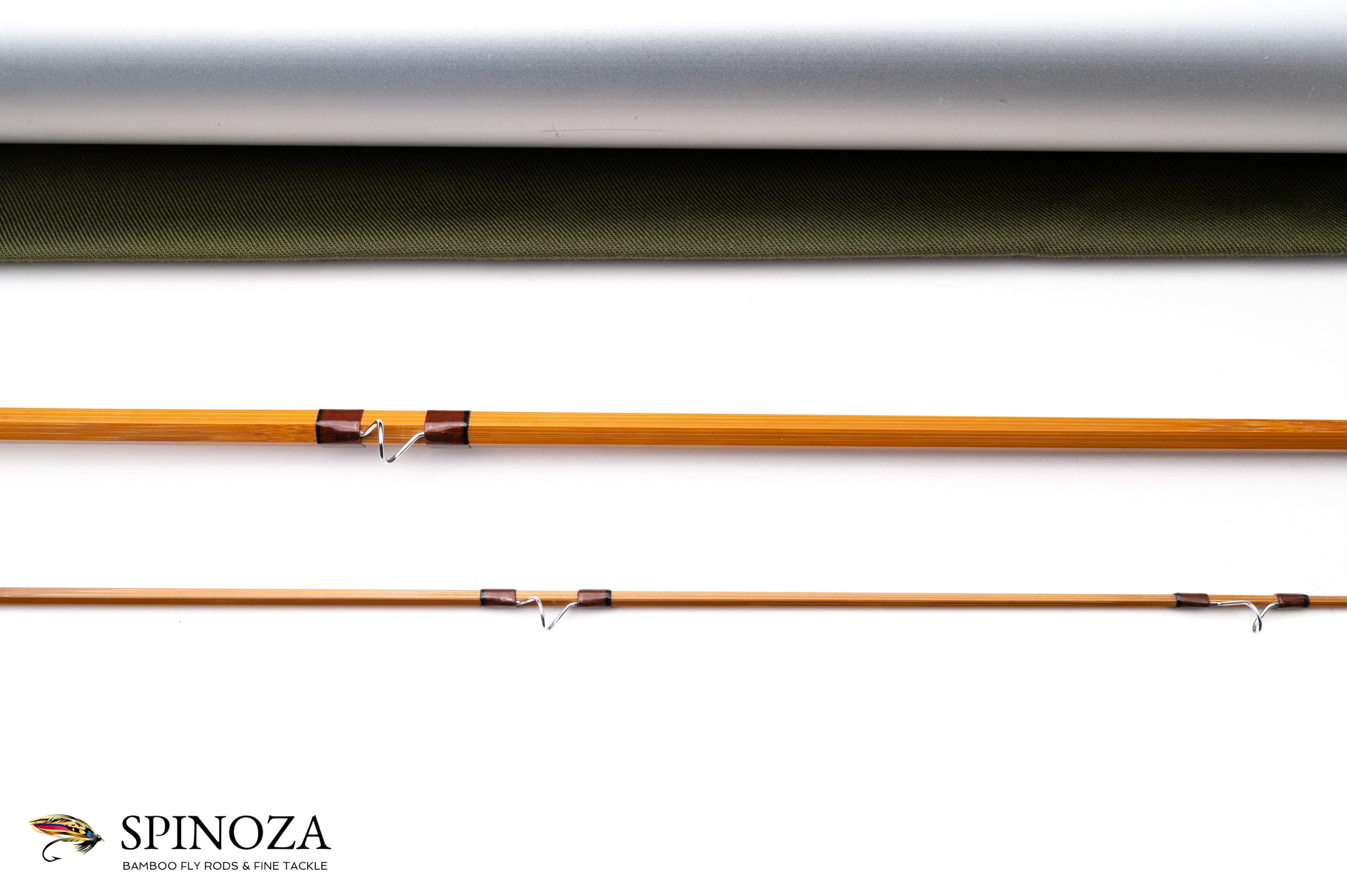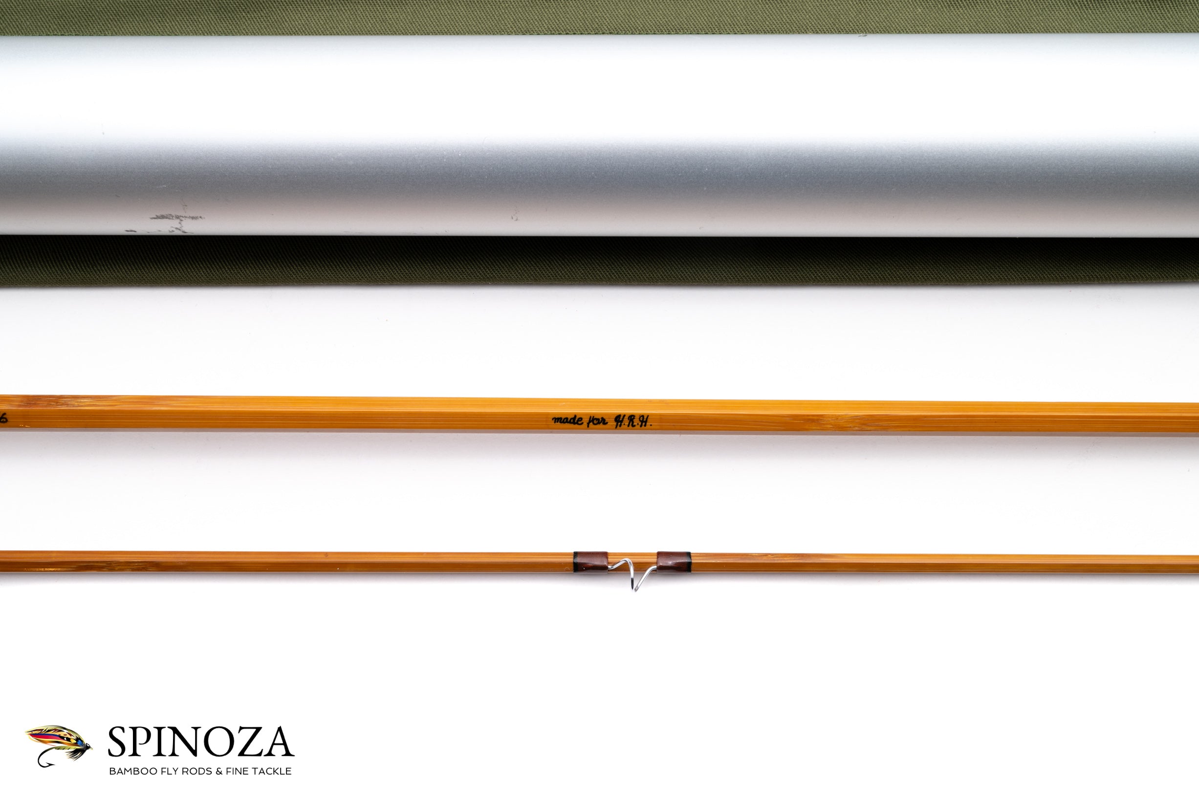 A nice Jennings Moran bamboo fly rod, 7'6", 2-piece, 1-tip, and built for a #5/6 line. Serial "867/3". The rod weighs 4.2 ounces. Made as a one tip rod (the rod bag is only provisioned for one tip) it is in lightly used condition. The grip has been cleaned but is in fine condition overall. Blonde cane with three up nodes. The main wraps are medium brown with dark green edges and a thin band of orange at the keeper. SRMC #10 carbide stripper and chrome snakes. Oil finish rather than varnish. "Made for HRH" is lettered on the shaft. Strong fast action. The grip is 6" long and shaped to a medium blunt cigar profile. The reel seat is a mortised and oiled light walnut with a nickel silver cap and ring. No die stamp on the cap. The rod packs into a green cloth bag with a stiffener and a frost coated aluminum tube with a brass bottom and top (though no collar as the threads have been directly cut into the tube). There is a Jennings/Moran data sticker affixed to the tube.