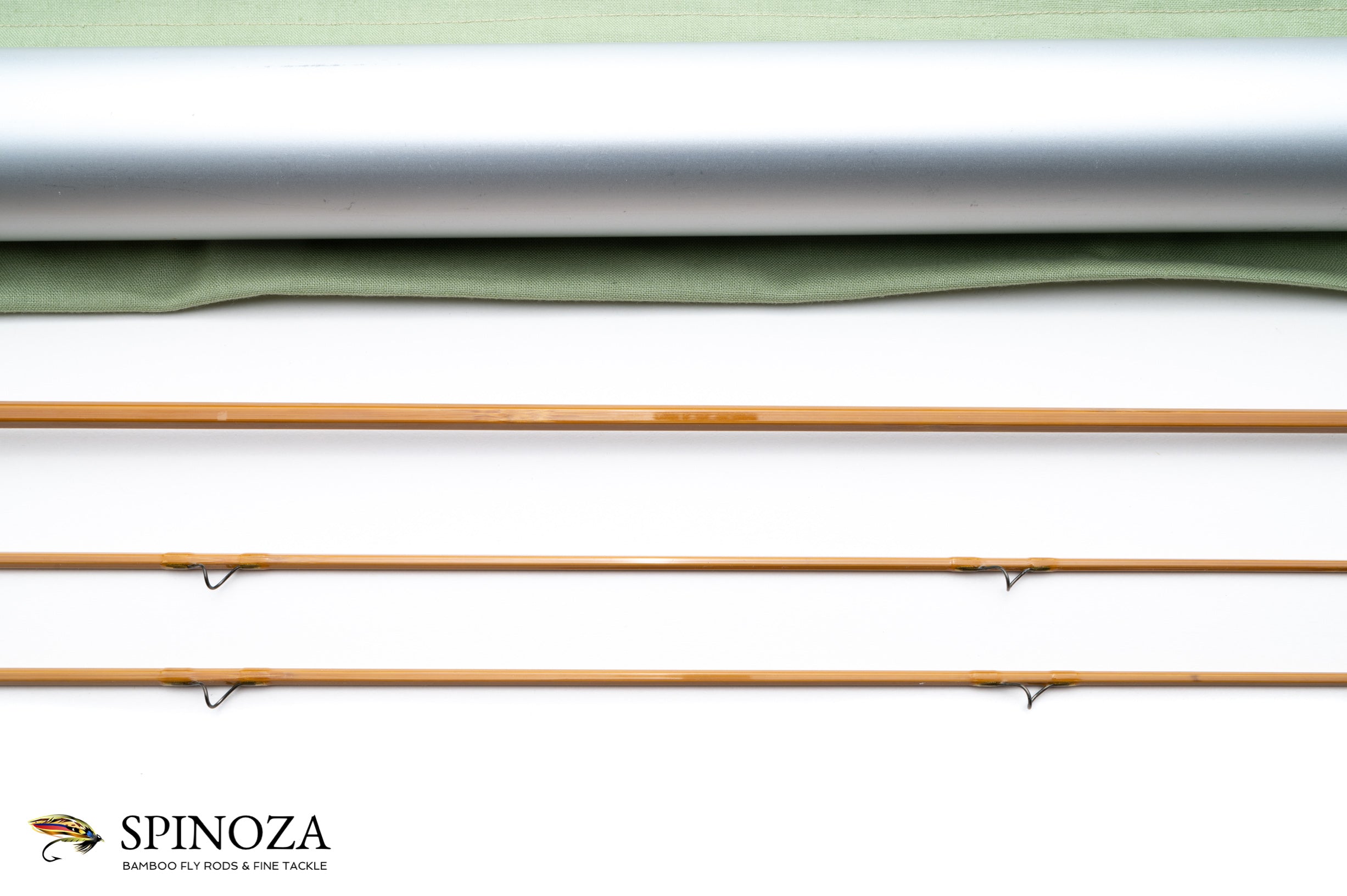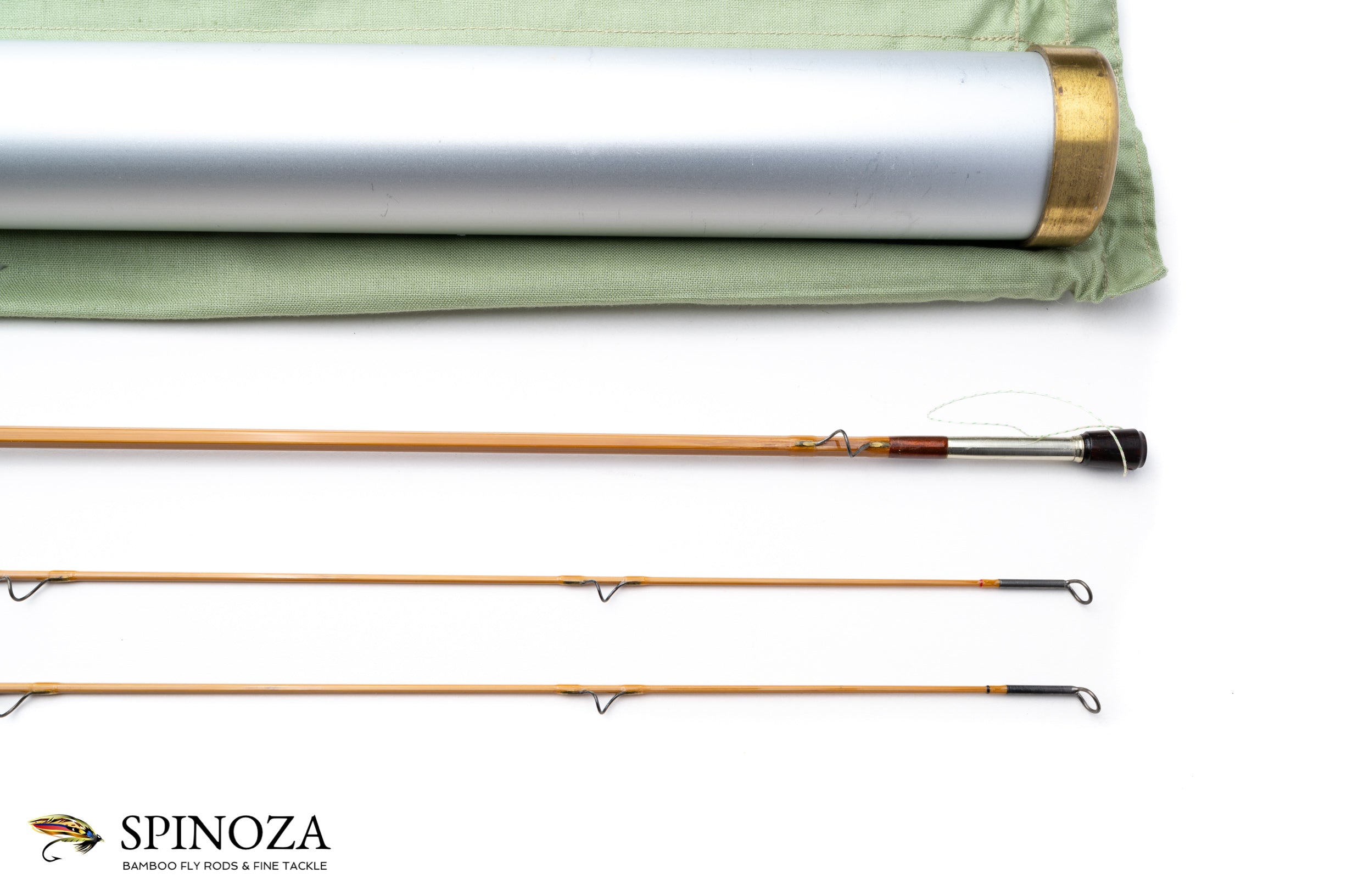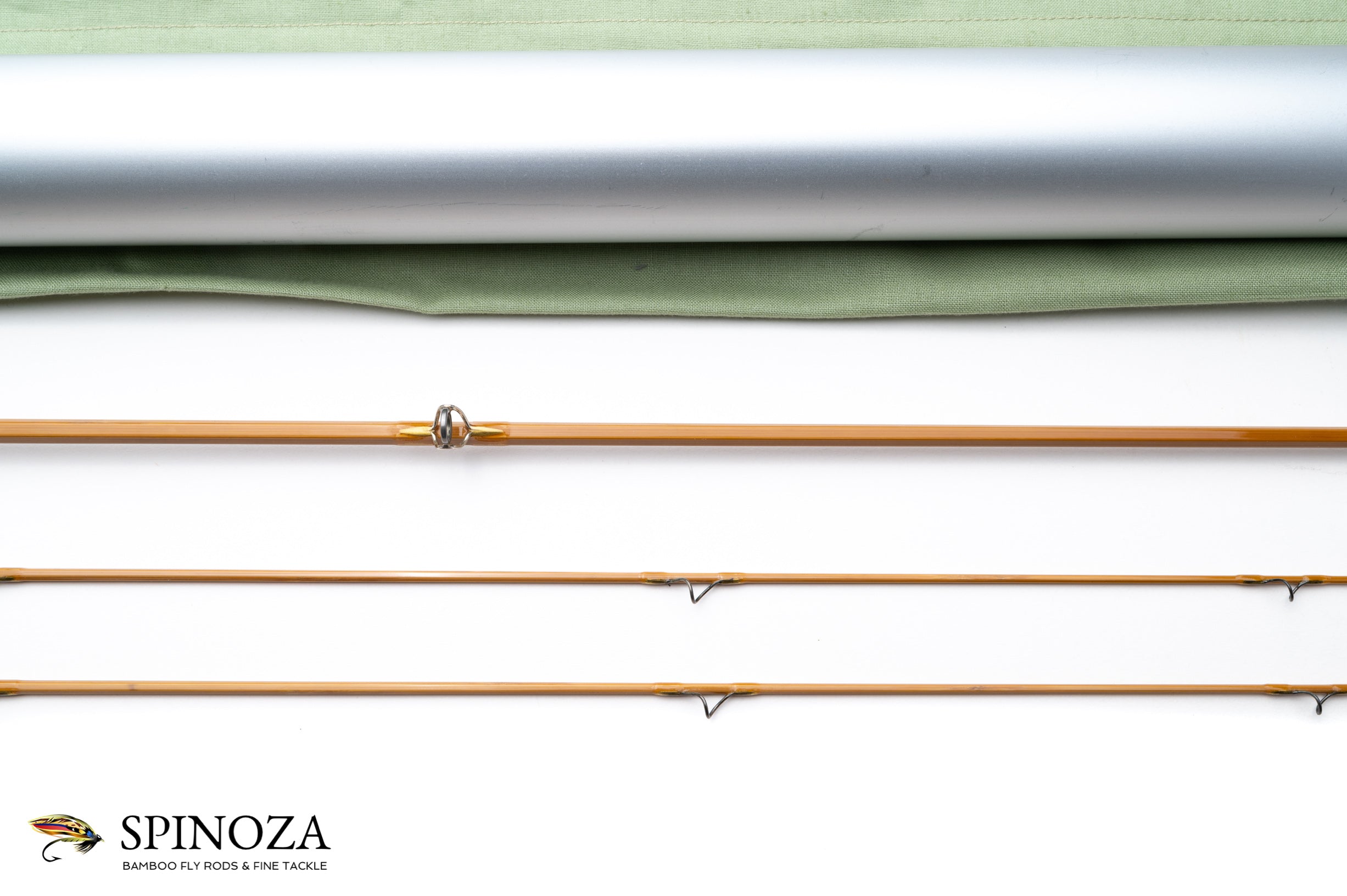 A nice Tom Moran bamboo fly rod, 6', 2-piece, 2-tip, and built for a #3 line. Serial # 723/1. Weighs 2.4 ounces on my scale. Lawn cast condition with a hint of brassing to the interior snake guides. Superb varnish and the rod is straight as the day it left the shop. Spiral node pattern with blonde oven tempered cane. Transparent guide wraps with a green and red edge at the keeper and a red band at one tip top and black at the other. The ferrule wraps are brown with black edges. The ferrules are swiss super Z style and are polished bright. The stripper guide is carbide and the guides are black snakes. The grip is 5 1/2" long and shaped to a medium cigar profile. The seat is a  cap and ring of polished nickel silver and the cap bears the stamp "T. Moran, Maker" in a cartouche. The rod comes with an olive cloth bag with a stiffener. The frost coated aluminum tube bears Tom's data sticker and the brass top screws directly into the tube with no collar.