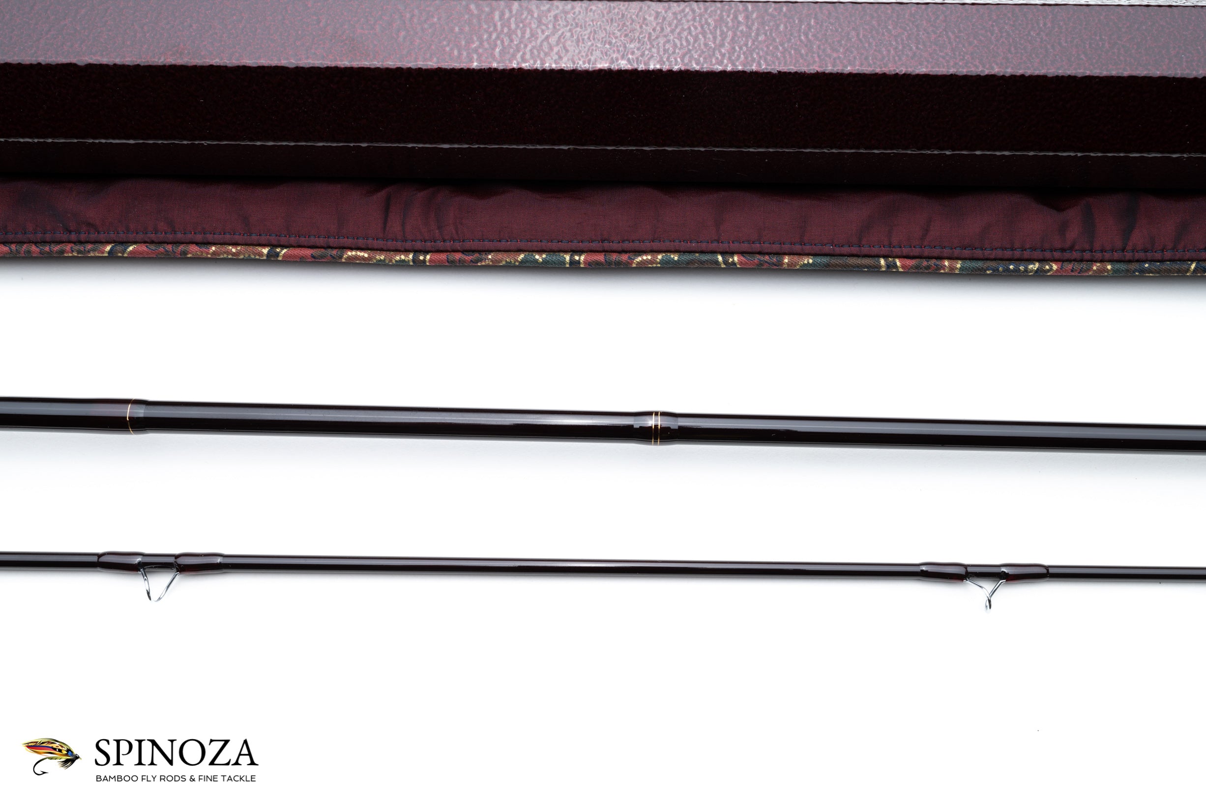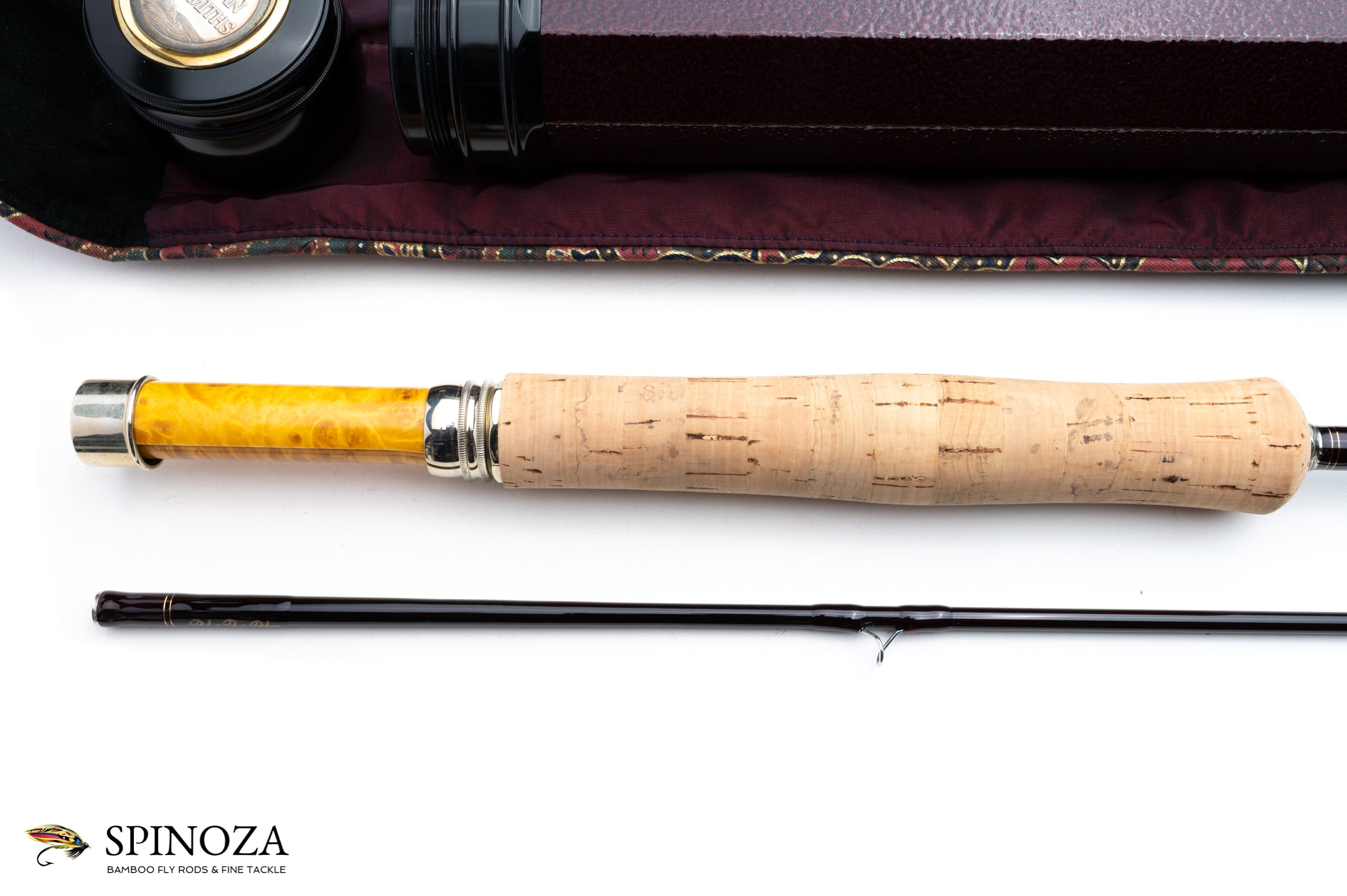 A nice Tom Morgan Rodsmiths graphite fly rod, 8'6", 2-piece, 1-tip, and built for a #6 line. Serial number 96-6-16. The rod does not appear to have been fished. Translucent wraps with fine gold tipping at the winding check, signature wrap, female ferrule, and tip-top. Bright guides. The rod has a hook keeper and red agate stripping guide. The length and line as well as the serial number are inked on the blank. Nickel-silver, octagonal front cork check. Western-style grip. Nickel-silver slide band seat with a beautiful mortised, tiger maple spacer. The female ferrule features a nickel silver collar to aid in prevention of a ferrule crack. The rod has a fast dry fly action and weighs 3 oz. The bag is made of a satin-like material in a plum color with a black faux suede lining and a paisley piping around the edge. The tube is a heavy octagonal aluminum with a hammer-tone finish also in a plum color. The cap has knurled edges and a brass Tom Morgan Rodsmiths medallion set in the top. The tube is housed in a heavy black felt cover with an adjustable drawstring and piping at the bottom to match the rod bag.