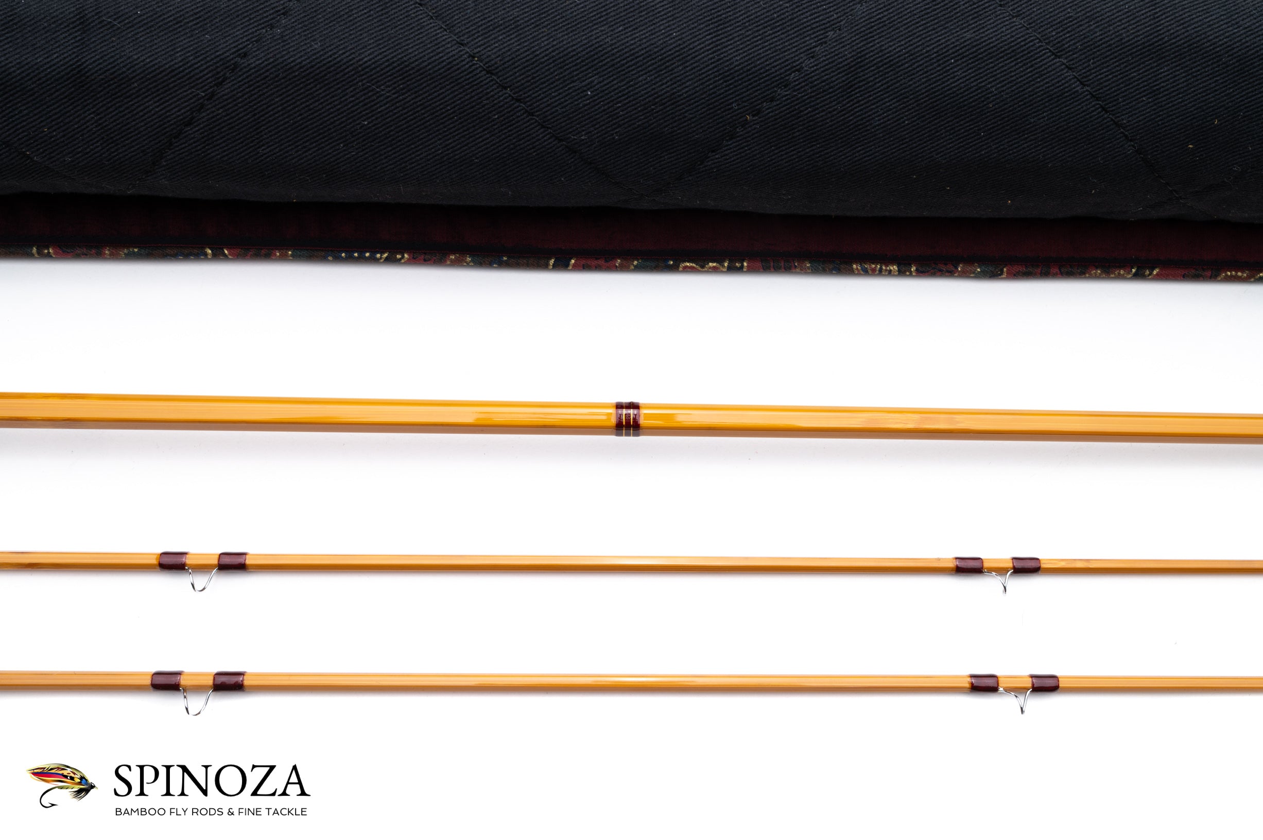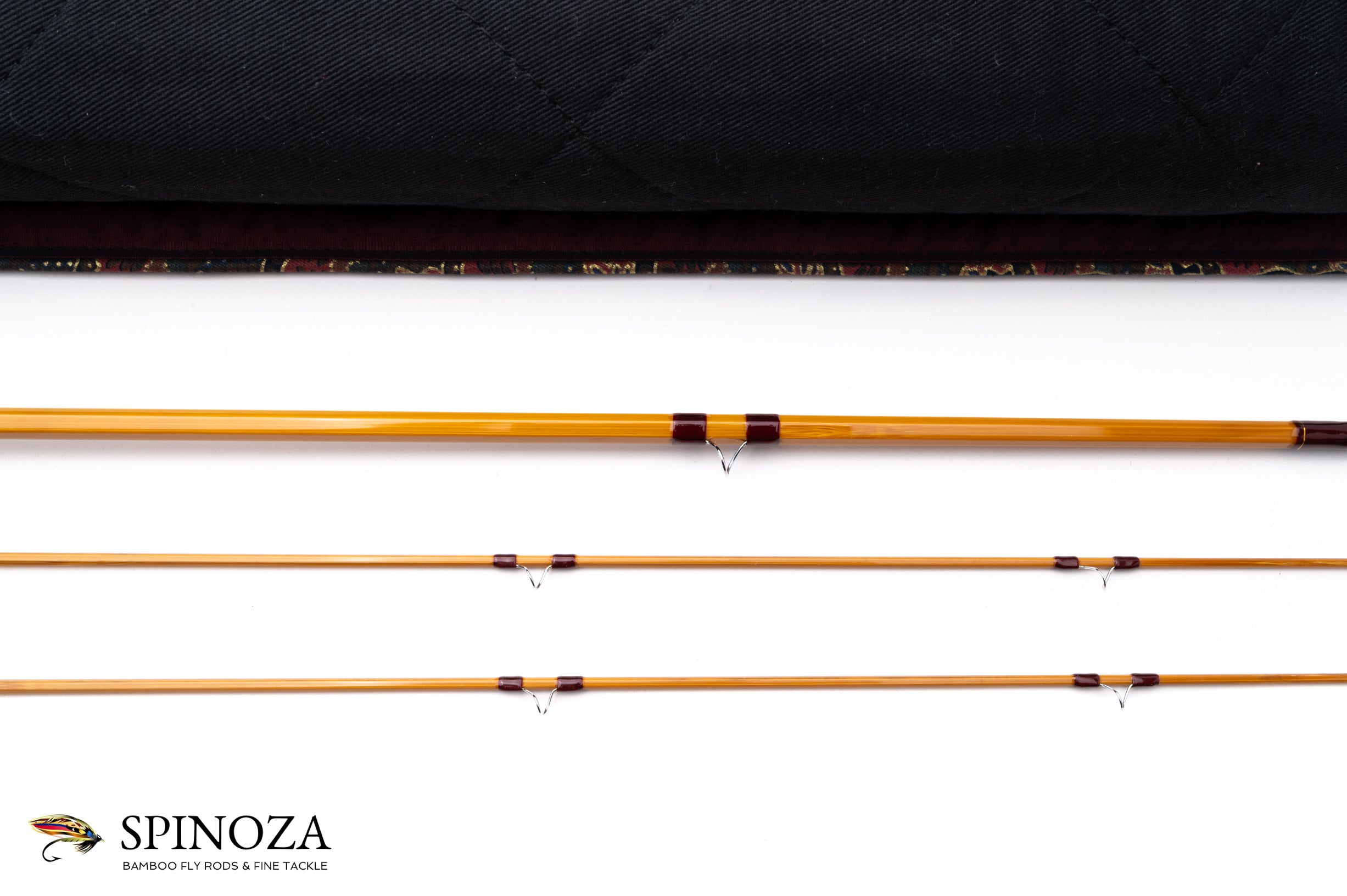 A nice Tom Morgan Rodsmith bamboo fly rod, 7', 2-piece, 2-tip, and built for a #4 line. Ser #33 of 200. The rod weighs 3.8 ounces on my scale. The action is on the faster side of medium. The rod appears in new condition except for some mild tanning to the grip (it appears in subtle strips down the length of the grip, which suggests to me an attempt to clean the grip with a soaked rag). There are no ferrule wrap cracks and the rod is straight. The cane is oven tempered to a wheat straw color and has a 3-up nodes configuration. The main wraps are maroon with gold accents at the keeper and ferrules. The stripper is an agate and the snakes are chrome. The super high quality varnish in flawless. The rod shaft is etched “7' #4" and " #33/200, 2004”. Swiss super-Z style ferrules are polished bright and somewhat truncated. A nickel silver and cork female plug is styled like the tube top. The grip has a six side nickel silver front cork check, polished bright. The grip is 6" long and done in a western style with a hidden pocket cap. The seat is mortised tiger maple and likely stabilized as it is uncoated. The screwlock is an uplock of nickel silver with the slide and nut pared off. The bottom cap is engraved with “Tom Morgan Rodsmith.” The bag is well padded and dark maroon to match the wraps and rod tube. The tube is 8-sided and painted in a deep maroon except for the stylized black anodized collar and top. The top has a repeat of the “Tom Morgan Rodsmith” as a medallion pressed into it. The outfit is encased in a black padded overbag.