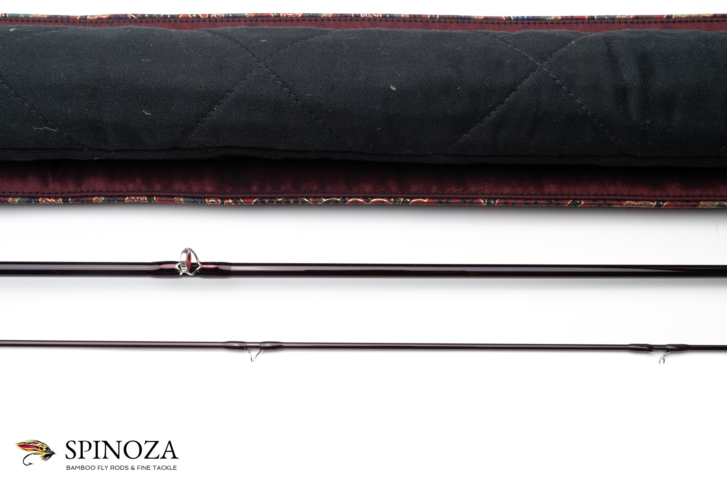 A nice Tom Morgan Rodsmiths graphite fly rod, 8'6", 2-piece, 1-tip, and built for a #4. 2.8 oz. The rod appears unused. Black graphite blank with maroon wraps. Agate stripper and chrome snakes and tip top. Sleeve over ferrule. The grip is 6" turned to a Western profile with a hidden pocket cap. The up-locking screwlock seat is nickel silver with a mortised walnut filler. The bottom cap is computer engraved "Tom Morgan Rodsmiths." The rod packs into a heavily padded maroon bag and an eight sided tube painted in a maroon paint with reflective particles and a padded overbag.