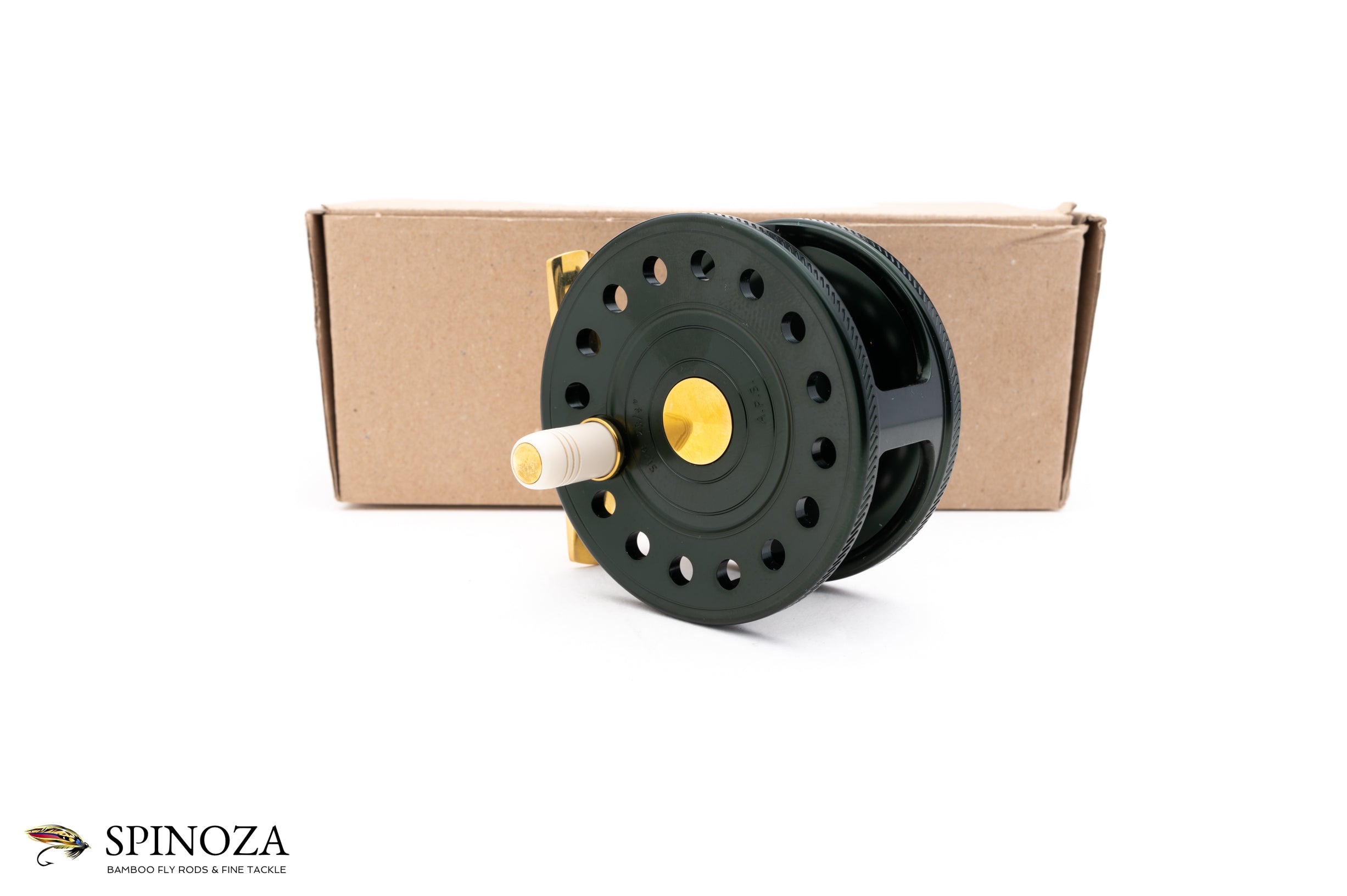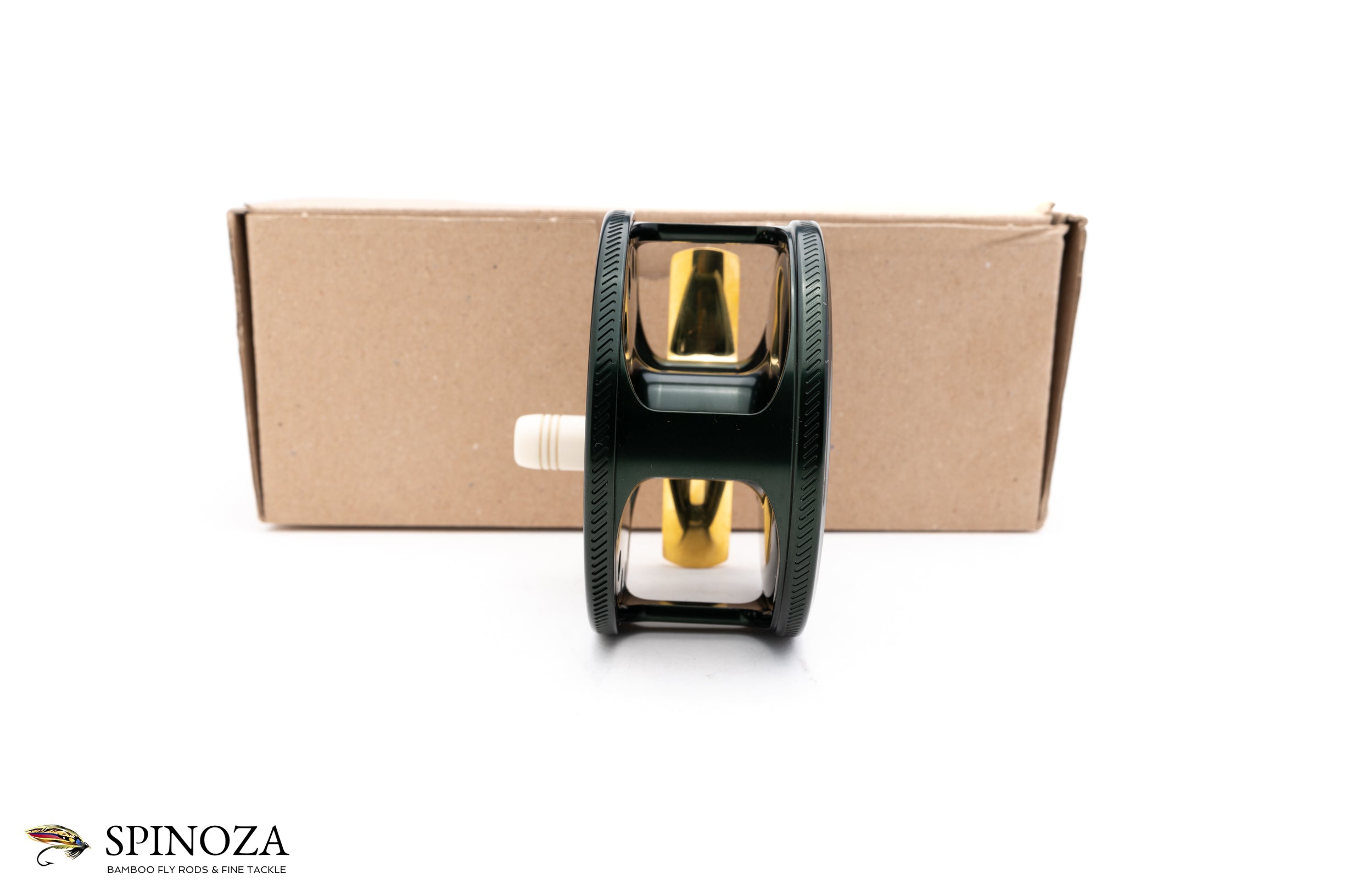 A very nice VR Design (Vladimir Rachenko) Trutta Perfetta aluminum fly reel, 2 3/4" diameter and set up for LHW. Mint condition. Dark olive frame and spool with a brass foot. "VR Design" stamped into the side of the foot as well as serial number "283" on the opposite side. The backplate has the reel model etched in a script as well as a nice little trout figure. Ivorine handle. Smooth click and pawl design. The reel is designed to have the spool provide a palming rim that's lightly engraved for extra sensitivity. The reel packs into a drawstring leather pouch and the box with original paperwork, which includes a provided hex key to remove the spool as well as a full schematic of the reel and its parts (very handy!). A very nice package here at a very reasonable price.