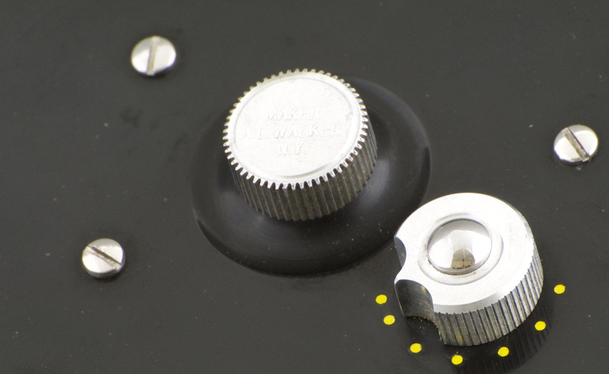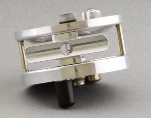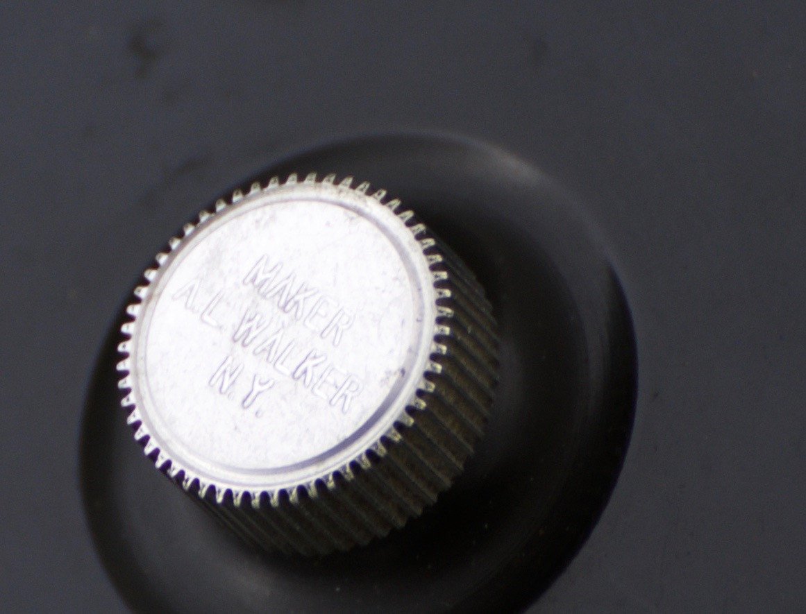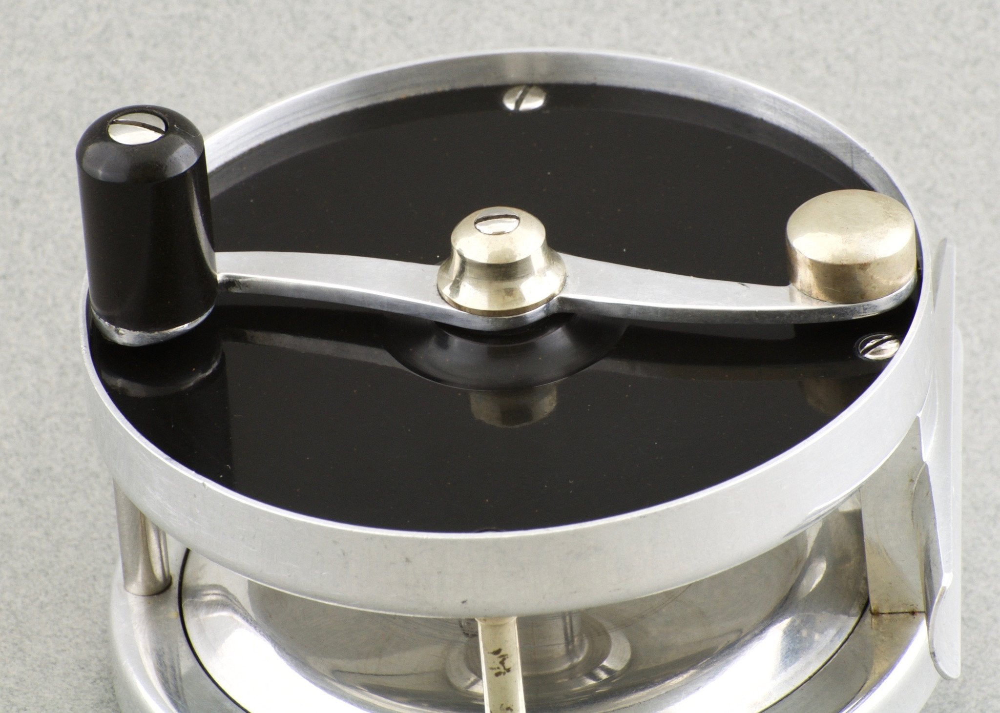 For sale here is a scarce Walker fly reel - Model 5 "Super American". Left hand retrieve. Adjustable click/pawl drag. 3 1/4" diameter. Frame width 1 5/8". Spool width 15/16". Weighs 6 3/8 oz. Will hold a DT6 plus 50 yds. Ebonite sideplates. Aluminum rims with a few german silver fittings. Excellent condition. No cracks or chips. Comes with its original Walker reel case.