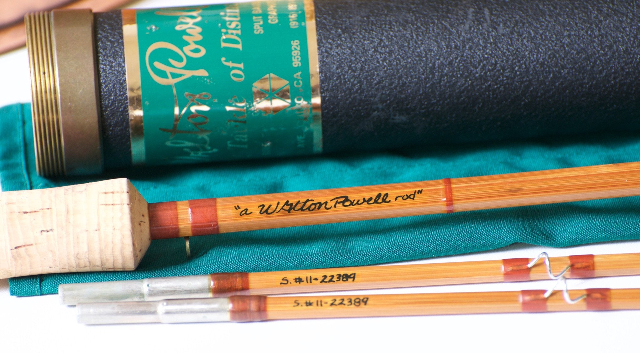 For sale here is a Walt Powell 8’8” 2/2 7 weight bamboo rod. Classic Powell full wells grip, champagne anodized uplocking seat over rosewood, straw colored varnished cane, tan silks, single intermediate wraps between guides, and bright intelligently witness marked ferrules. Typical of Powell, the rod has a smooth progressive dry fly feel. A super canoe rod or a great one-hander for summer steelhead! Light soiling of the cork otherwise in perfect order. The rod weighs 5.2 oz. and the ferrules are 15/64 with an excellent fit. On the medium side of medium fast action.