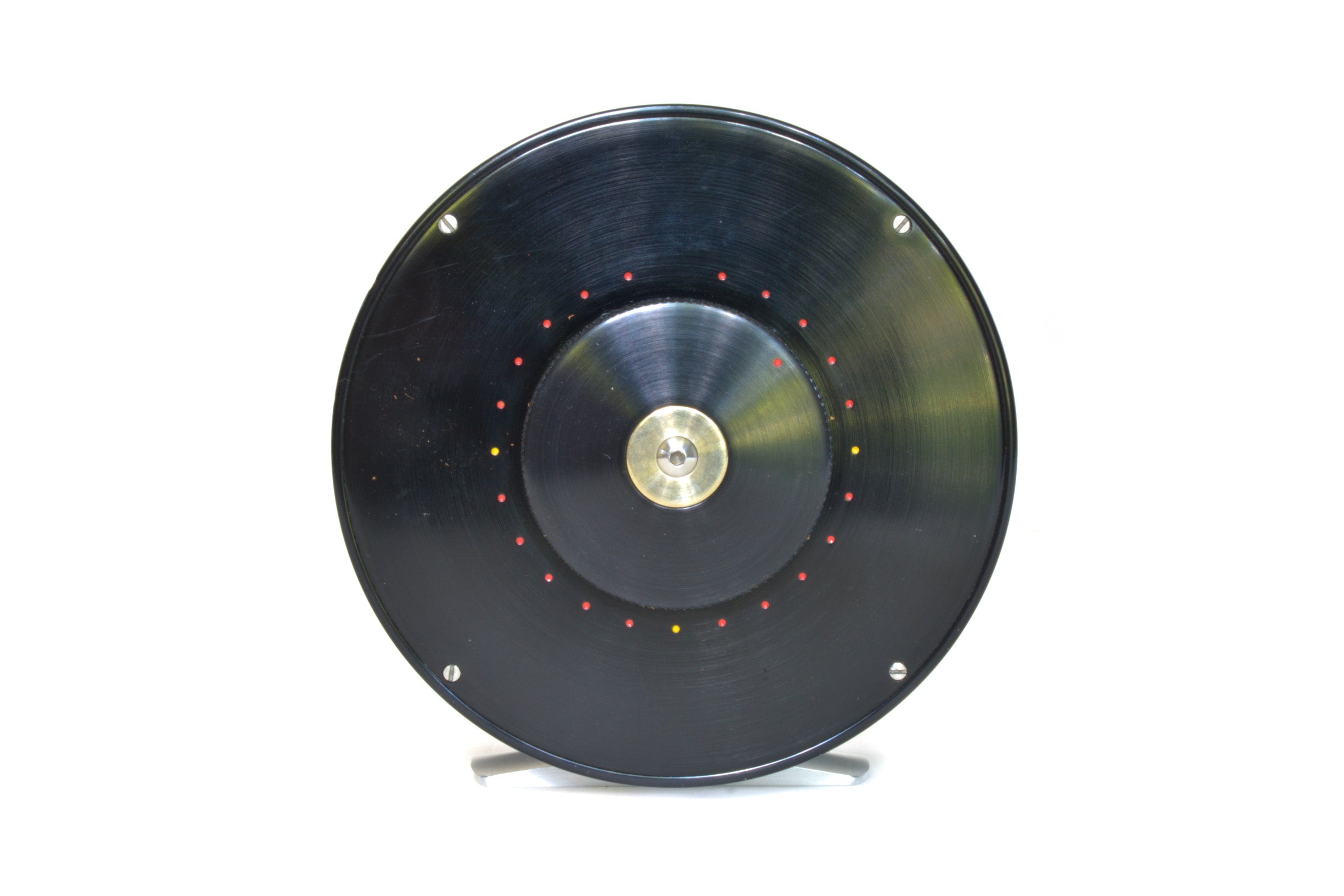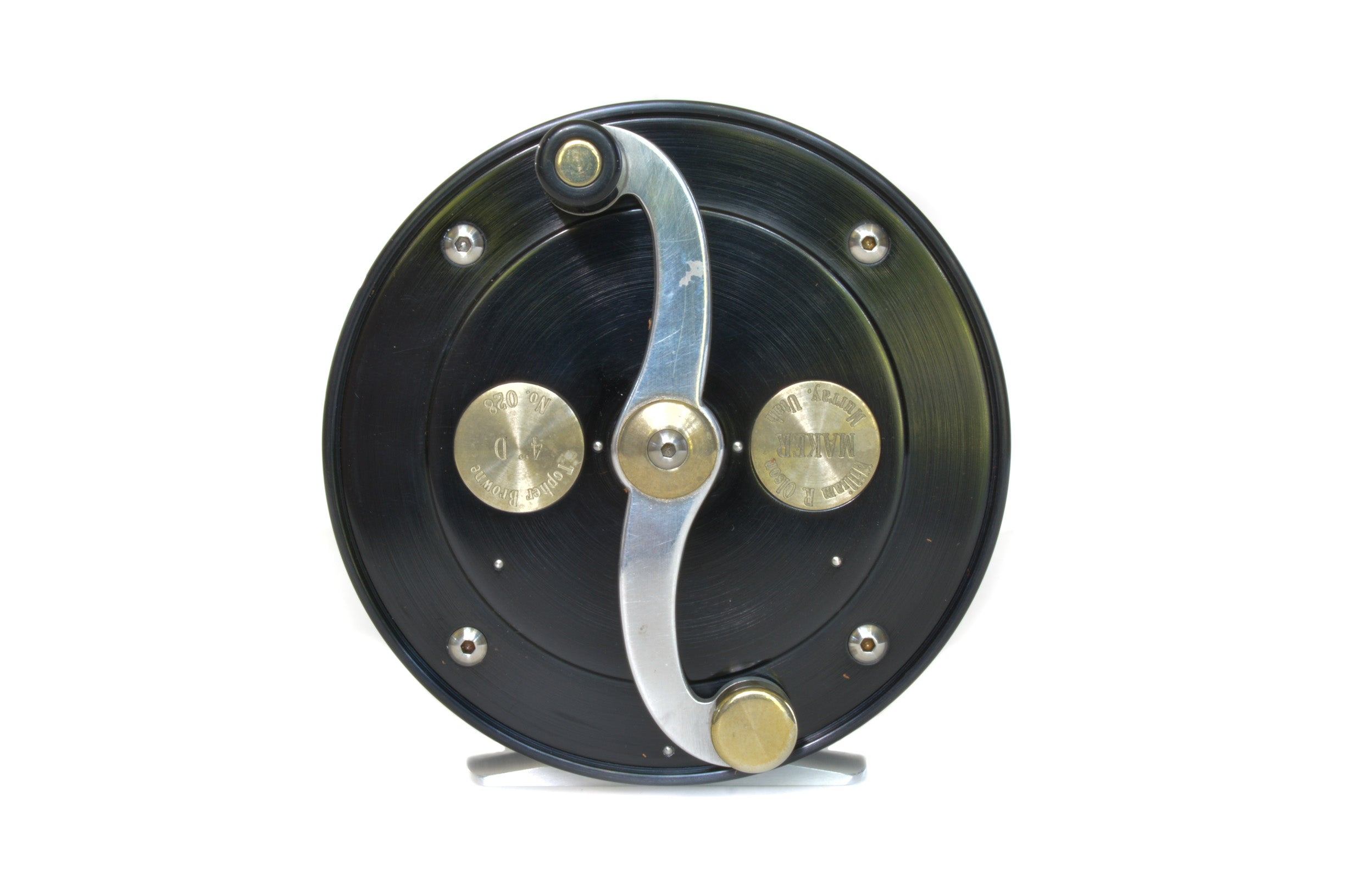 A very nice salmon reel by William Olson of Murray, Utah. 4" (100mm) in diameter, with a 30mm spool width. Disc Drag model. Serial #028. Set up for RHW. This reel weighs 14.7 oz with the backing still on the spool. This reel is near mint, and the only sign of use that I could find is a tiny, almost imperceptible, scratch on the bottom of the frame. A very well built offering from one of the new generation of classic reel makers. All black anodized frame, spool, and drag adjuster. The foot and serpentine handle are polished. Nickel silver counterweight. In a nod to the House of Hardy Cascapedia reels Olson's model has 2 nickel silver medallions inset on the crank side plate. One states "William R Olsen, Maker, Murray, Utah" and the other ' 4" D , no 028, Topher Browne'. Topher is, of course, a well-known author and salmon fisher (my understanding is that Mr. Olson can punch out the medallion and replace it with one for the new owner). The drag system on this reel adjusts smoothly from very light to very heavy, thanks to the sealed disc system which utilizes carbon on titanium. The reel is spooled with backing but no line. The reel comes with an Arnie Mason leather bag. A nice opportunity here to grab a reel without the significant waiting time that Mr. Olson has generated for new reel orders.