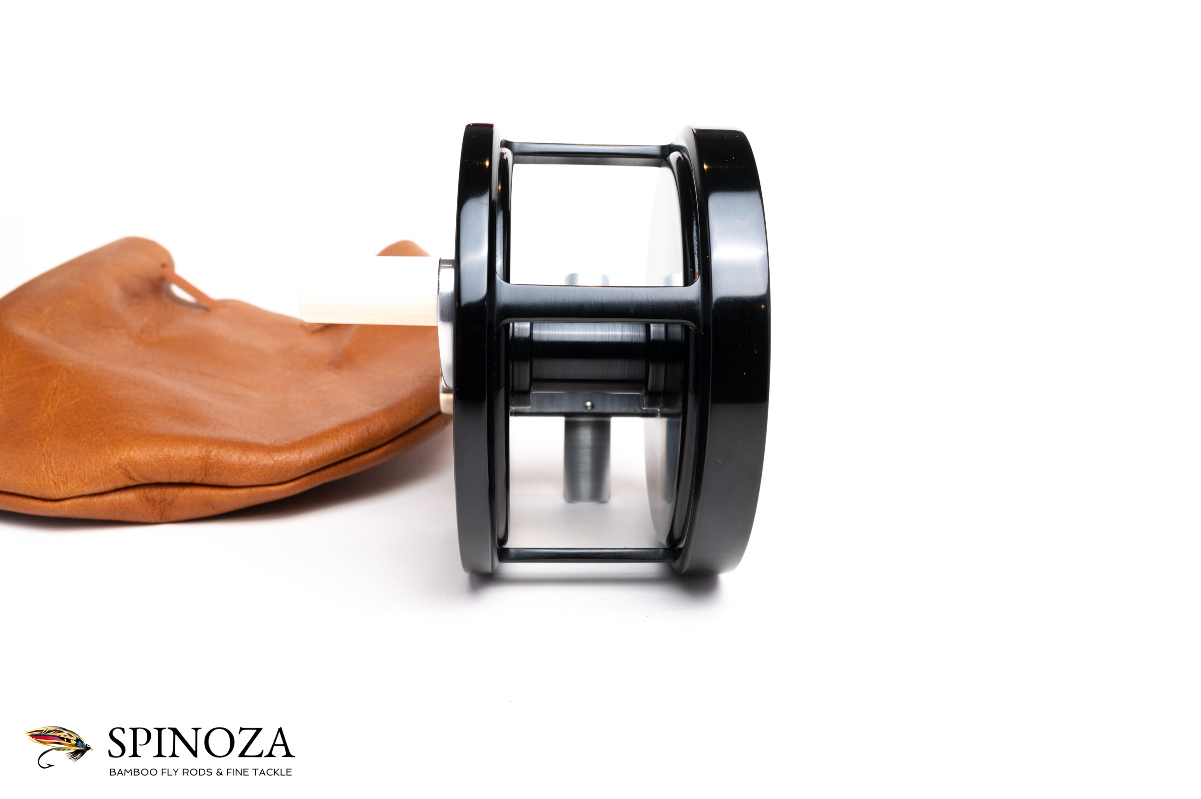 A superb William Olson Gear and Pawl fly reel, 4" diameter and set up for RHW. Black anodized throughout with a clear anodized foot and S-shaped crank handle. Two handsome medallions are inset into the front plate with the first noting the model and serial number (4" G&P / No. 241) while the second bears William's maker stamp. The reel weighs 12.1 ounces on my scale. It is in mint, unfished condition. Ivorine-style handle. Pre-set gear and pawl drag which has one of the loudest clicks of any gear and pawl reel I've ever seen (your friends will know when you are into a fish on this reel!). The reel packs into its original leather drawstring bag with Arne Mason's stamp on one side and "W.R. Olson" stamped on the other. Mr. Olson has built a well-deserved reputation as one of our best contemporary bench reelmakers, and, as fans know, the waitlist is substantial. Here is your chance to skip it and enjoy this reel on your next salmon or steelhead trip.