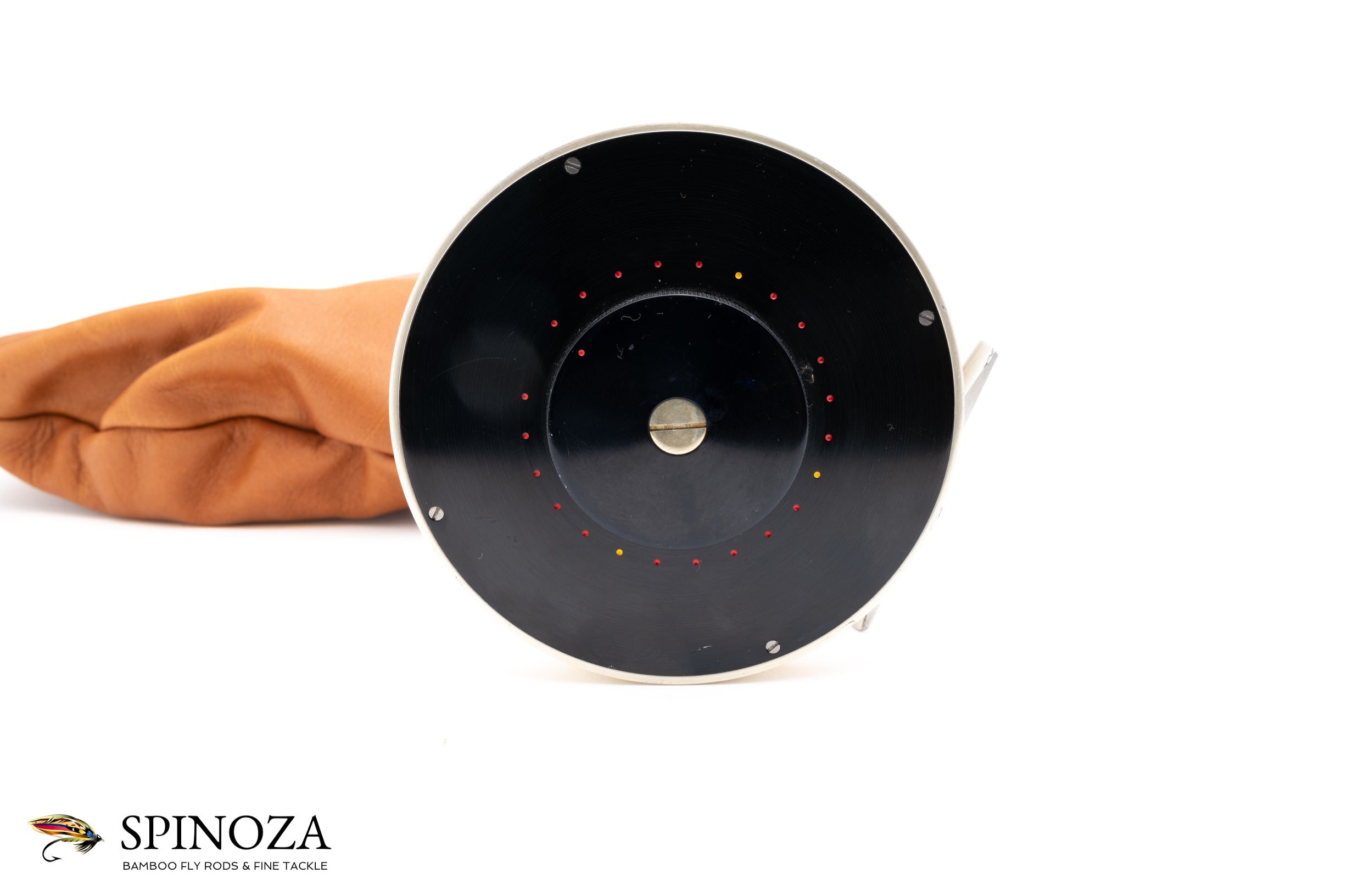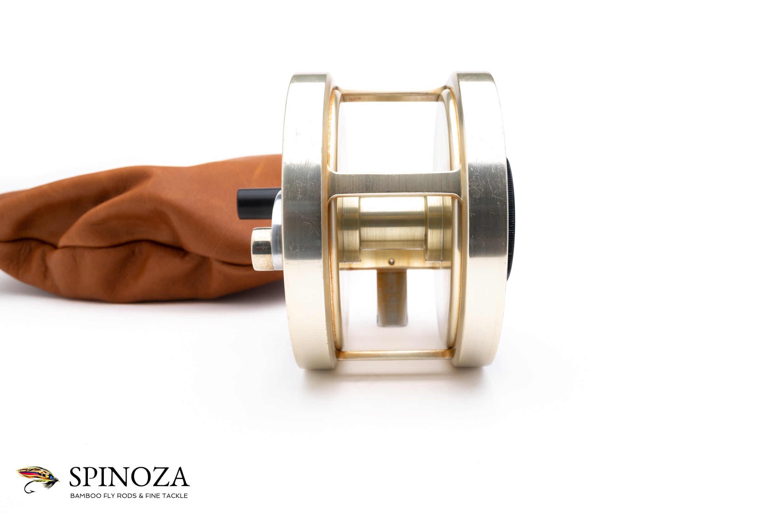 A very nice salmon reel by William Olson of Murray, Utah. 4" diameter, with an approximate 1 1/2" internal frame width. Sealed disc drag model. Serial #254. Set up for LHW. This reel is in good used condition with a moderate amount of rim rash on the frame edges but fairly clean otherwise. Very light champagne anodized frame and spool with black anodized sideplates. The foot and serpentine handle are silver anodized. Nickel silver counterweight. In a nod to the House of Hardy Cascapedia reels Olson's model has 2 nickel silver medallions inset on the crank side plate. One states "William R Olsen, Maker, Murray, Utah" and the other has the reel dimensions, owner's name, serial number (my understanding is that Mr. Olson can punch out the medallion and replace it with one for the new owner). The drag system on this reel adjusts smoothly from very light to very heavy, thanks to the sealed disc system which utilizes carbon on titanium. This reel is a 2:1 multiplier. The reel comes with an Arnie Mason leather bag. A nice opportunity here to grab a reel without the significant waiting time that Mr. Olson has generated for new reel orders.