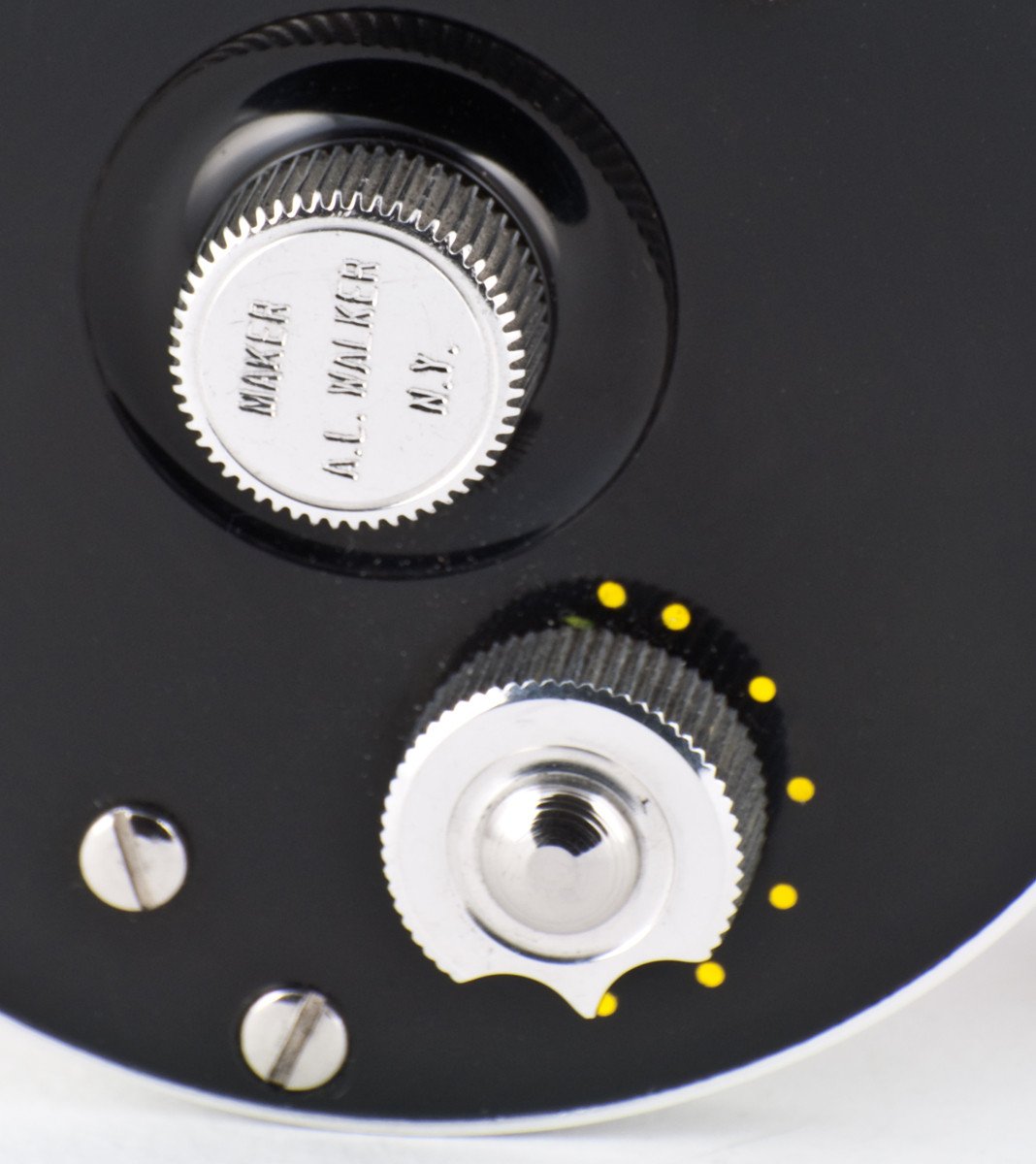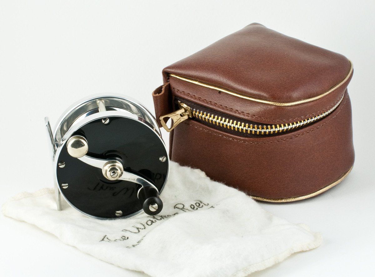 For sale here is a very scarce Arthur L. Walker fly reel. 2 3/4 inch diameter (2.80" to be precise). Spool width 15/16". The reel weighs 5 1/4 oz. Adjustable drag. Right hand retrieve. In near mint condition. The highly-buffed ebonite sideplates show some very faint surface scratches but only under extreme lighting conditions. The reel comes with its original reel bag and zippered pouch. Another super high quality reel offered through Vintage Fly Tackle. If you know of anyone looking to sell their Walker reels, please contact us.