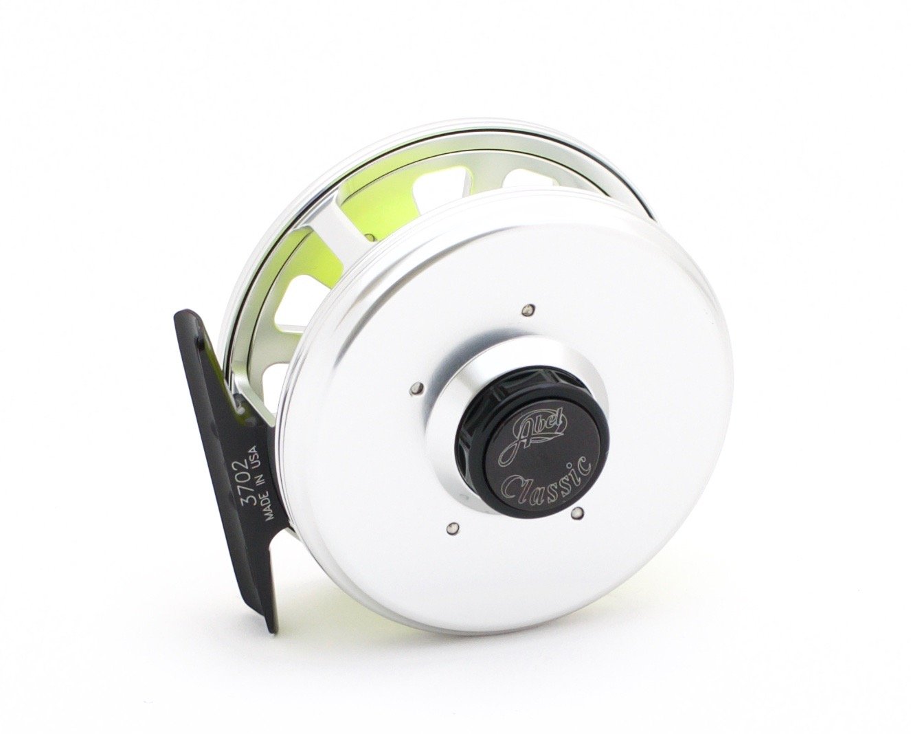 For sale here is an Abel Classic fly reel in platinum. The reel is in mint condition. Made in the USA. The adjustable click pawl drag is smooth and strong. Reel retrieve is reversible and currently set up for LHW. The reel weighs 5.9 oz. Diameter: 3.30". Spool width: 0.80". Comes with original black Abel reel case, literature, backing, and box. Serial no. 3702.