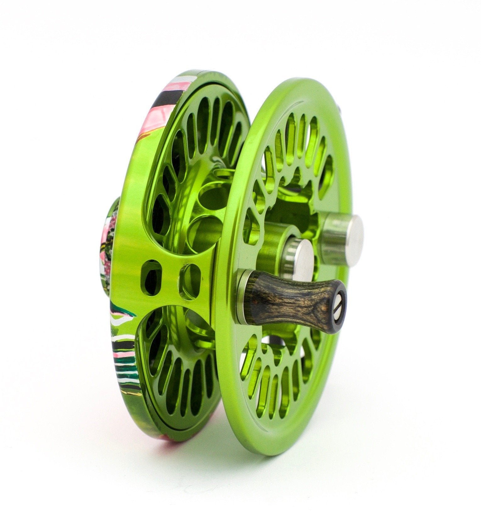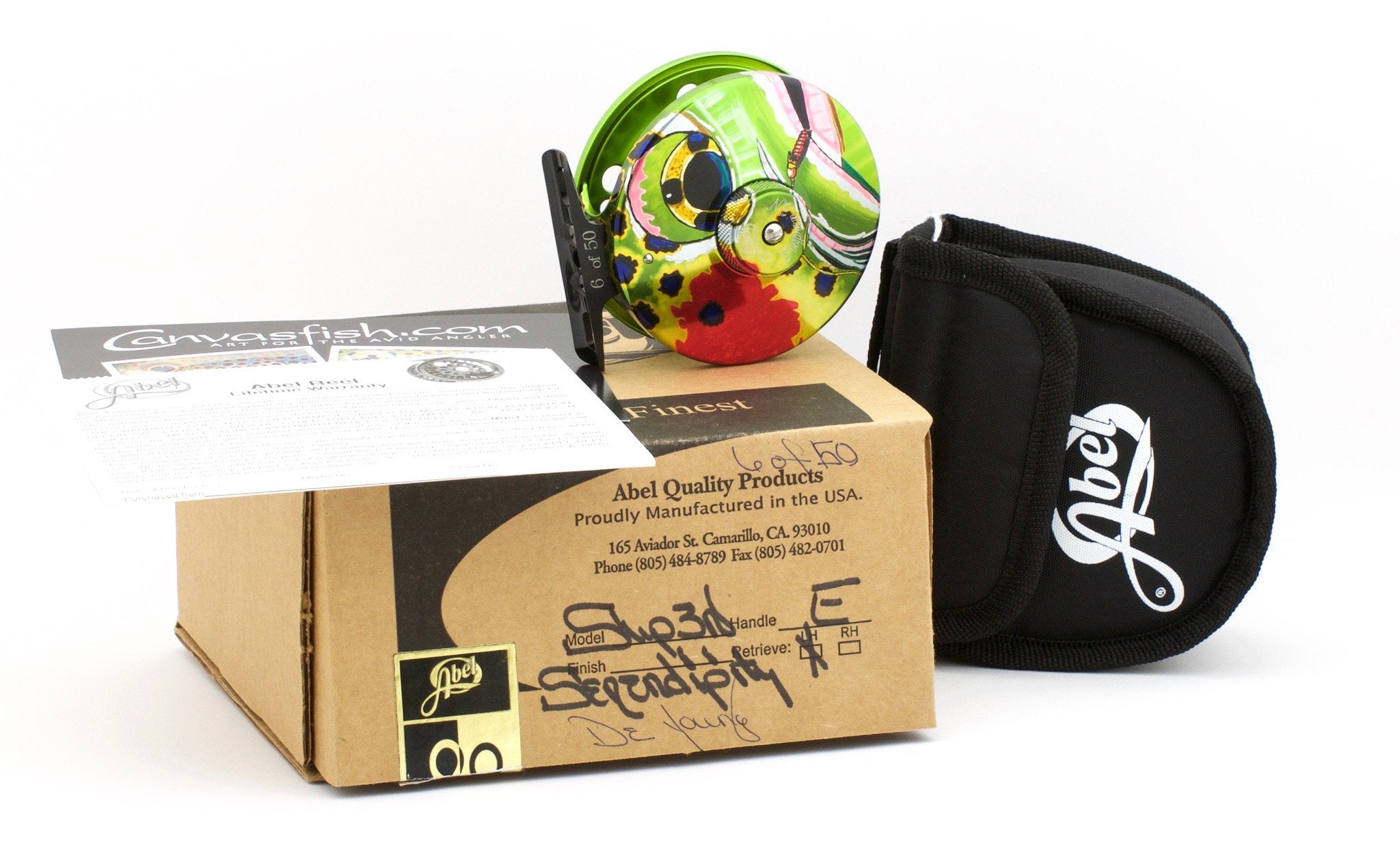 For sale here we have a limited edition, Abel - Super 3N fly reel. Number 6 of 50. The reel artwork was designed by artist Derek DeYoung, which is titled "Serendipity". The reel is in mint condition. Adjustable drag. Easily convertible from RHW to LHW. The reel is currently set-up for LHW. Large arbor for faster line pick-up. The reel diameter is 3 1/8". The spool width is .675". The reel weight is 4.2 oz. The capacity is WF3+100 20# / WF4+75 20#