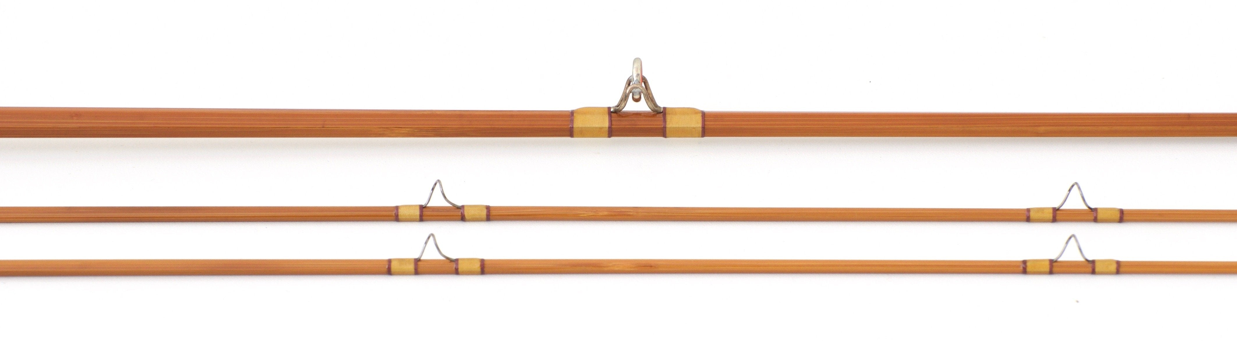 For sale here is a handsome Edwards Perfection Series bamboo rod made by Bill Abrams (Streamer) of Housatonic Rods -- 7' 2/2 for a 5 weight line. Made in 2009. Near mint condition. Moderately tempered cane with pale gold wraps and purple tipping. The second tip features a small band of gold thread below the tip-top to distinguish it from the other tip. Sculpted bakelite winding check with a rather straight tapered cigar grip. The grip shows only the lightest of handling marks. Nickel silver cap and ring reel seat over a beautifully figured wood spacer. Bakelite butt cap. The reel seat reads, "Wm Abrams RODMAKER" EW Edwards Perfection-Series" "2009". The rod weighs 3.95 oz. The ferrules are size 12/64. The fit is nice and tight. Includes original bag and labeled tube.