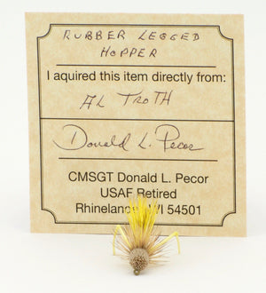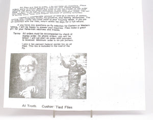 Included with the flies are information cards, plastic fly boxes, a photograph of Troth, and a copy of the original ordering conditions for flies from Troth.