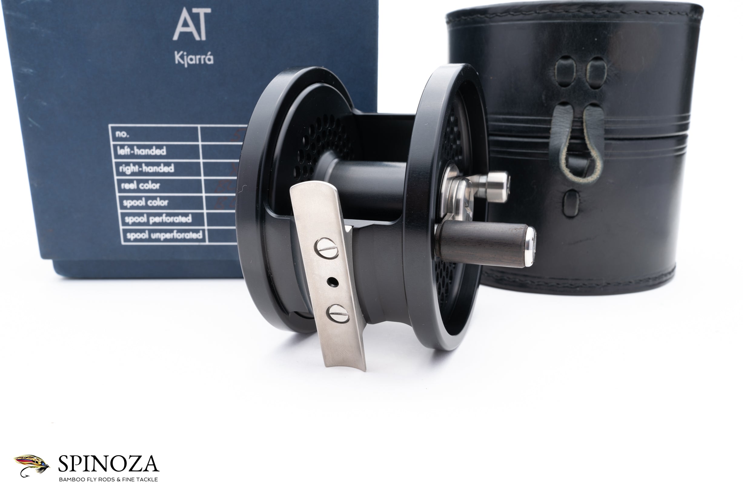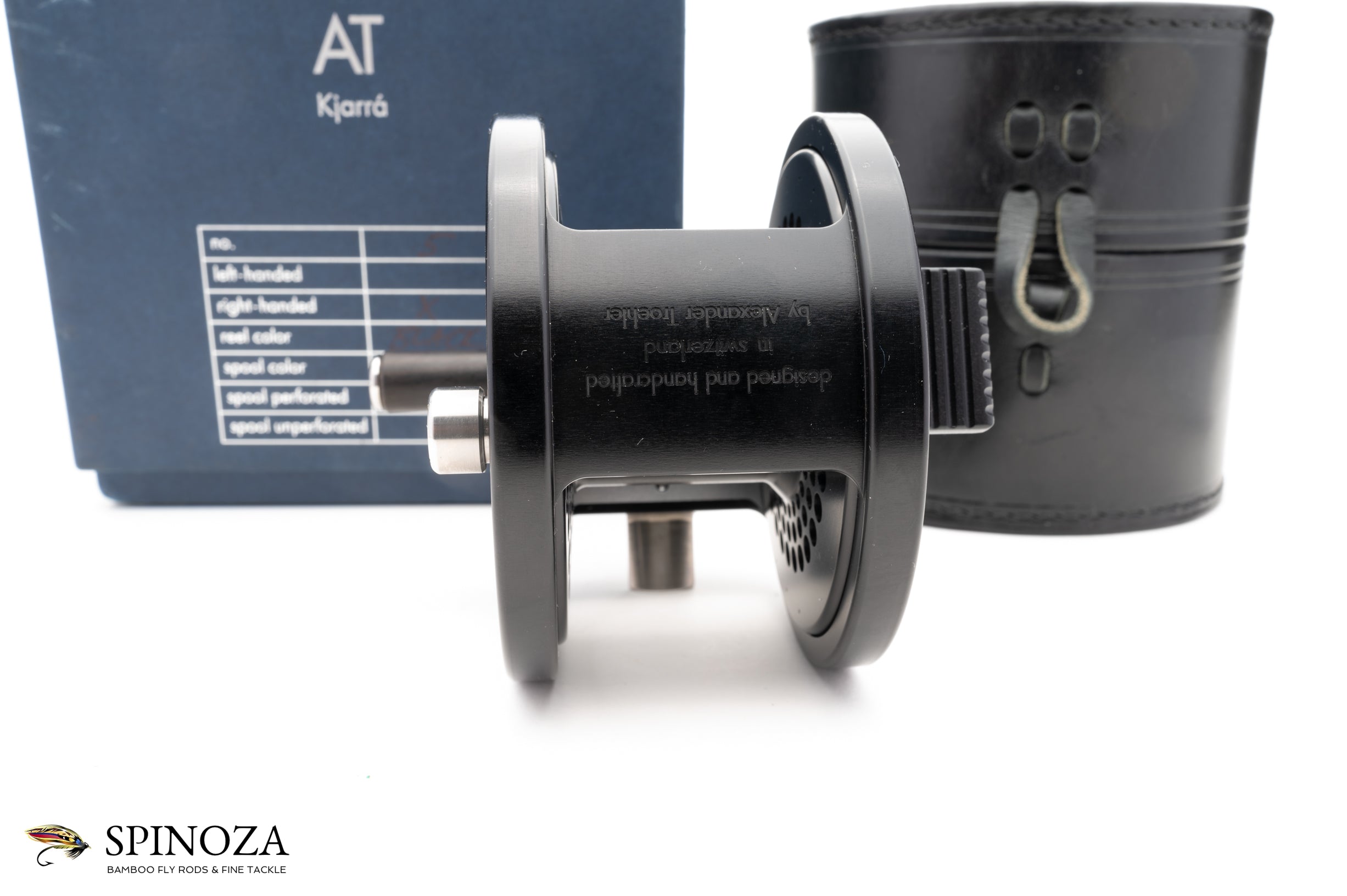 An exceptionally rare AT Kjarra #5 fly reel from Swiss maker Alexander Troehler. Set up for RHW. This reel diameter is listed at 100mm (or approximately 3 15/16") and the full width at approximately 2 1/2". It weighs 14.5 ounces on my scale. This Kjarra model was originally created for rods in the 14-18 ft range and line weights up to a #12 with capacity for 190 meters of 30lb backing. The reel is mint and unused. Precision machining is evident in this interesting classic/modern hybrid design, which has been machined from aluminum but ALTEF coated to create a protective layer that penetrates into the aluminum and gives it strong scratch and saltwater resistance. The drag is a 3-point system that is adjustable via a 16 stop dial on the faceplate. The whole reel is black except for the foot, crank, and the mounting for the drag adjuster which are silver (the drag adjuster itself is black). Ventilated spool. "AT Kjarra No. 5" has been lightly engraved into the faceplate and "Designed and Crafted in Switzerland by Alexander Troehler" into the exterior of the frame cross-section. The reel comes in a handsome circular leather case and box with model details noted on the outside. A very interesting and unusual reel, I believe these were once sold through Thomas and Thomas, and I have come across very few of them.