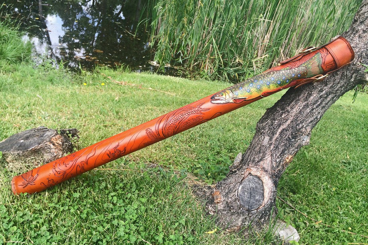 For sale here is an exquisitely-crafted leather combination rod & reel case by leather artist, Annie Margarita. Please contact me to order yours!