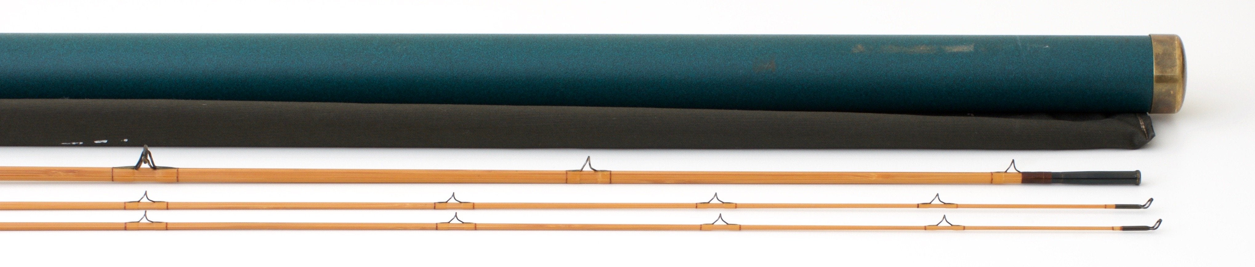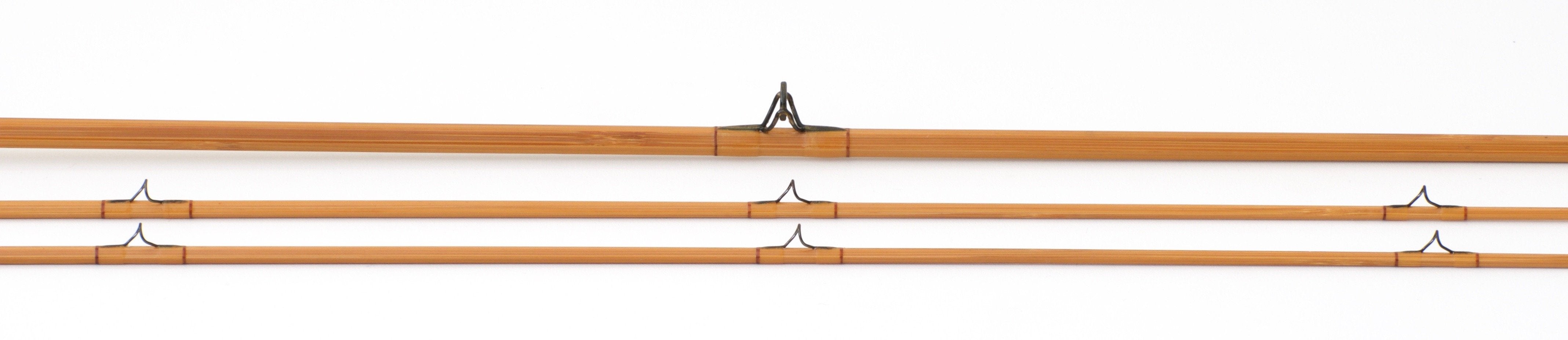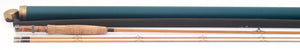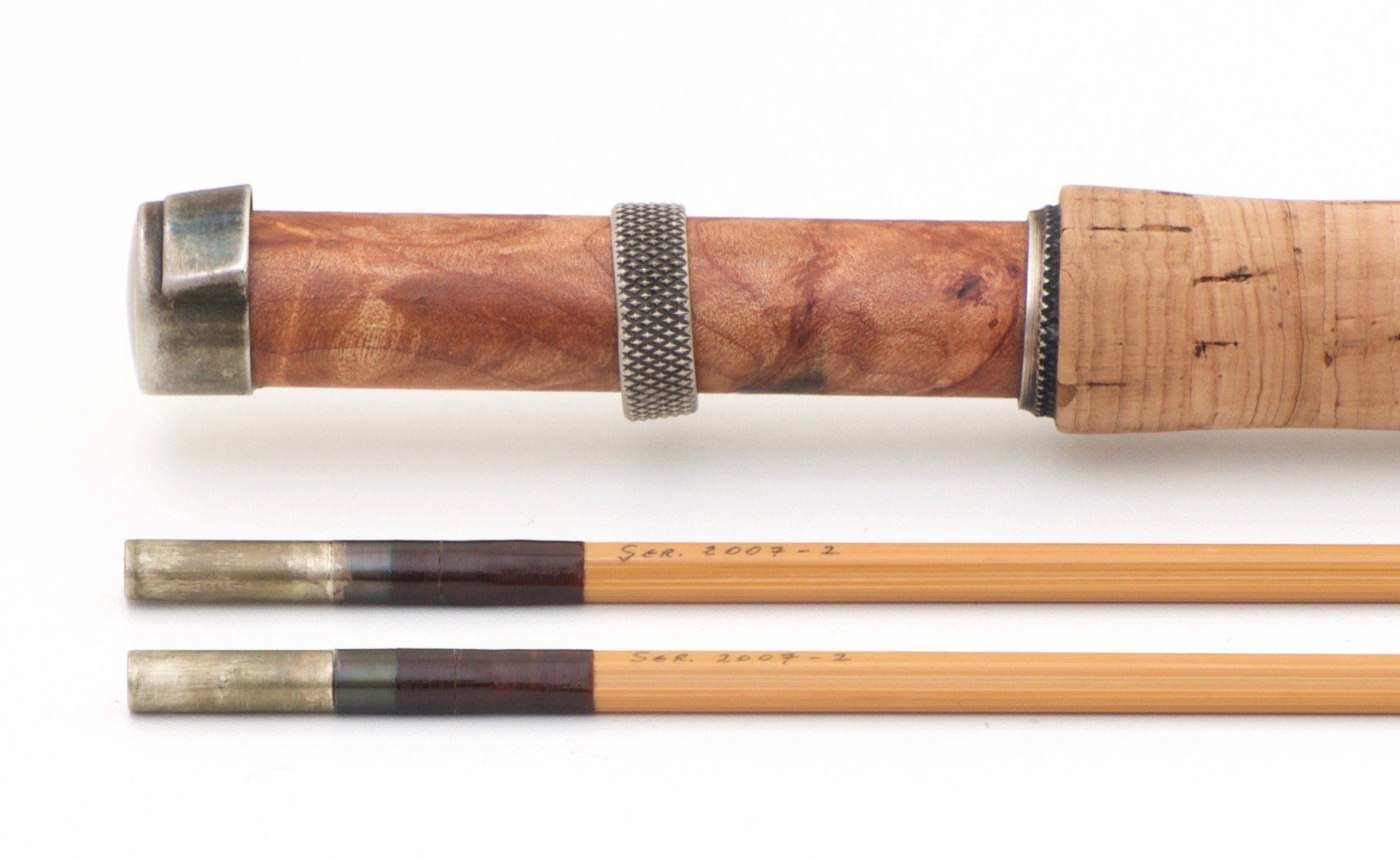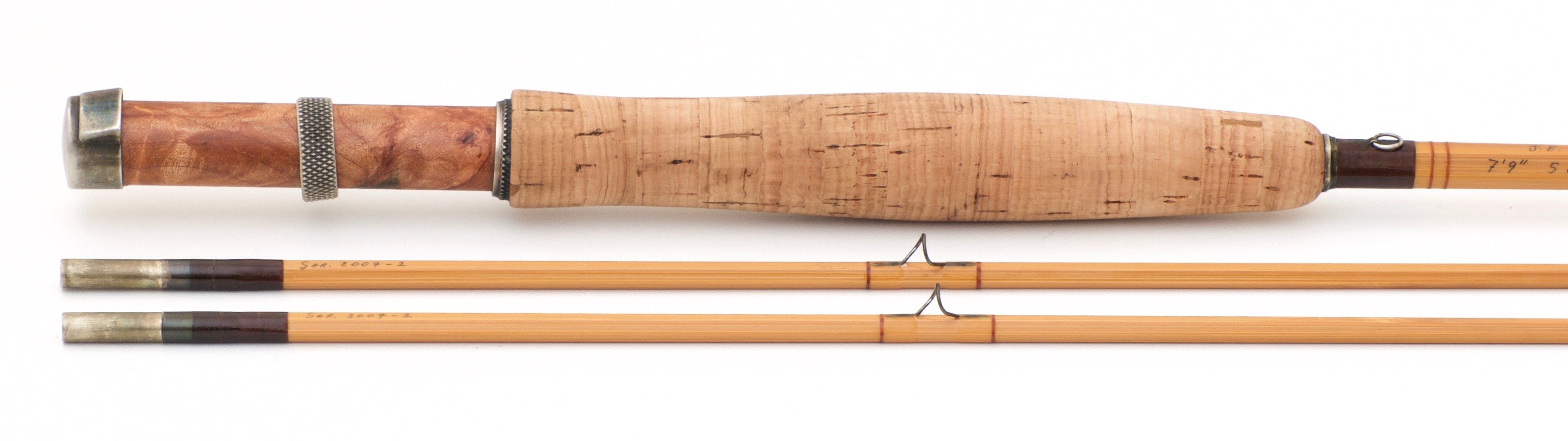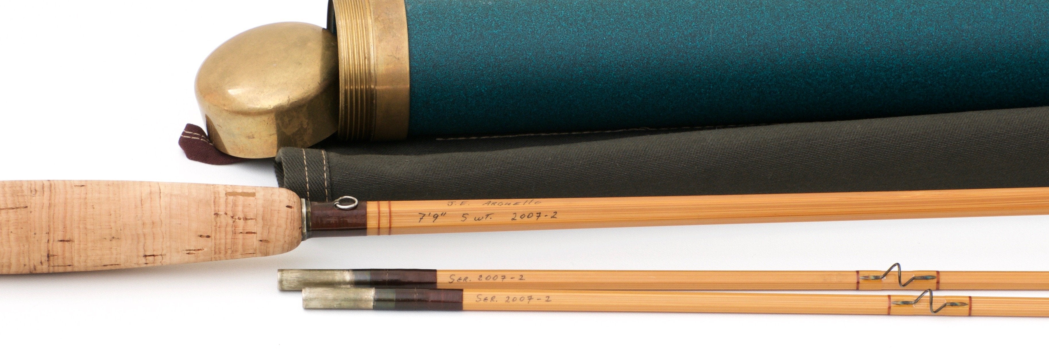 For sale here is a rod from the bench of Joe Arguello, a 7'9" 2/2 5wt. Serial no. 2007-2. The rod is in excellent condition. All sections are full length with a slight set in the butt and one of the tips. Transparent honey colored wraps and chocolate tipping. Hexagonal nickel silver winding check. Ring hook keeper. Reverse half-wells grip 6 1/2" in length with mild soiling. Blued nickel silver cap and ring reel seat over a beautifully figured burl wood spacer. Much of the bluing has worn off the butt cap leaving a nice patina. The Swiss-style ferrules are size 13/64 with an excellent fit. The rod weighs 4.35 oz. Medium fast action. Includes original bag and green powder coated tube and brass fittings.