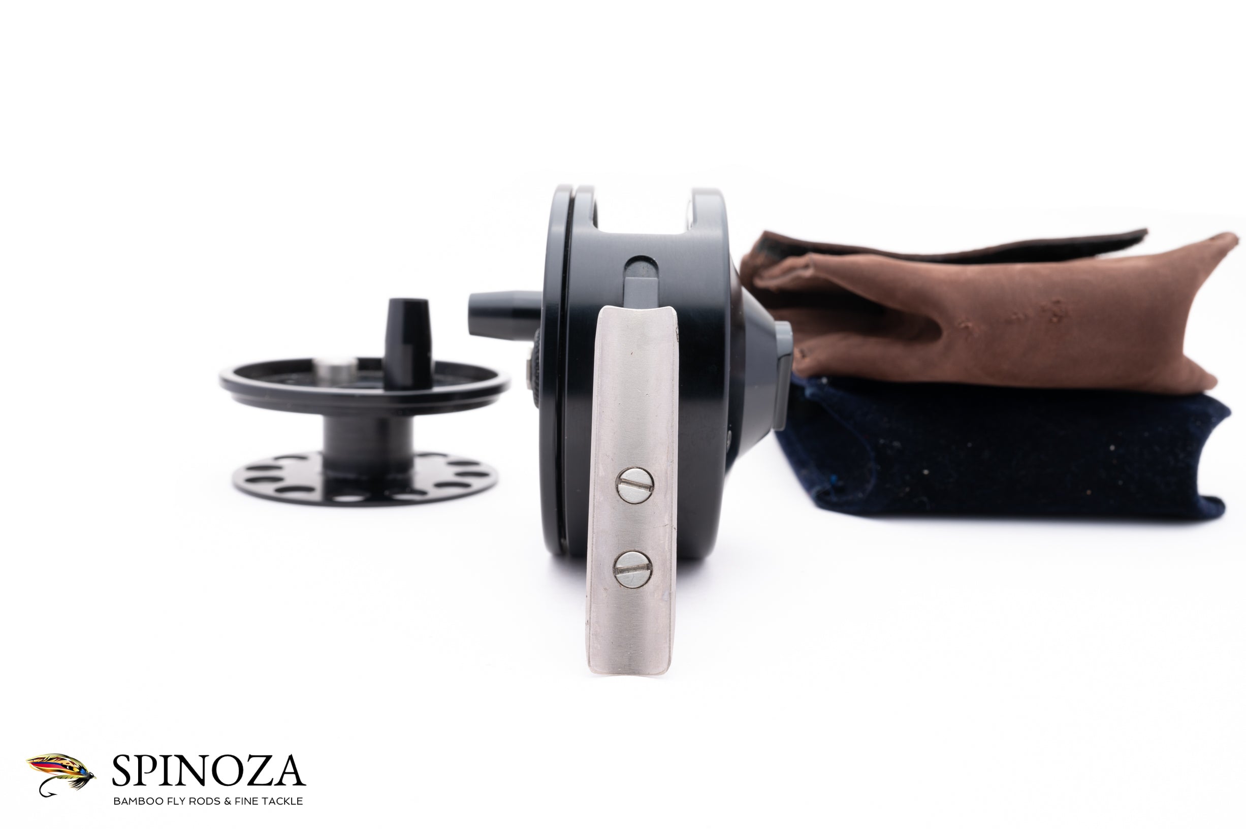 A superb Ari 't Hart Aras fly reel with a spare spool, 2.91" diameter and set up for LHW. Made in Holland. All-black color. The reel weighs 5.6 ounces on my scale. Near mint condition with one nick on the frame edge and a few tiny mounting marks on the reel foot, but very clean overall. It couldn't have been fished much at all. Black anodized throughout. Bi-directional clicker with strong adjustable disc drag. Designed to hold lines from #5-7 with capacity for up to 90 yards of 20 pound backing. The reel and spare spool both pack into separate ATH pouches (one leather one synthetic). An iconic Ari Hart design!