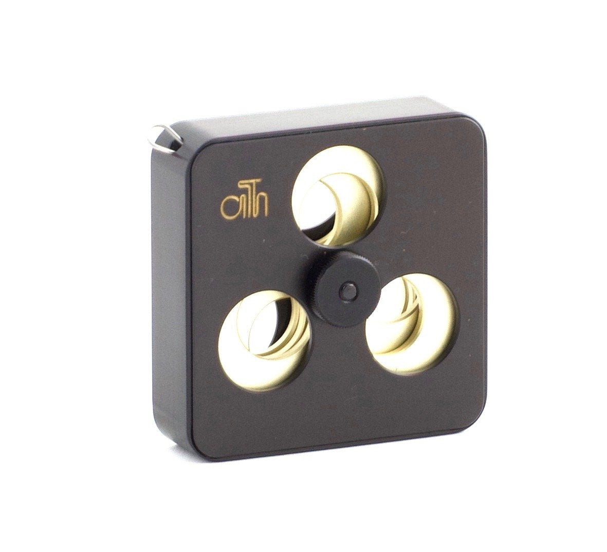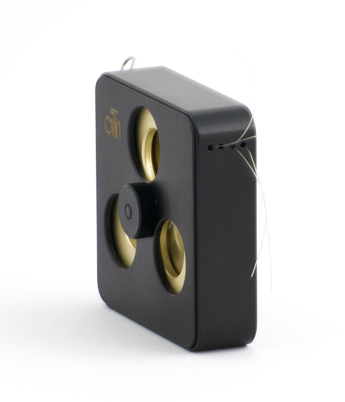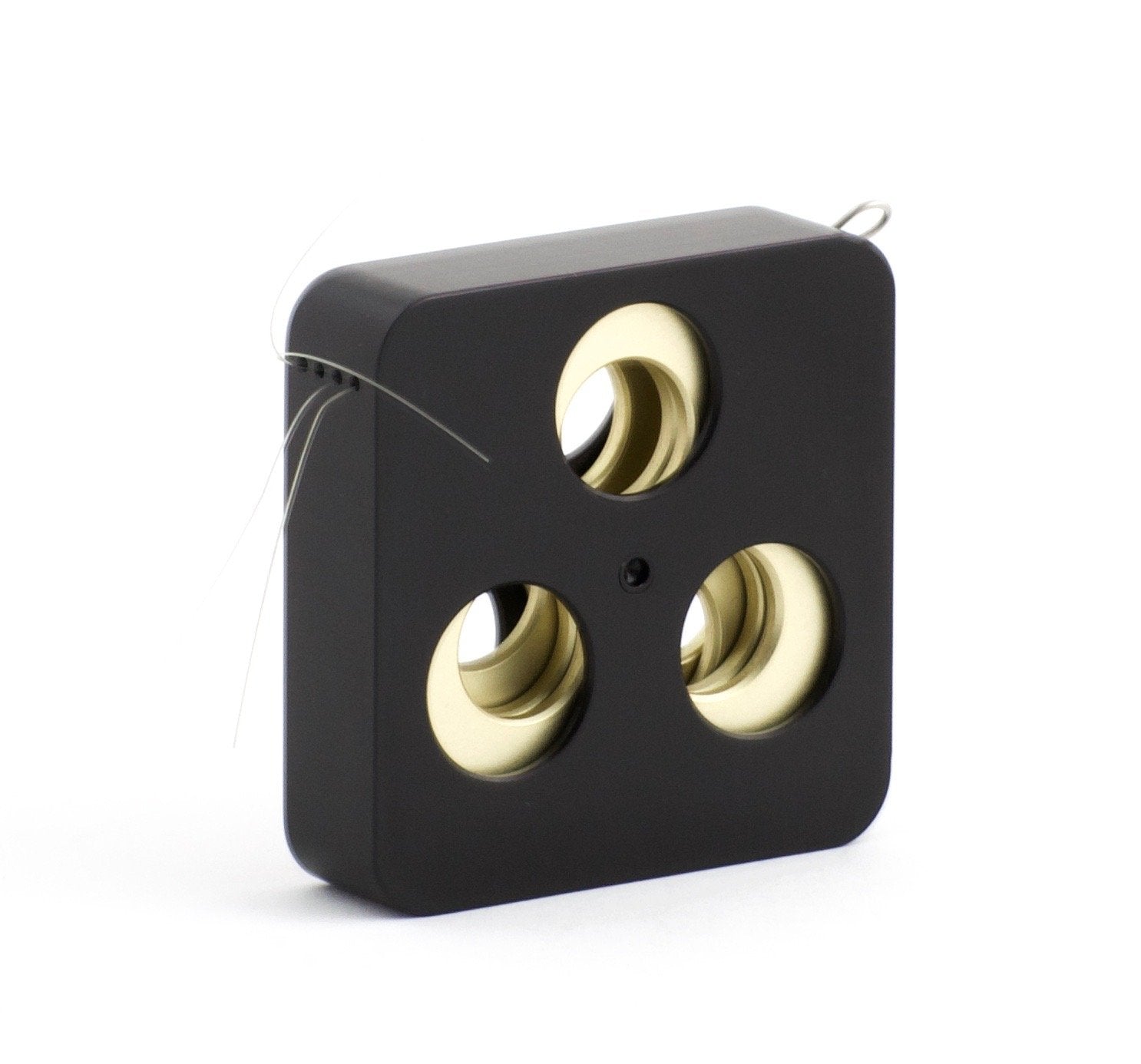 For sale here is a rare Ari 't Hart tippet dispenser. Near mint condition. The dispenser is composed of four gold anodized alloy spools housed inside an alloy box. The spools have a vinyl washer between them for smooth operation. The dispensing holes have a rubber gasket to provide a bit of resistance to prevent the spool from unraveling. A simple yet clever design, as is the case with many of Mr. Hart's products. The dispenser measures 2 3/4" x 2 3/4" x 13/16". There is a swiveling loop at the corner to attach the dispenser to a vest or bag. Don't miss out on this rarely square version of the ATH tippet dispenser. Includes original blue felt pouch with ATH logo.