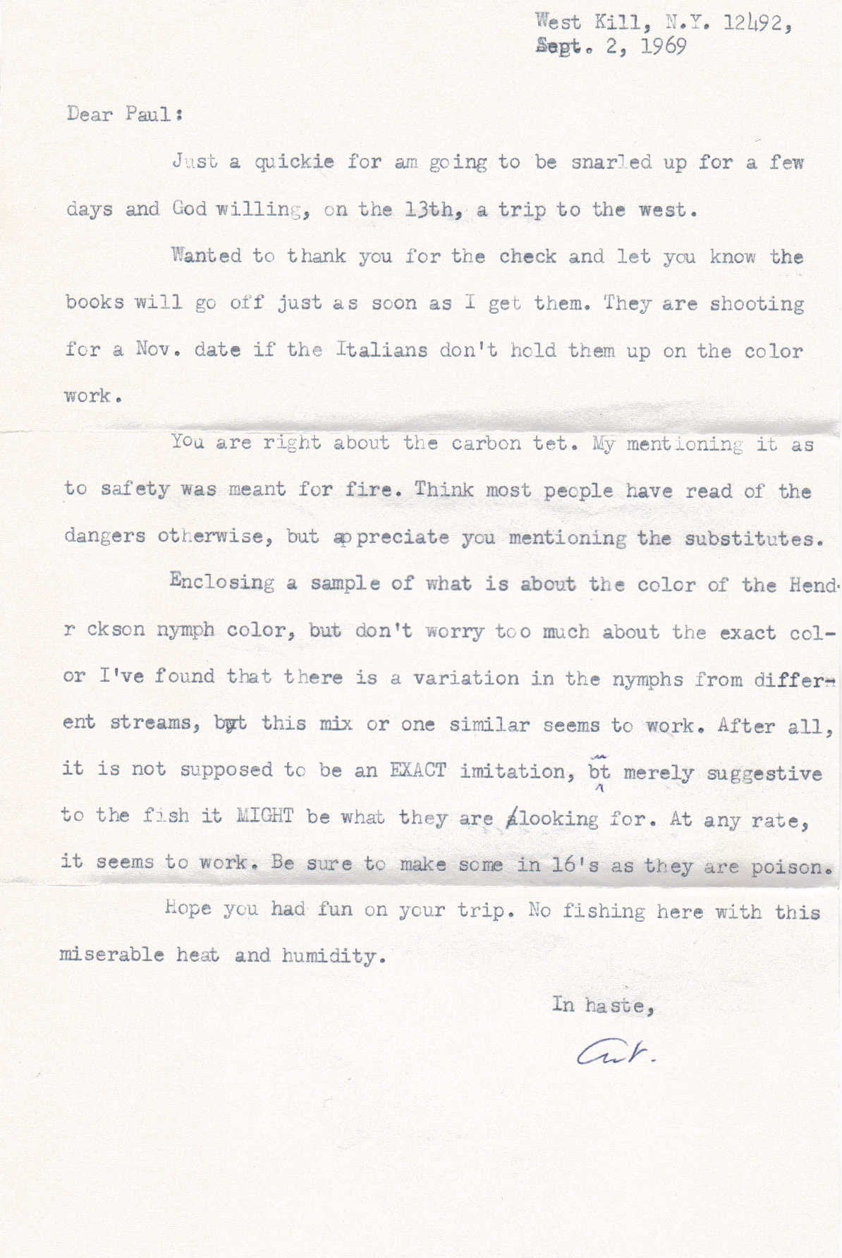 I have other letters from Art to Paul that I will share copies of with the buyer. In a letter written a month earlier than the one for sale here, Art explains "The Hendrickson nymph is really tops and recommend you try some in 16's and 18's. It and the March Brown are two of my nymphs that I'm really proud of, but will admit I don't fish them much as I don't like nymph fishing even though it is the smart way to fish. Fortunately, I fish enough that I can fish as I please and it sure pleases me to see those rascals come up to a dry."
